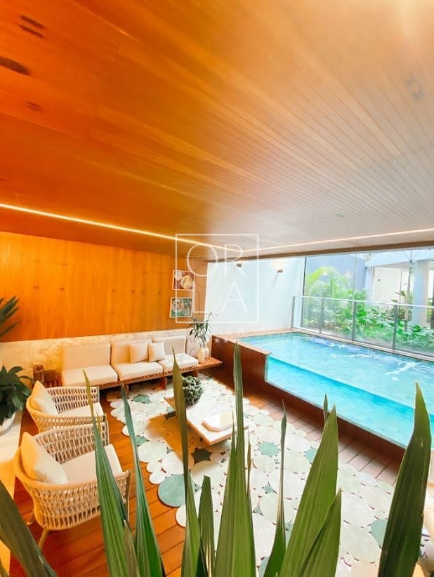 A integração entre a sala de estar e jantar confere um ambiente acolhedor e contemporâneo, enquanto a varanda, equipada com churrasqueira e piscina privativa, é um convite para desfrutar de momentos inesquecíveis em família.