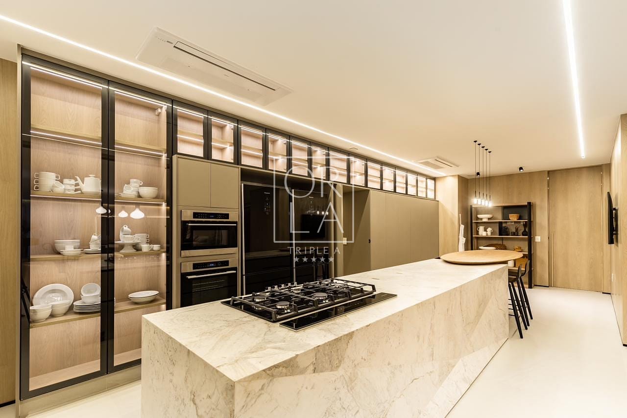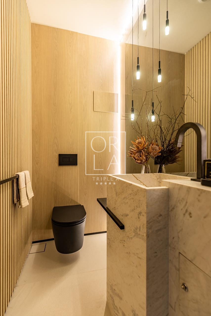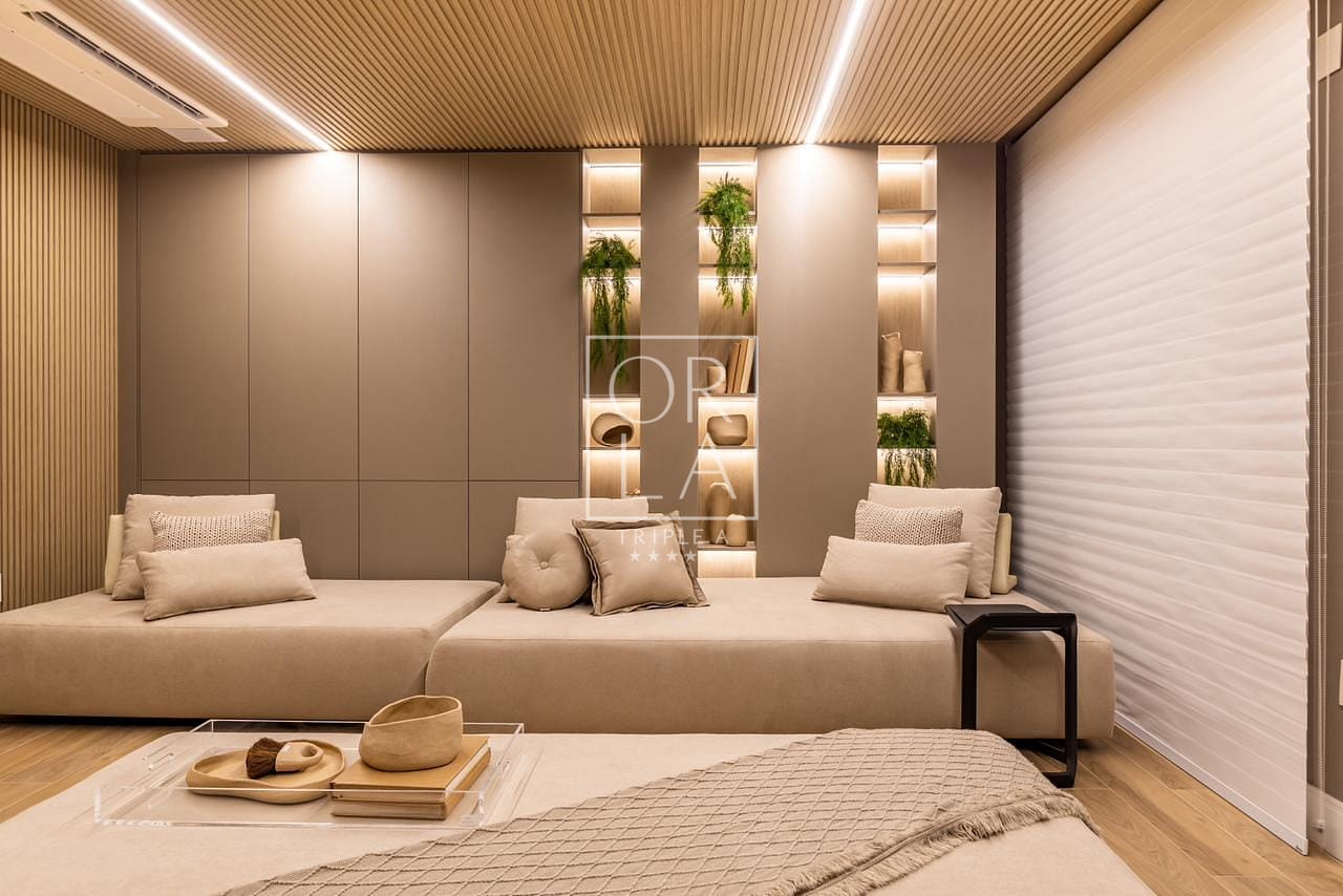 O sistema de sonorização na sala de banho, com módulos amplificadores de áudio e Bluetooth embutidos no forro, adiciona um toque de luxo. A planta flexível, sem pilares e vigas aparentes, permite diversas possibilidades de layouts e usos.
