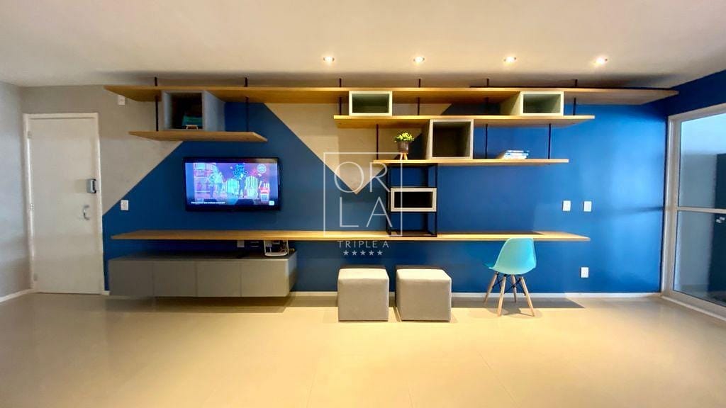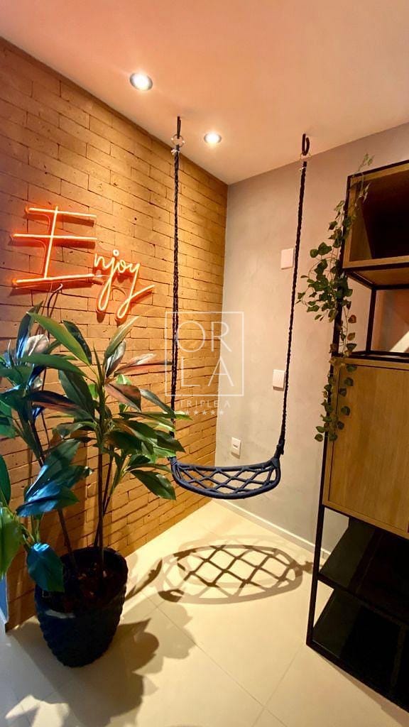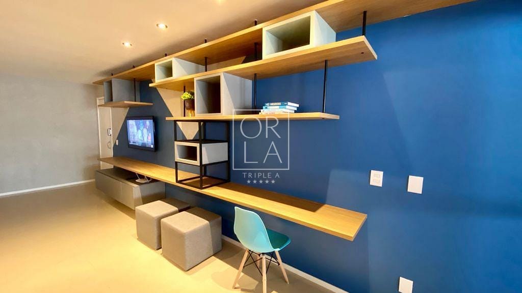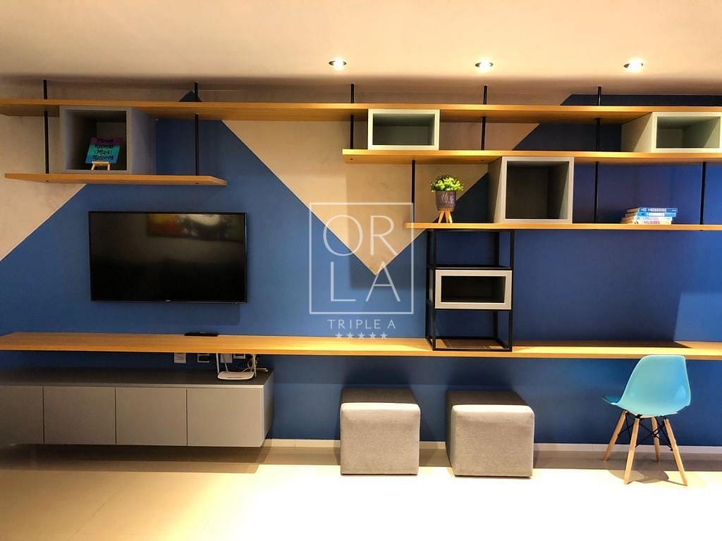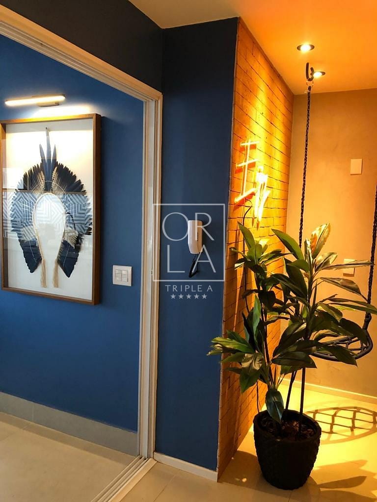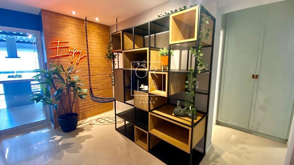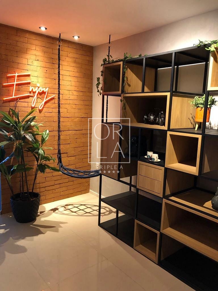 Ampla sala de 2 ambientes, sala de TV com sofá e puf’s, espaço de escritório, estantes e espaço decorado com luminária em LED e balanço decorativo. Apartamento rico em armários de primeira qualidade, projeto de interiores e marcenaria projetada especialmente para o imóvel.