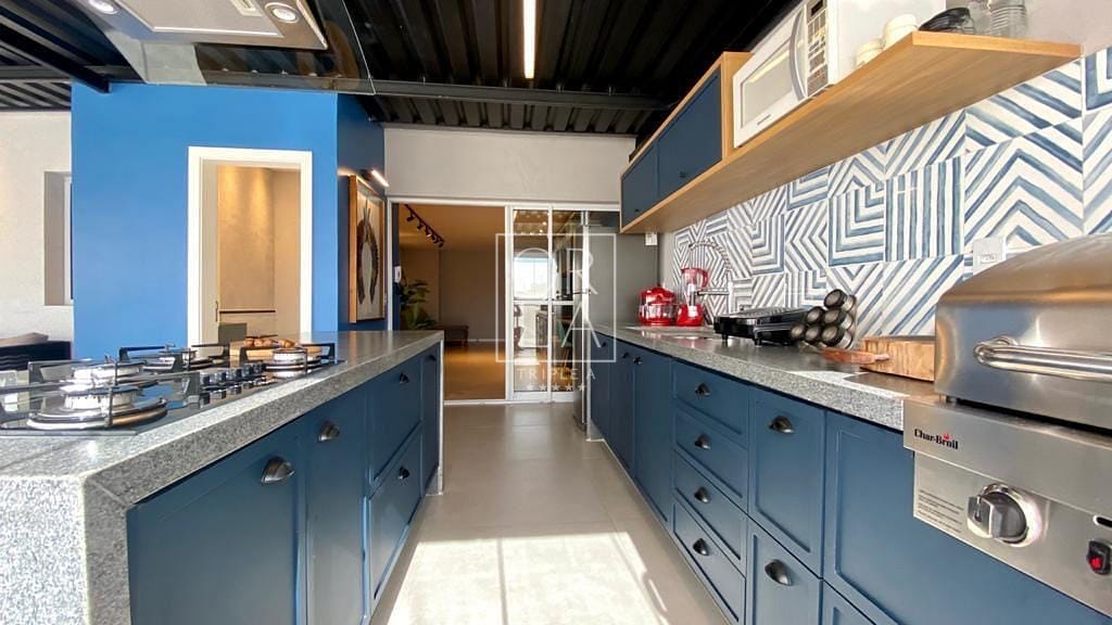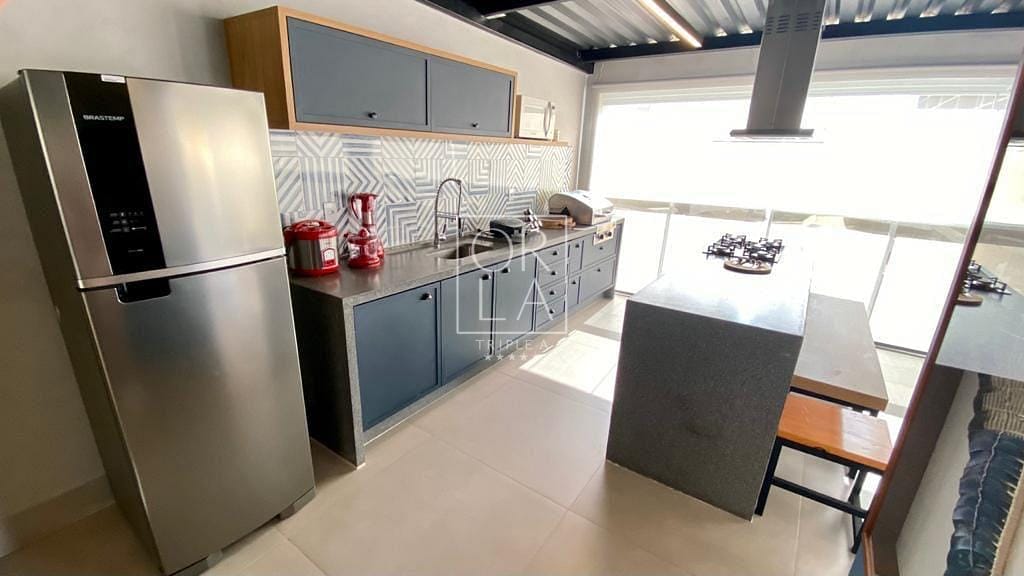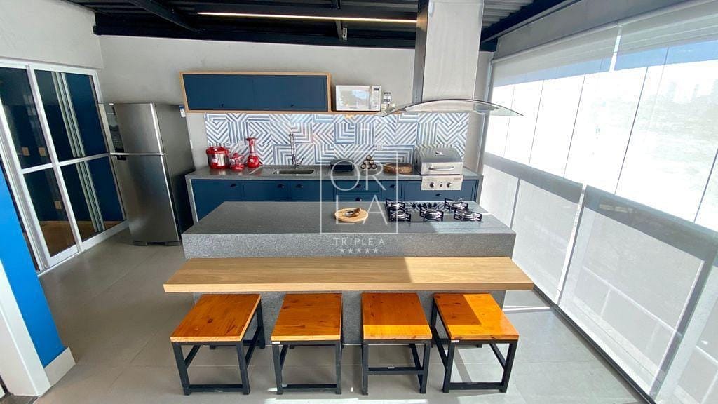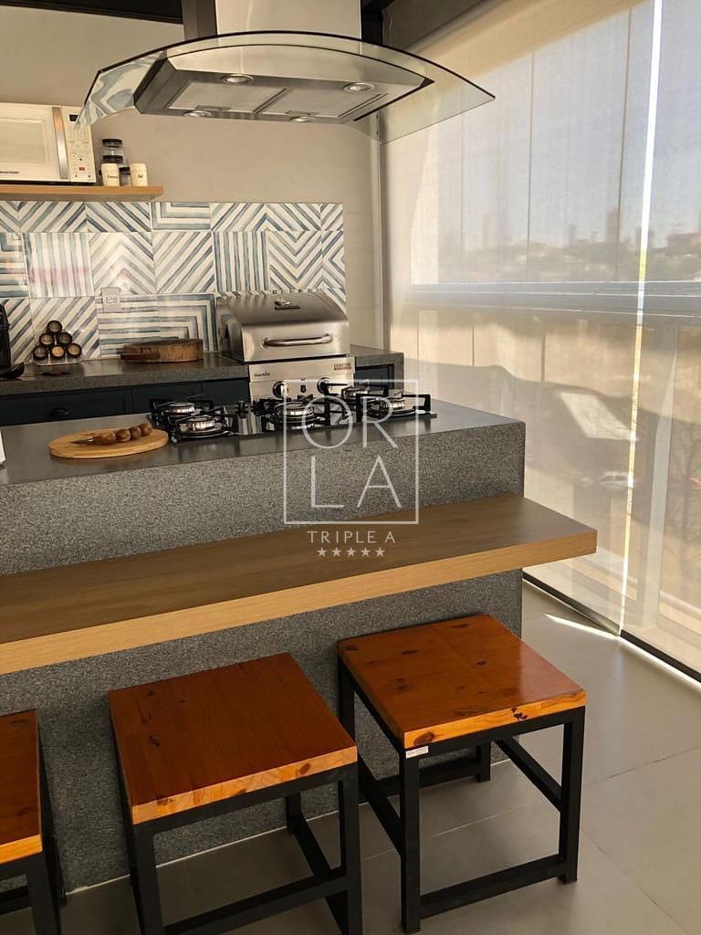 Varanda Gourmet totalmente coberta e climatizada, cozinha com ilha em pedra de mármore com fogão cooktop e coifa.