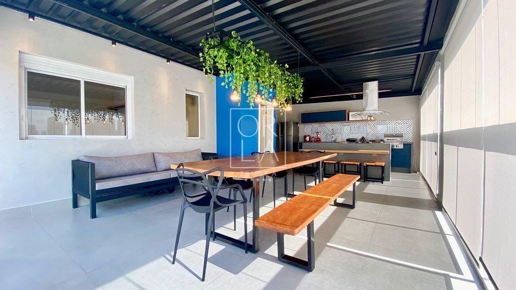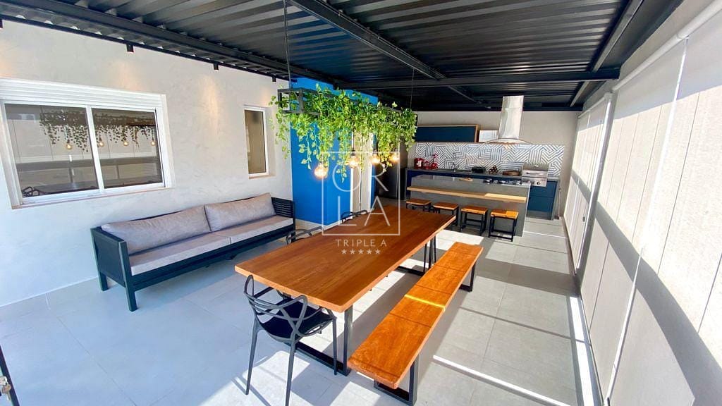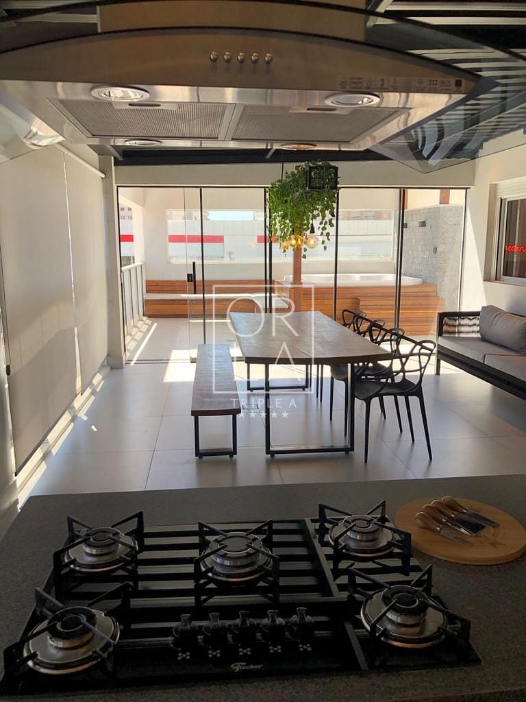 Churrasqueira privativa Char Broil à gás (apenas 2 unidades no condomínio possuem churrasqueira privativa), Mesa de jantar para 10 lugares em madeira maciça.