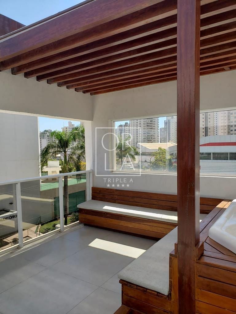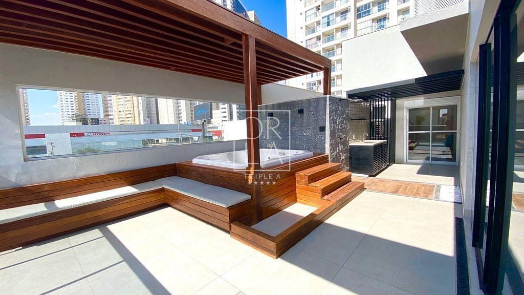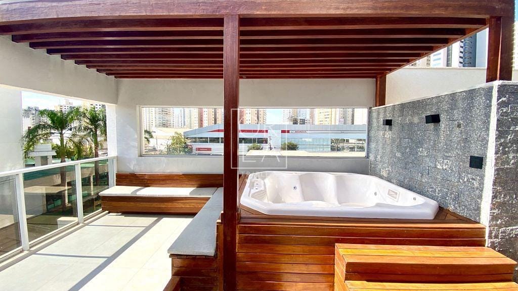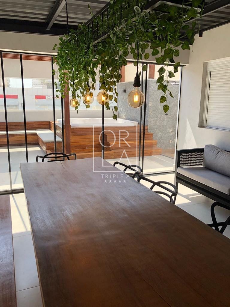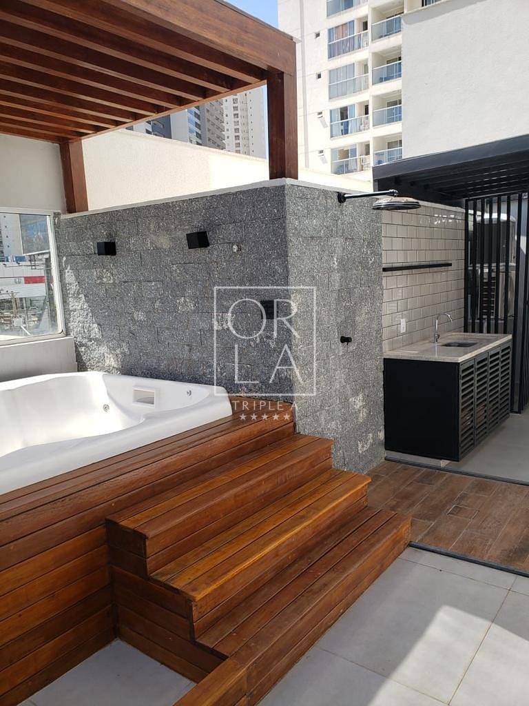 Na área Garden do apartamento possui uma Jacuzzi de 6 lugares, pergolado de madeira que cobre a Jacuzzi e também uma área de descanso com estofados para 8 pessoas.