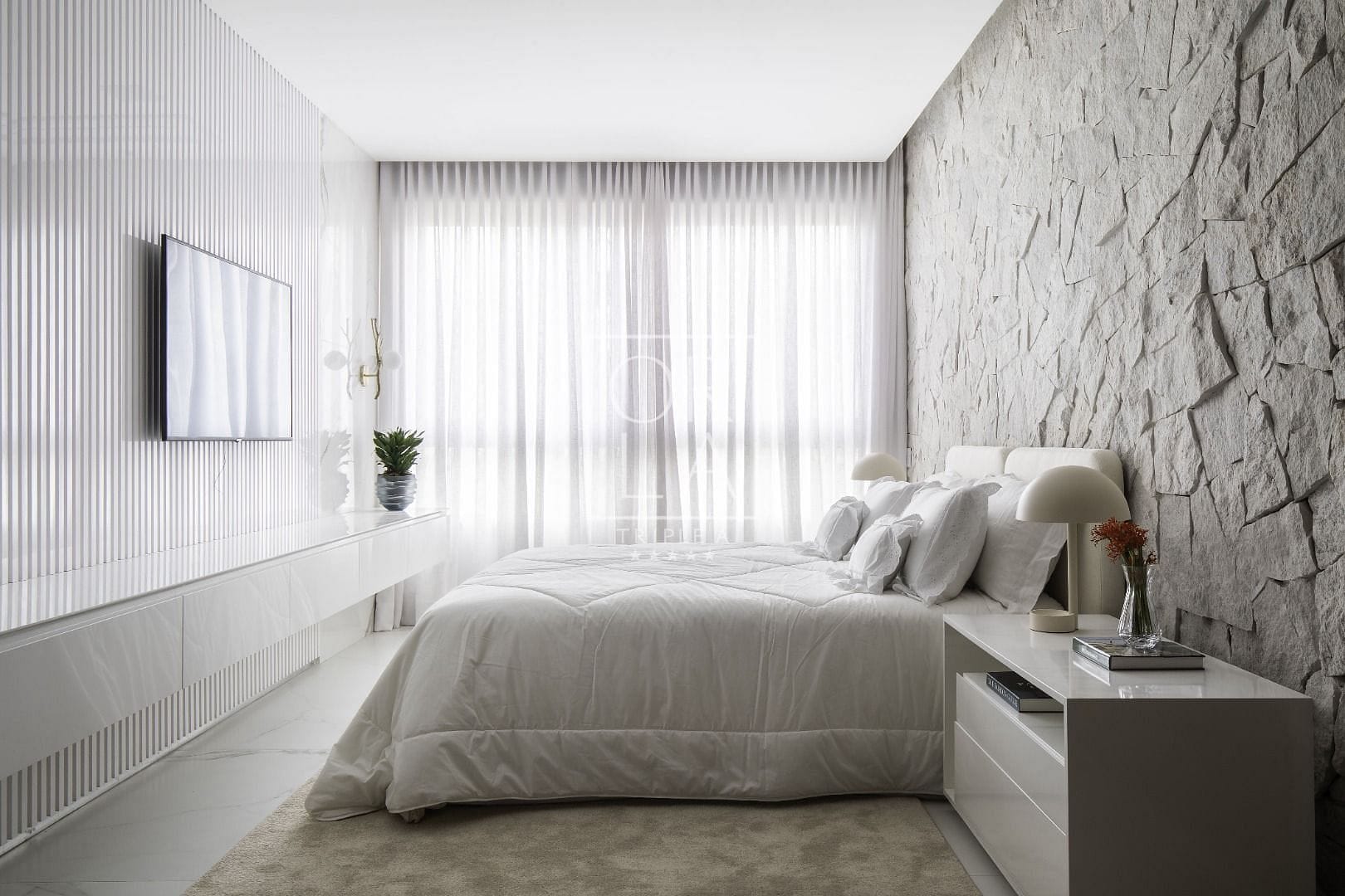 A suíte do casal se destaca com closet e sala de banho separados, oferecendo ambientes exclusivos para o Sr. e a Sra. O conceito Open Living é evidente, integrando o espaço de estar/jantar, varanda gourmet e piscina.