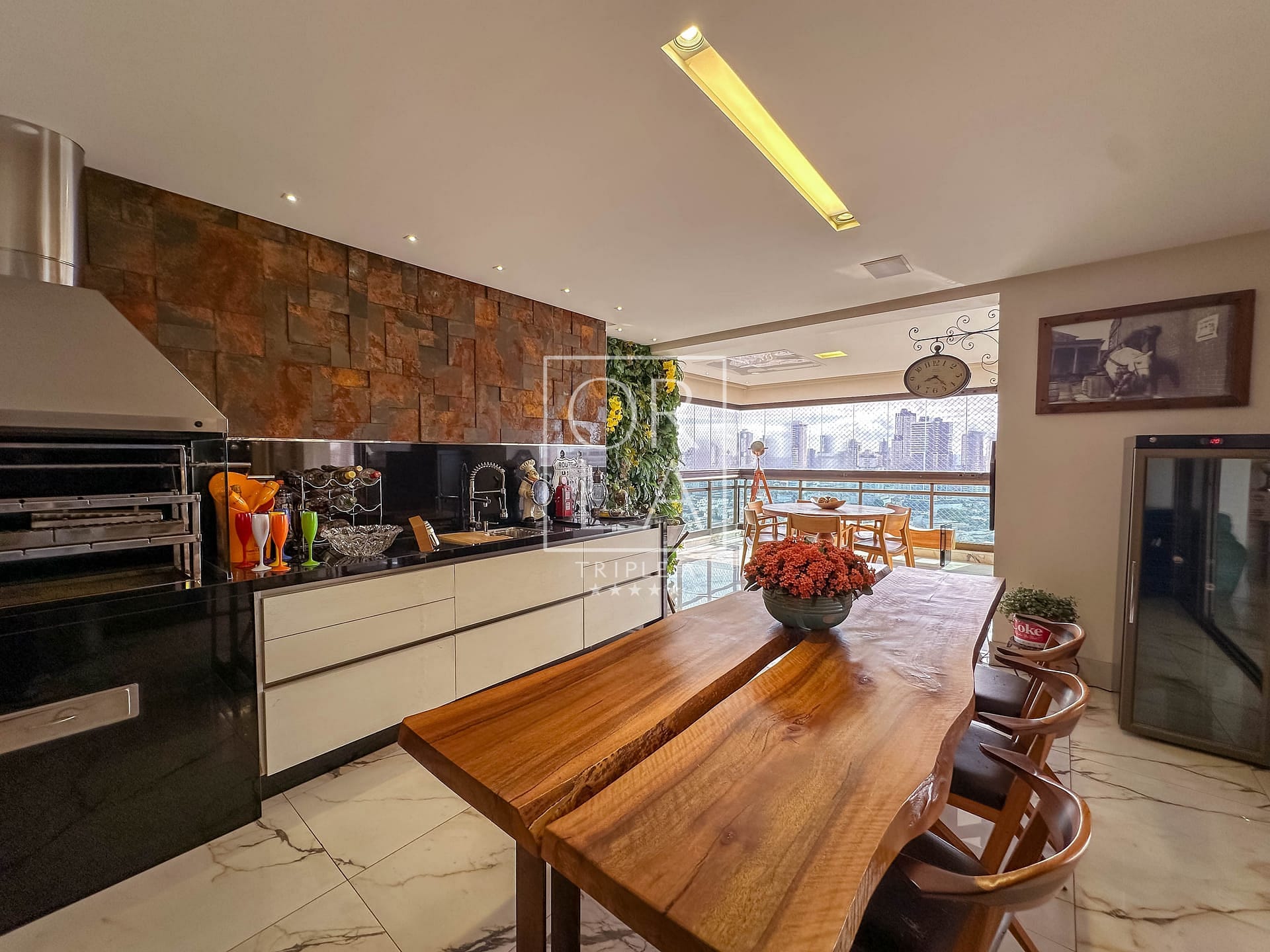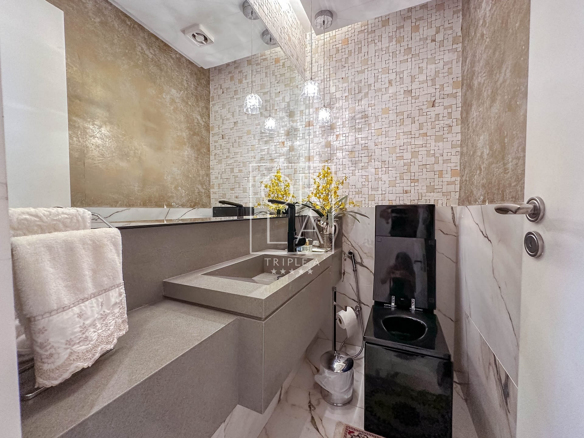 O apartamento será entregue mobiliado, com móveis planejados de alto padrão e decoração pensada nos mínimos detalhes.