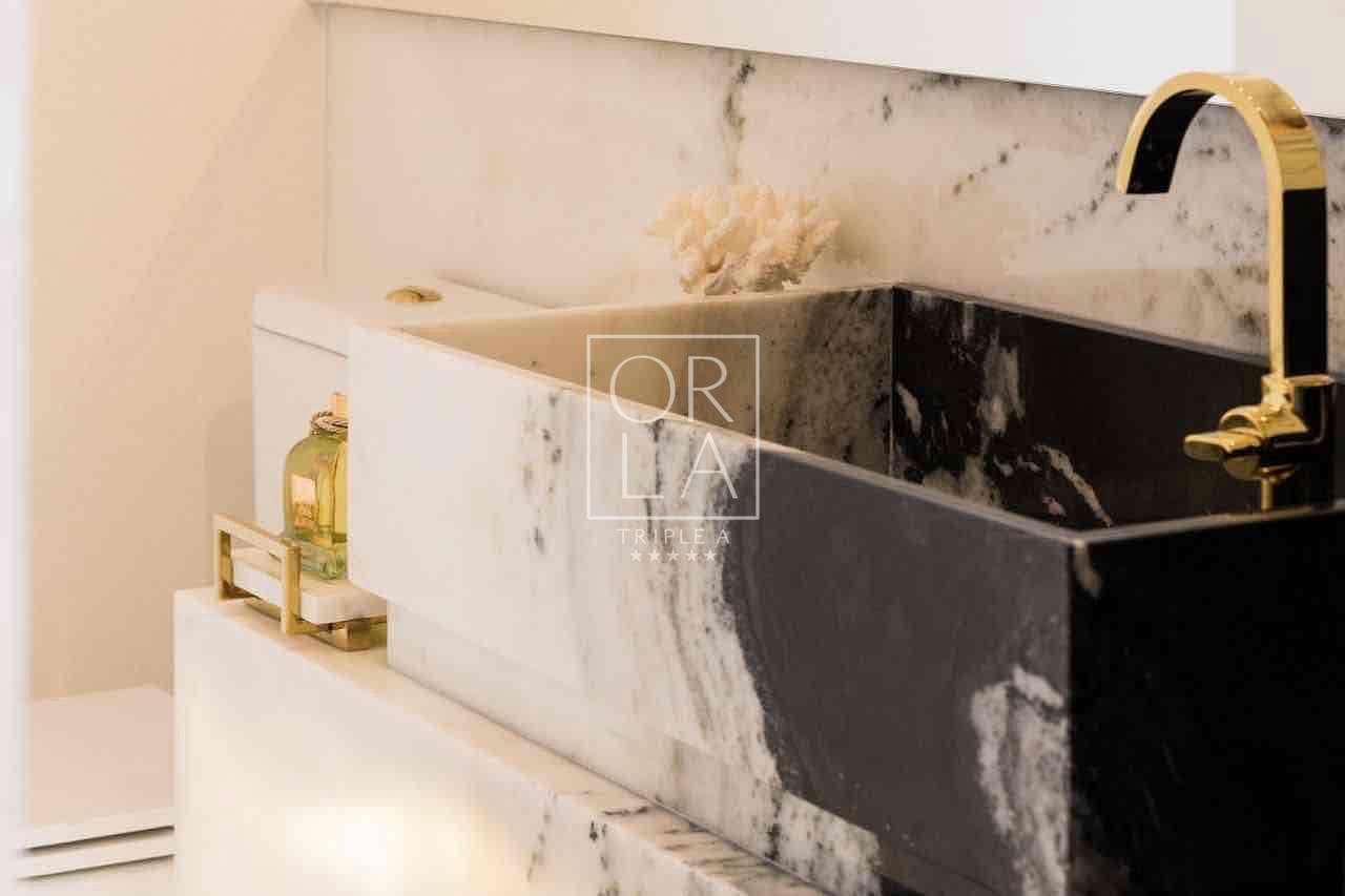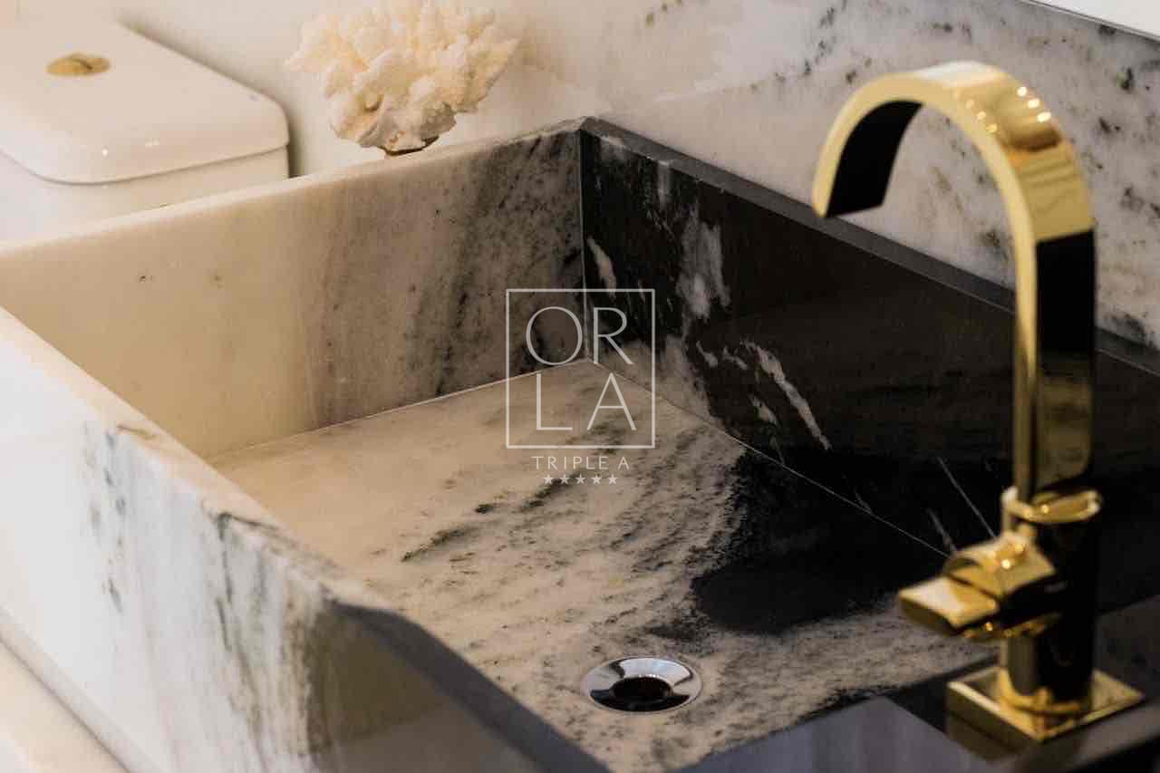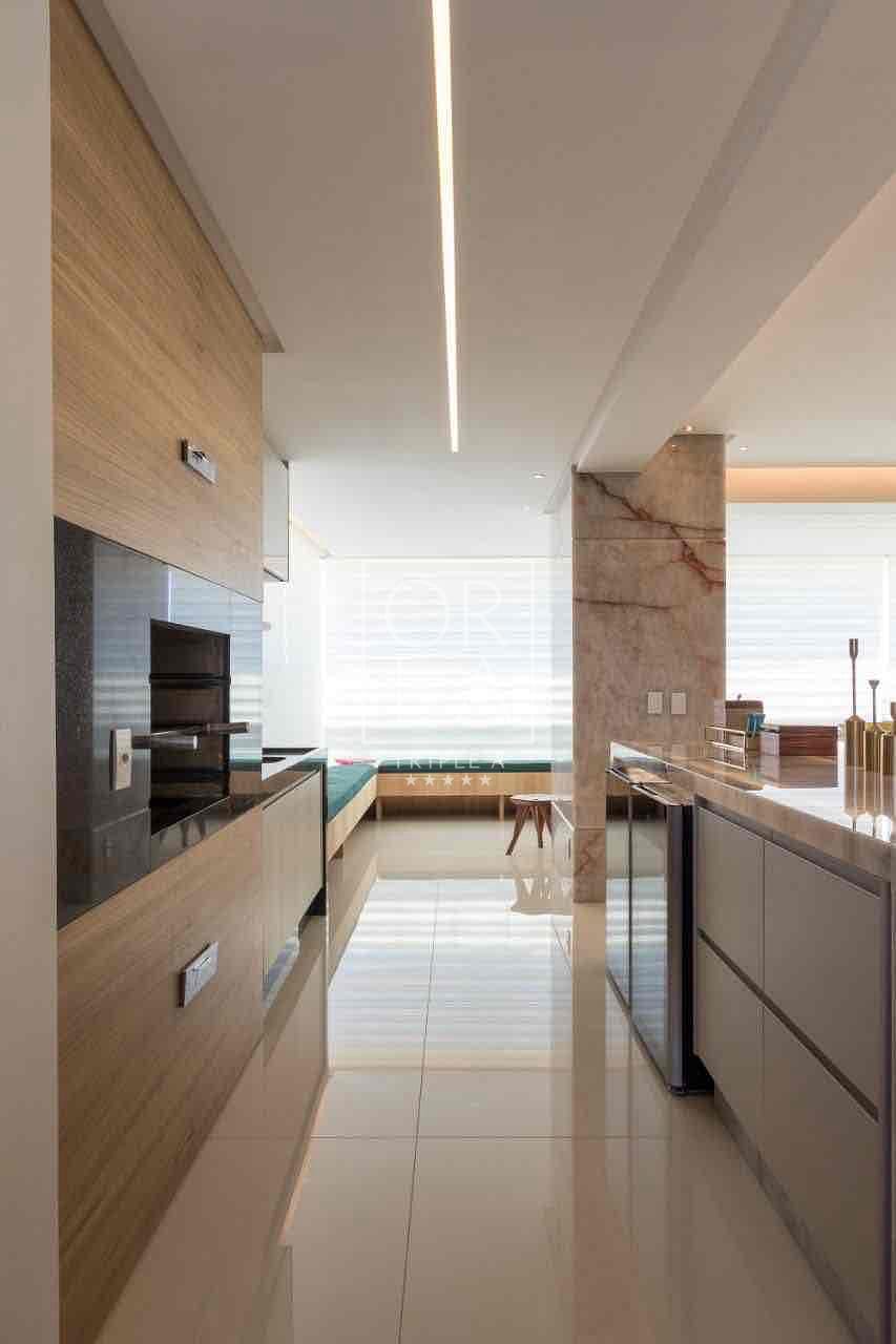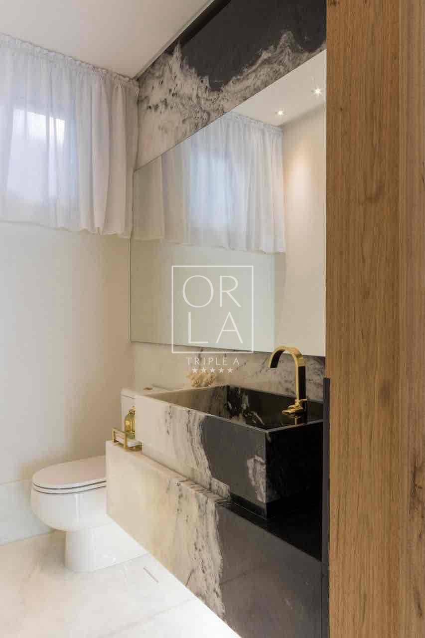 O mobiliário é da Armazém, os armários da Finart, pedras da Marmoraria Gruta, iluminação da Interpan e automação Infinity Áudio e Vídeo — uma curadoria que traduz qualidade sem precisar anunciar.