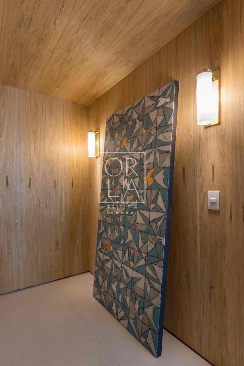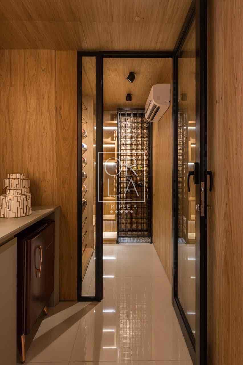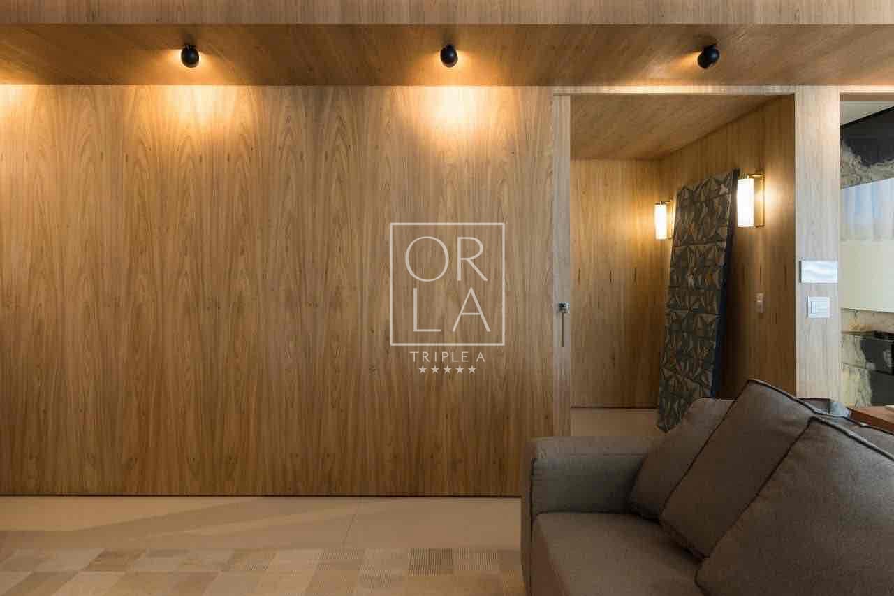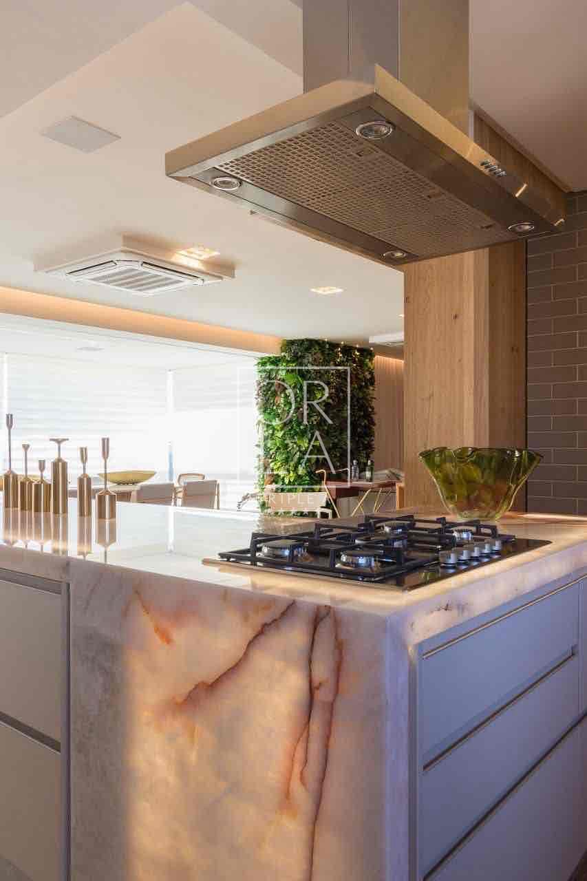 O mobiliário é da Armazém, os armários da Finart, pedras da Marmoraria Gruta, iluminação da Interpan e automação Infinity Áudio e Vídeo — uma curadoria que traduz qualidade sem precisar anunciar.
