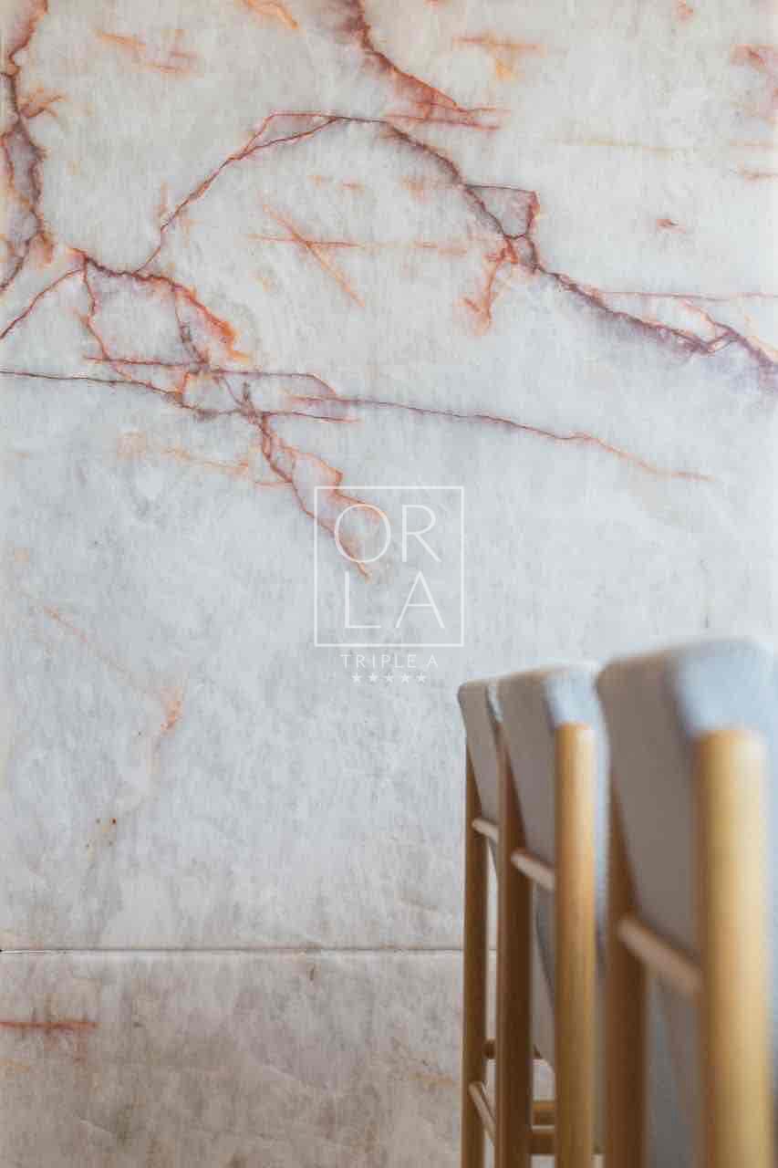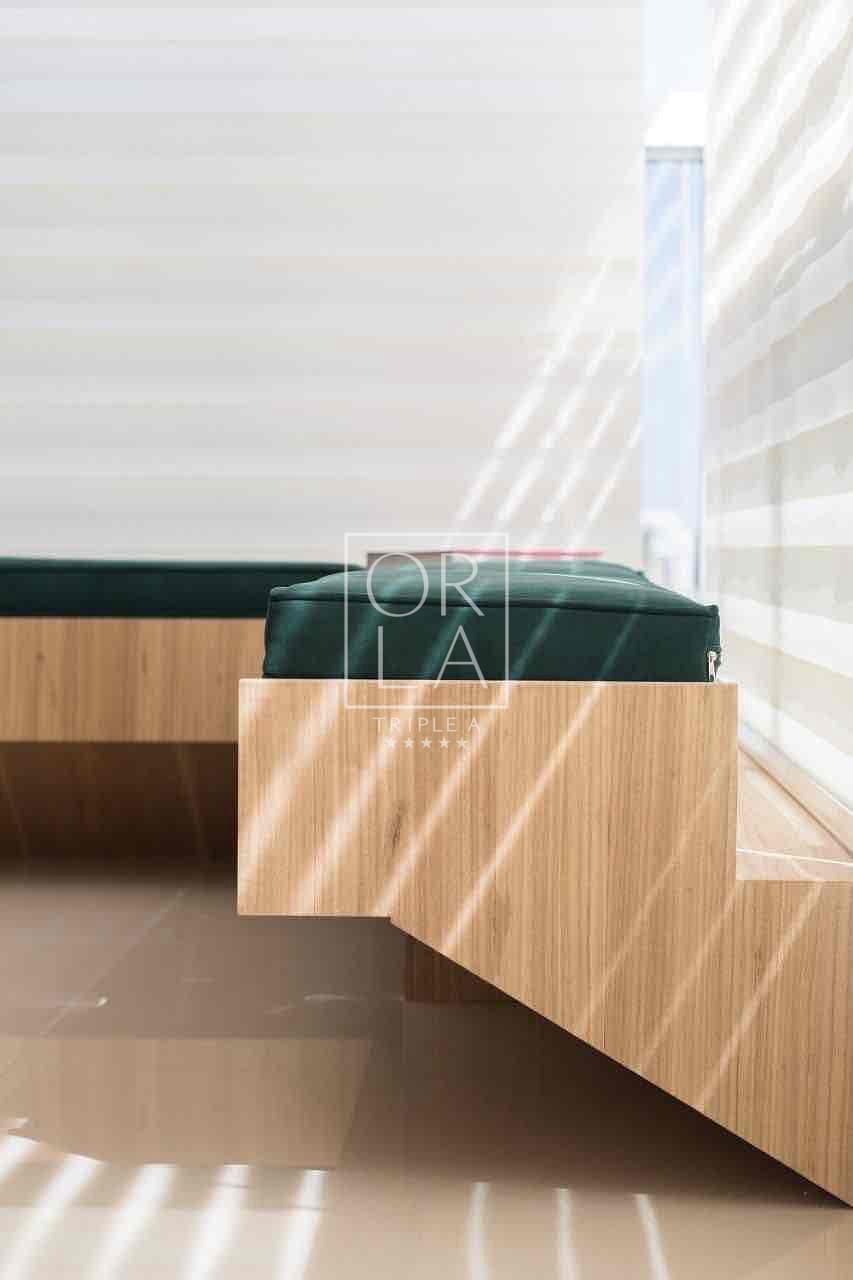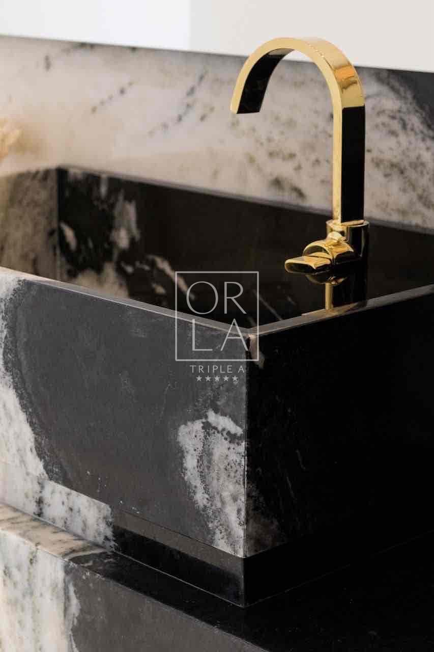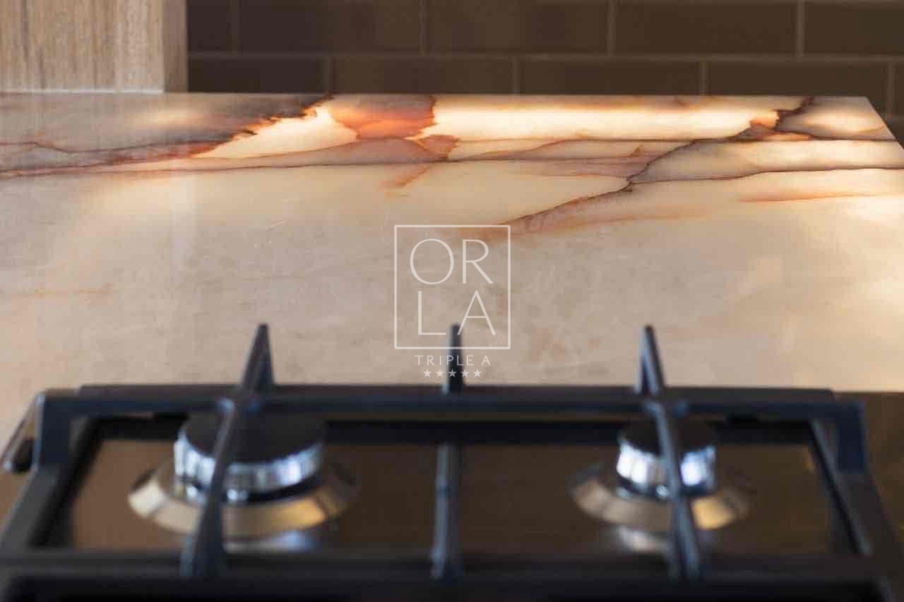 O mobiliário é da Armazém, os armários da Finart, pedras da Marmoraria Gruta, iluminação da Interpan e automação Infinity Áudio e Vídeo — uma curadoria que traduz qualidade sem precisar anunciar.