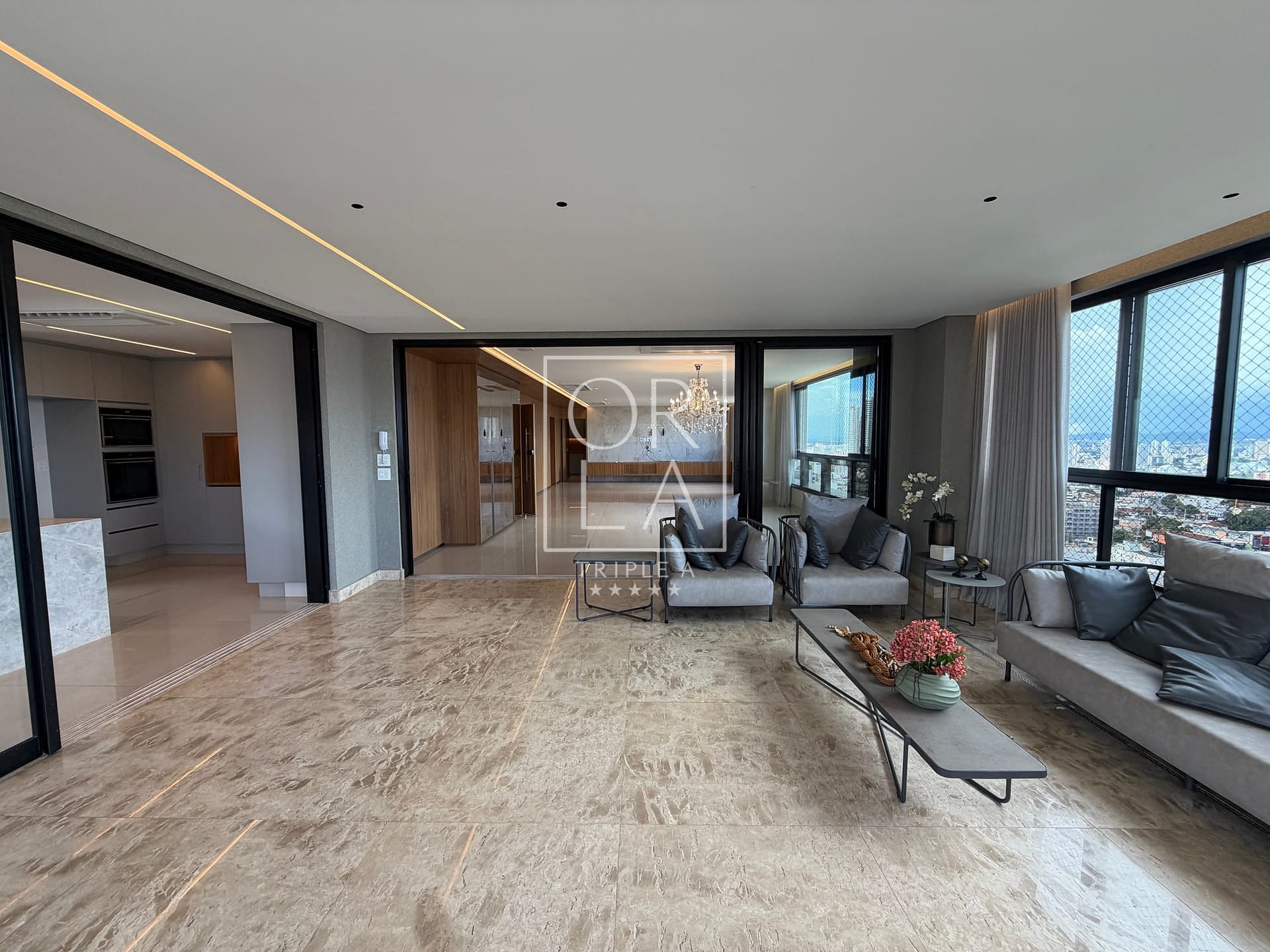 A área social impressiona pelo espaço e pela integração, ideal para receber com elegância, sempre favorecida pela iluminação natural e pela ventilação cruzada proporcionadas pela posição nascente. A vista aberta e permanente emoldura os ambientes, criando uma sensação constante de liberdade e bem-estar.