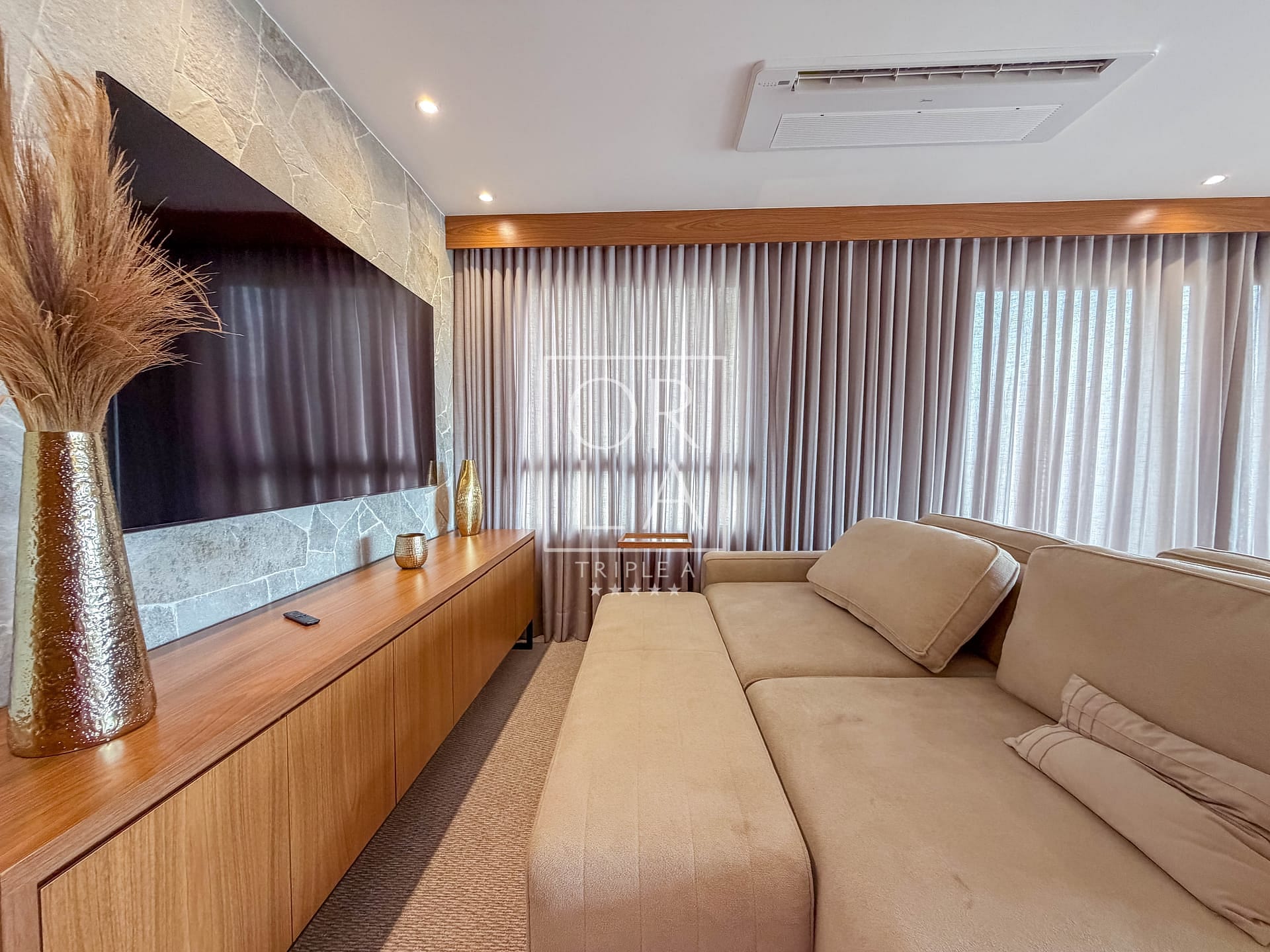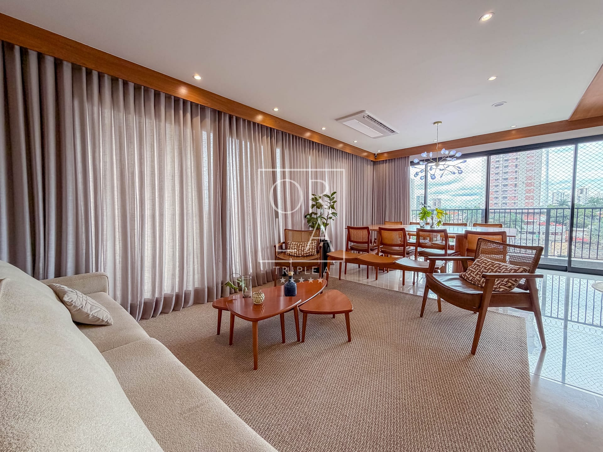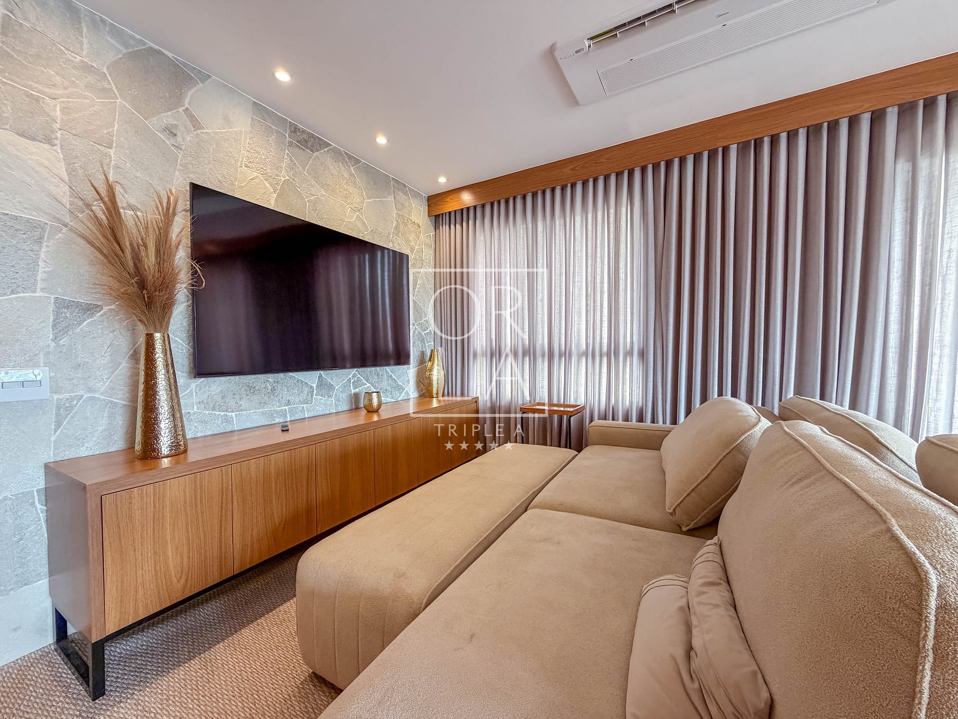 O living é amplo, integrado em três ambientes e conectado à sacada balcão, criando um espaço elegante e extremamente confortável. Todo o ambiente é climatizado com aparelhos K7, garantindo conforto térmico e uma estética limpa e sofisticada.