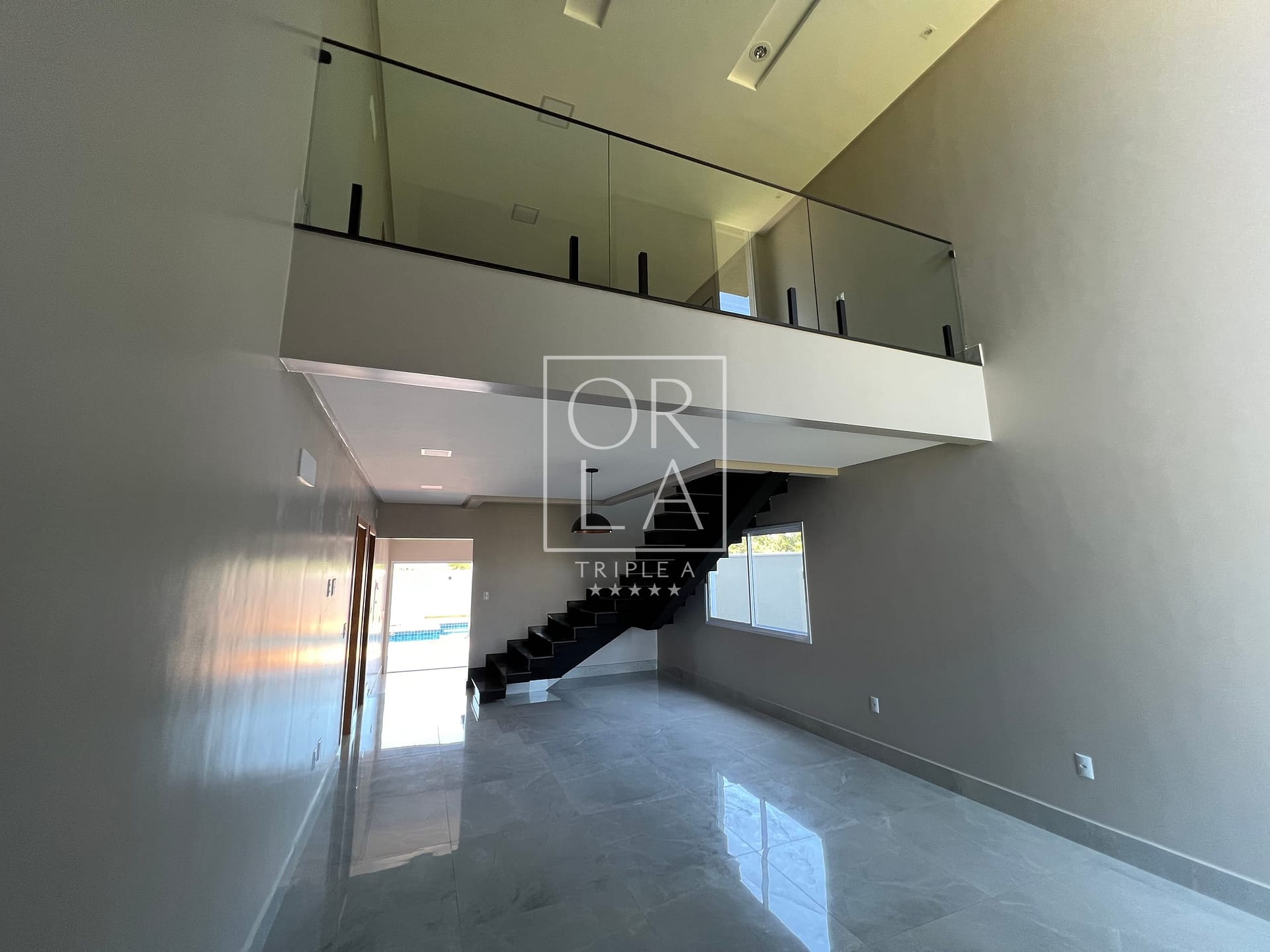 Sala para dois ambientes com pé direito duplo.