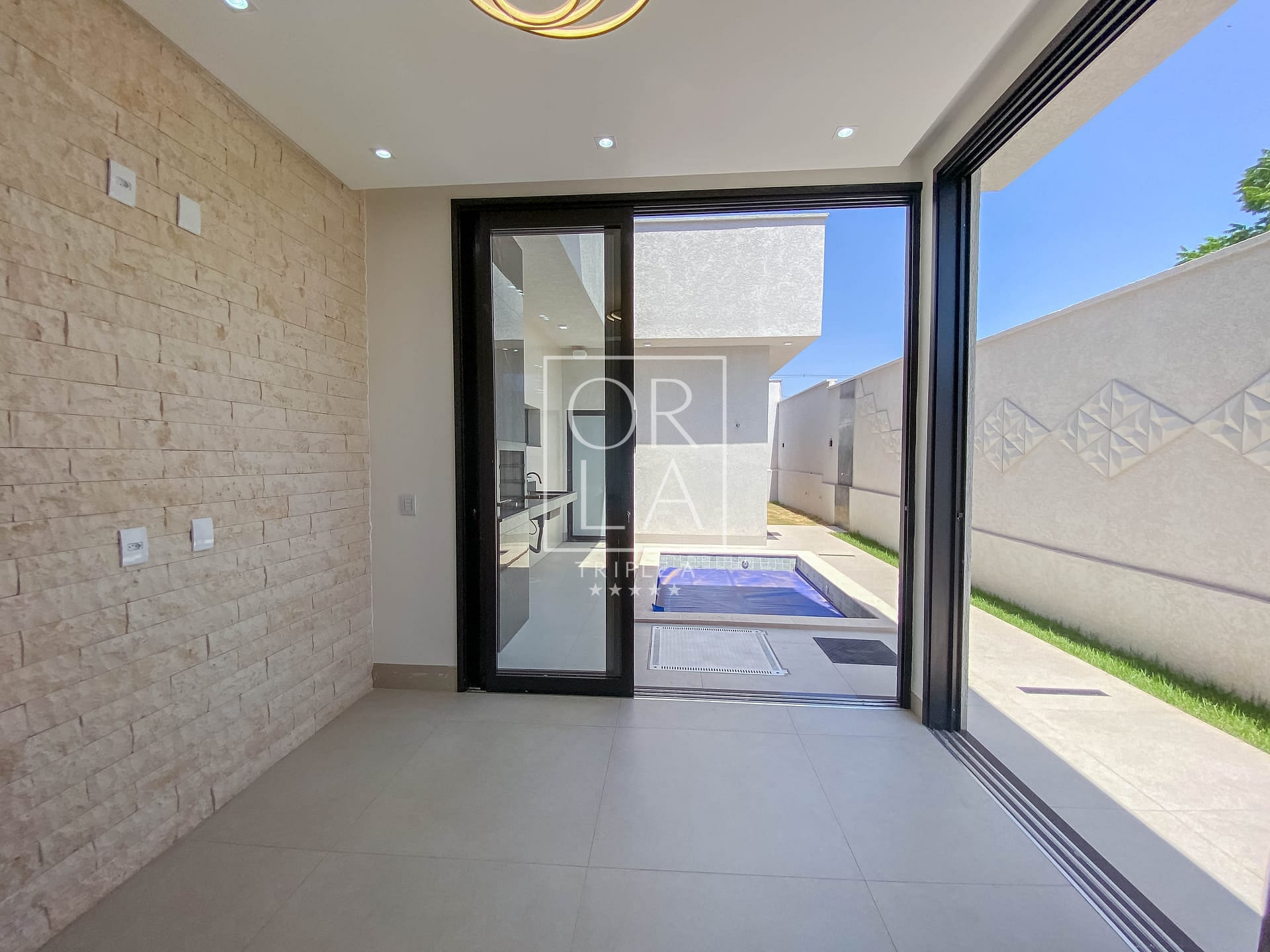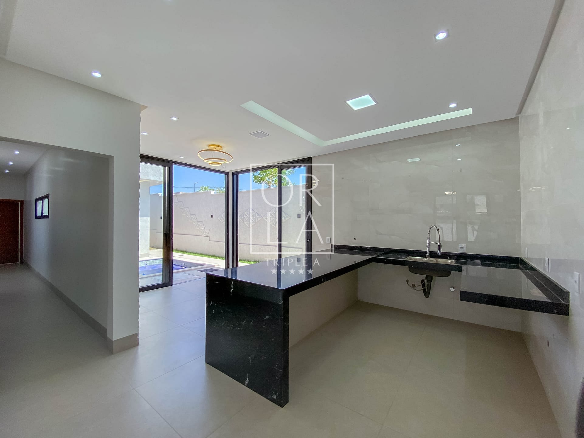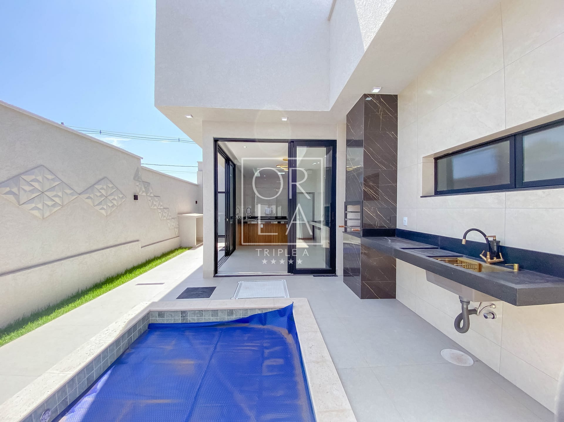A residência oferece uma piscina aquecida com iluminação, complementada por toda a iluminação entregue, incluindo fitas de LED nas sancas, muros e balizadores. O piso em porcelanato Porto Bello e os revestimentos de 1,20 nas paredes do banheiro conferem um toque de sofisticação.