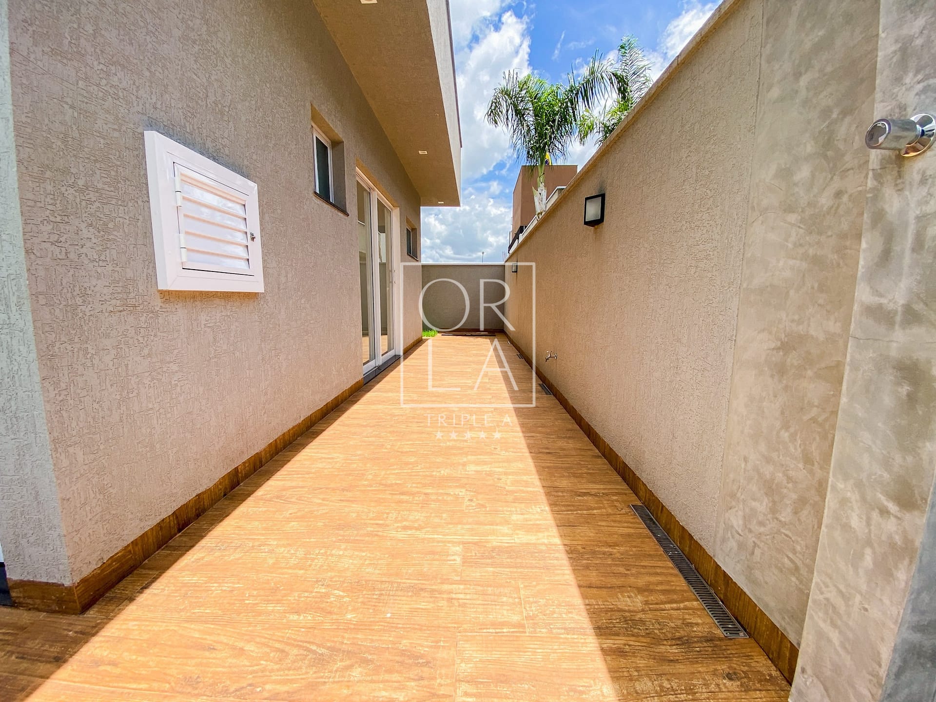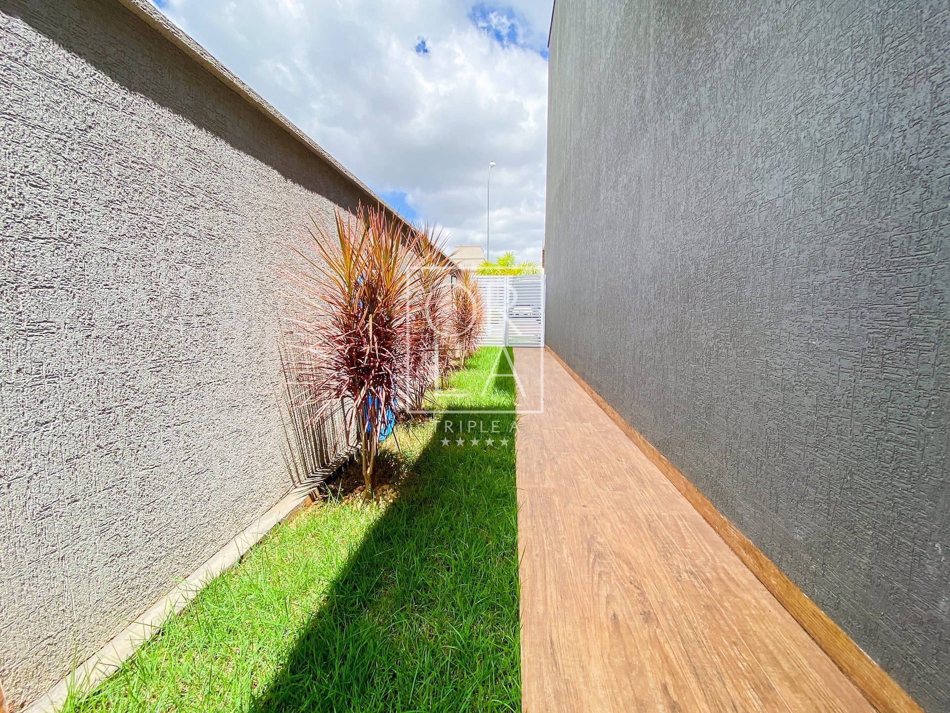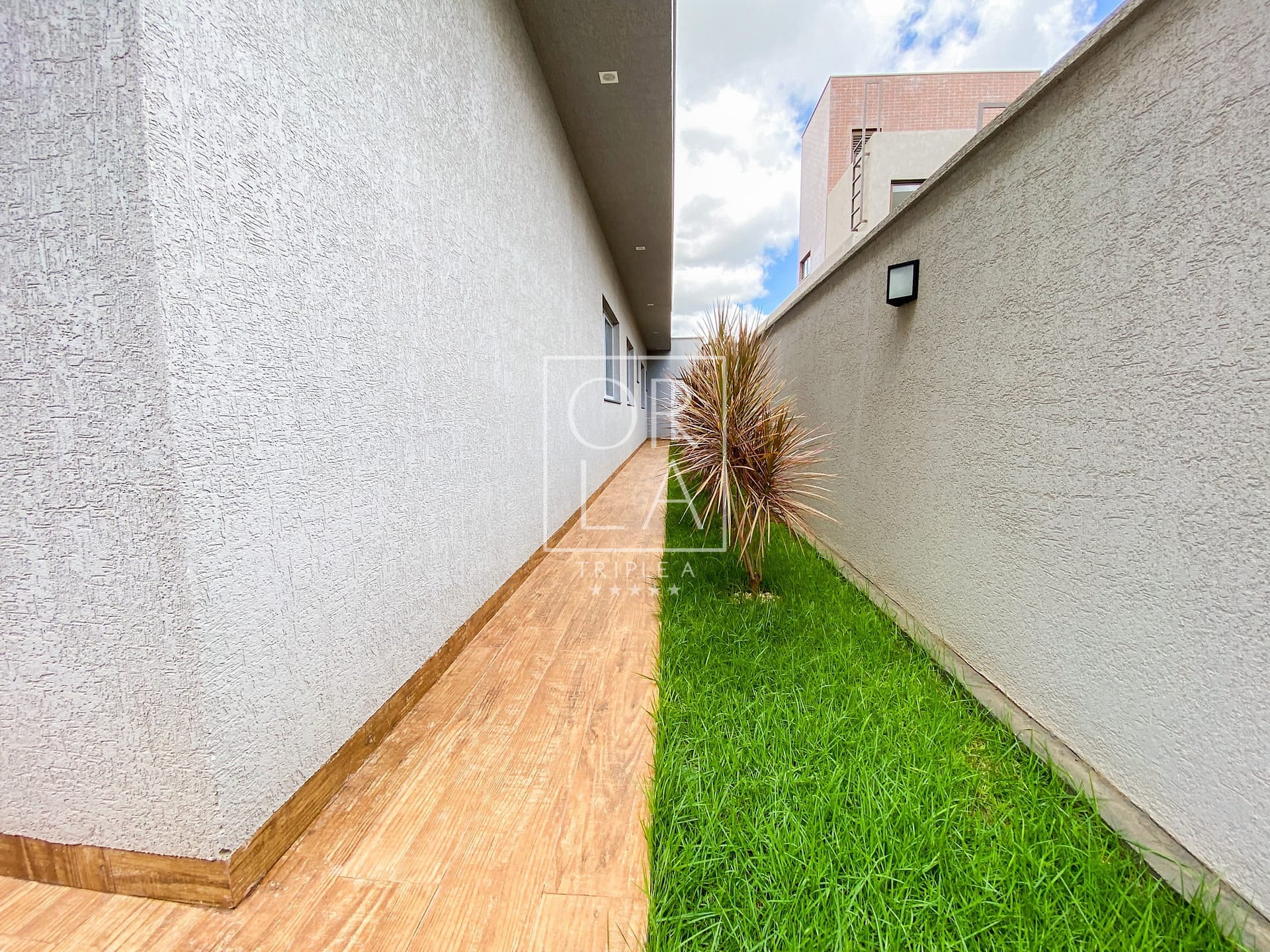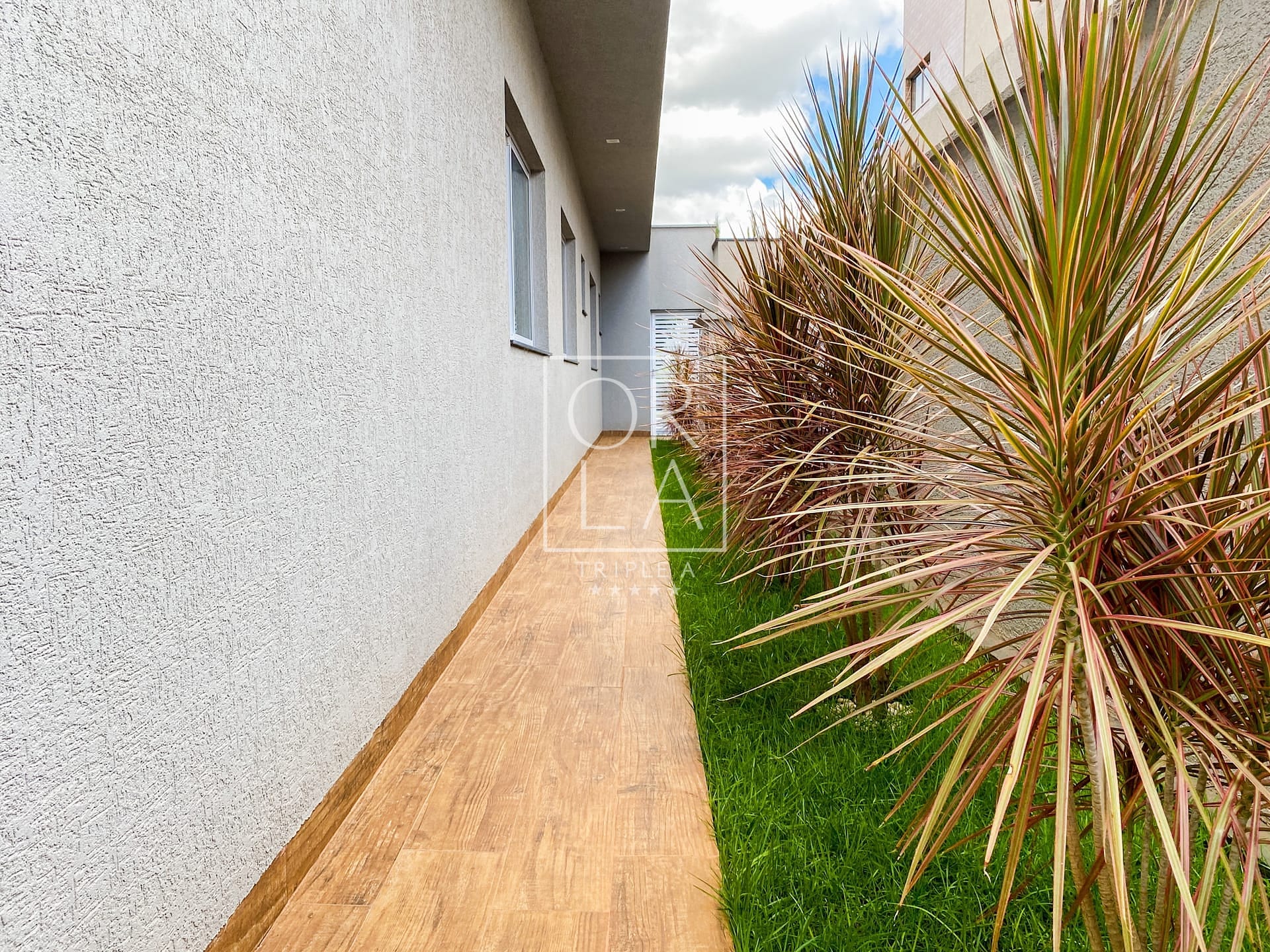Calçadas Laterais em Porcelanato Amadeirado: Detalhes que unem beleza e praticidade, proporcionando um ambiente acolhedor ao redor da casa.