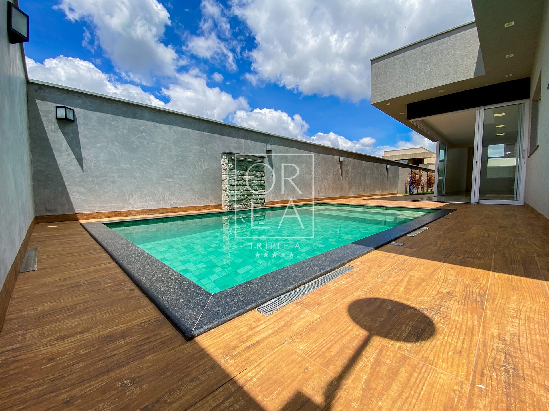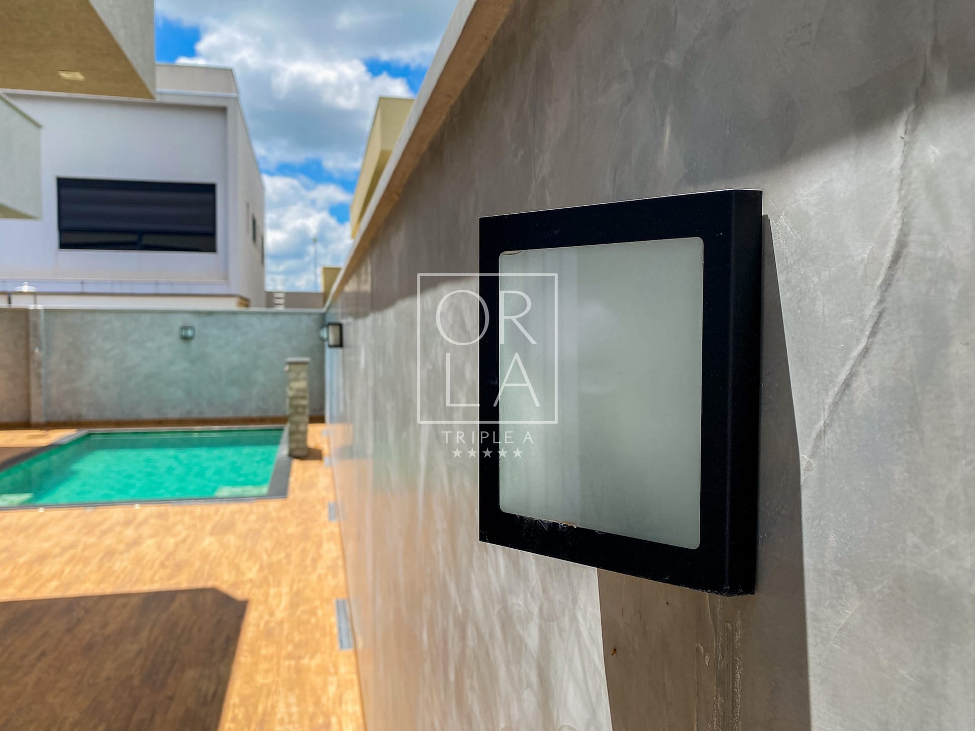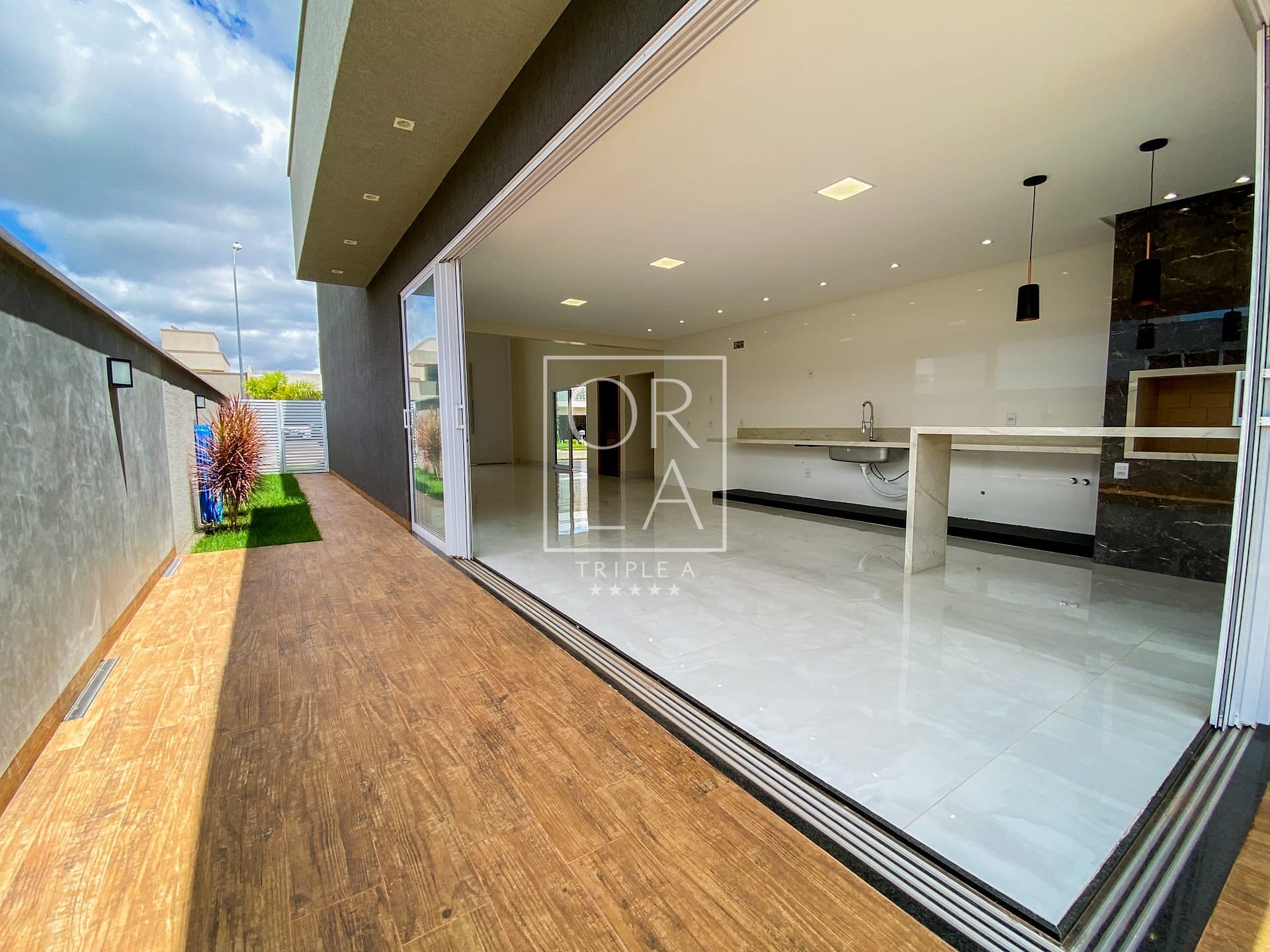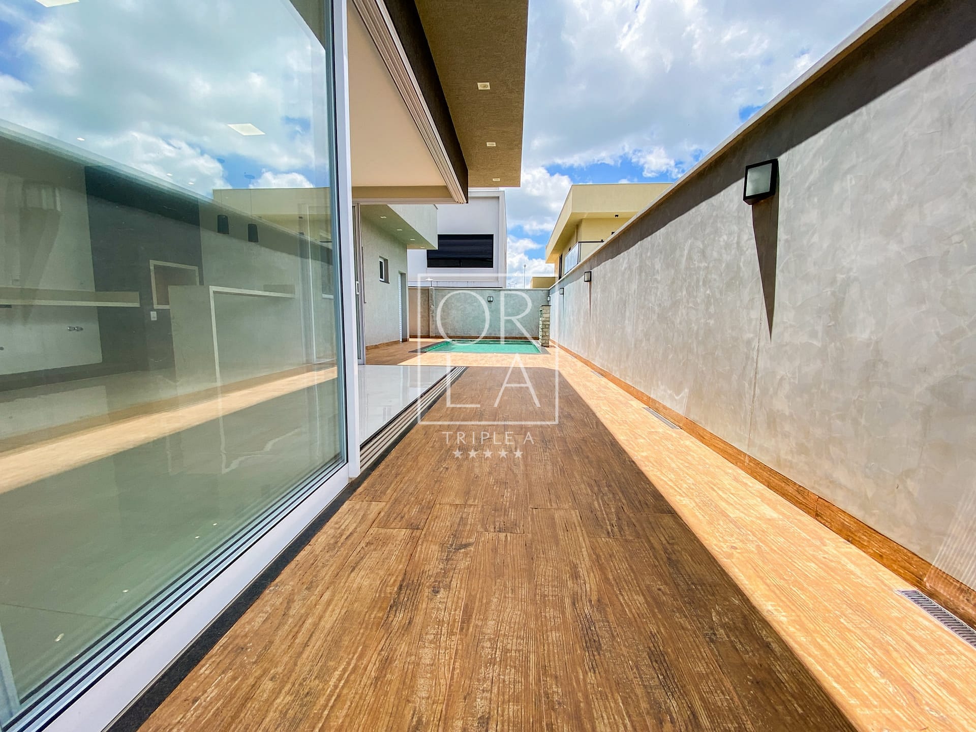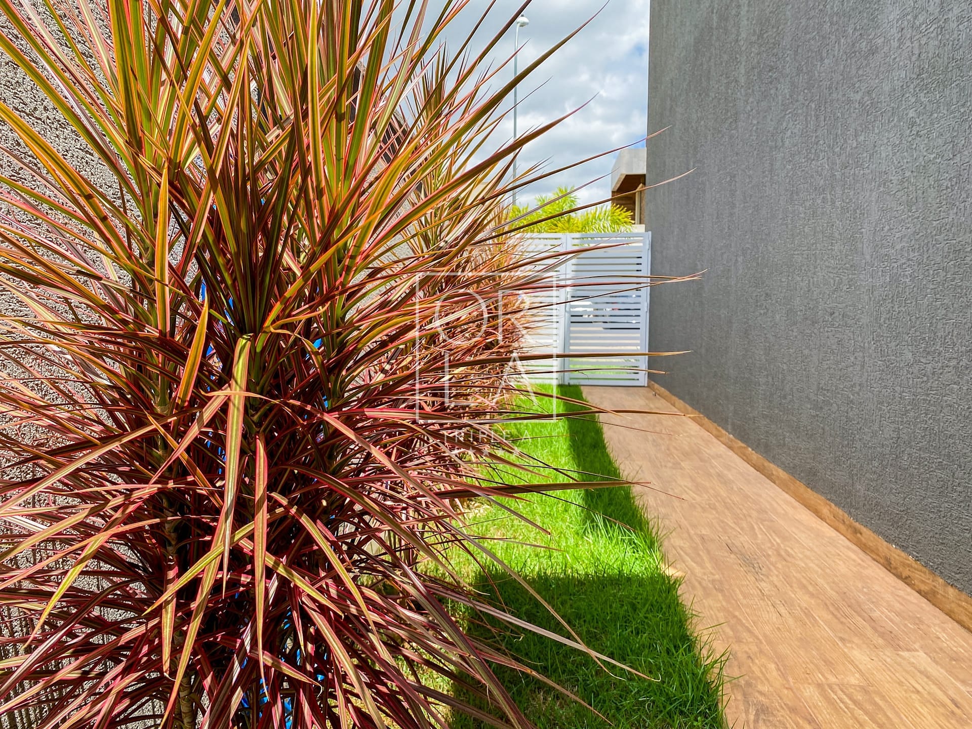 Calçadas Laterais em Porcelanato Amadeirado: Detalhes que unem beleza e praticidade, proporcionando um ambiente acolhedor ao redor da casa.
