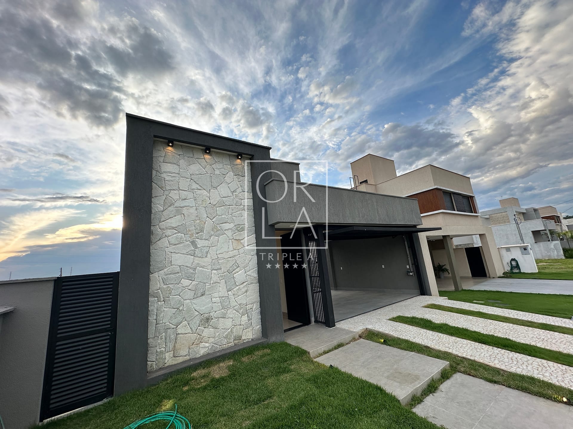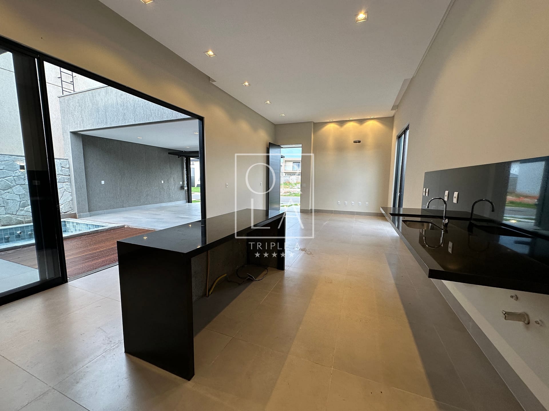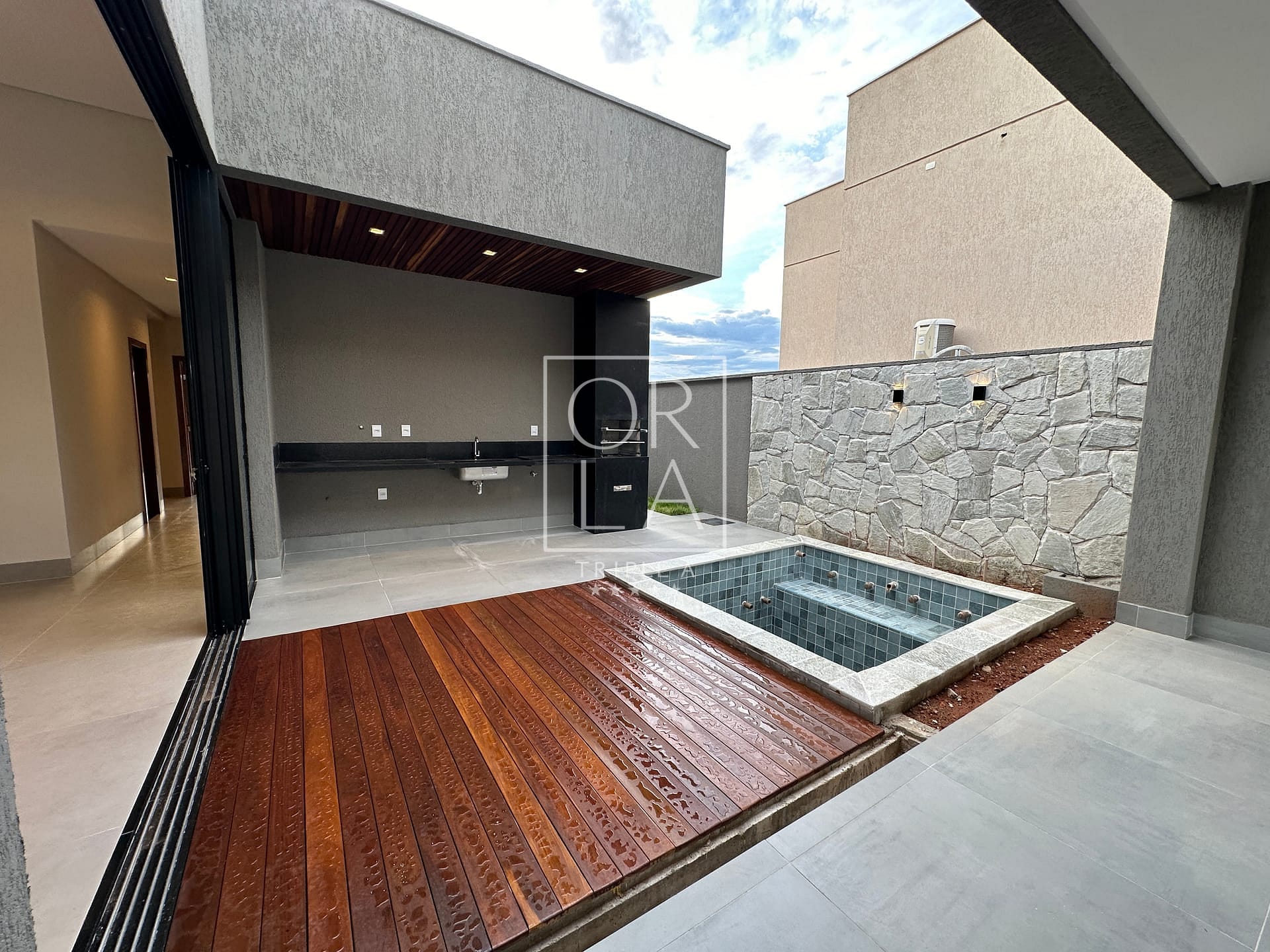 Casa térrea de 3 suítes plenas, rica em bancadas, cozinha com total integração a sala, área de serviços, lavabo e varanda gourmet com churrasqueira integrada a piscina com deck de madeira.