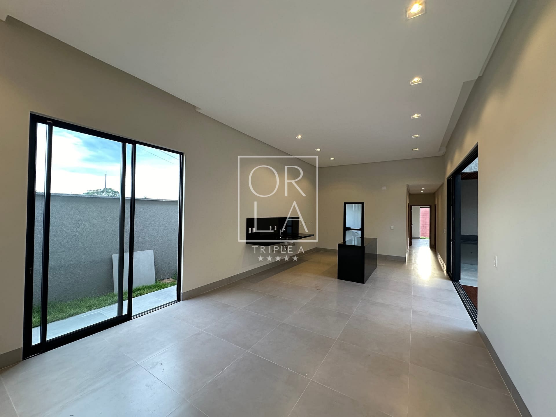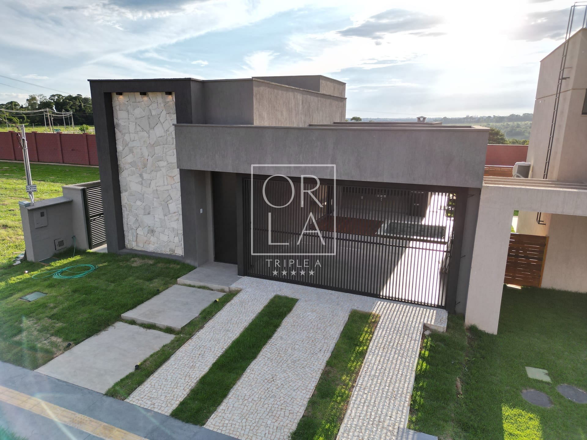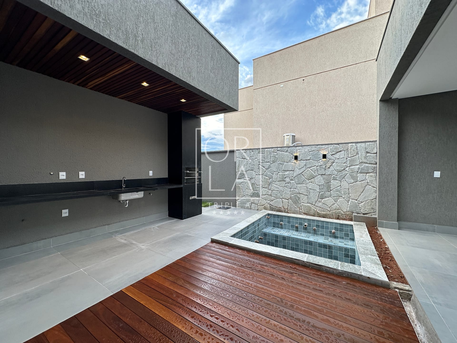 Casa térrea de 3 suítes plenas, rica em bancadas, cozinha com total integração a sala, área de serviços, lavabo e varanda gourmet com churrasqueira integrada a piscina com deck de madeira.