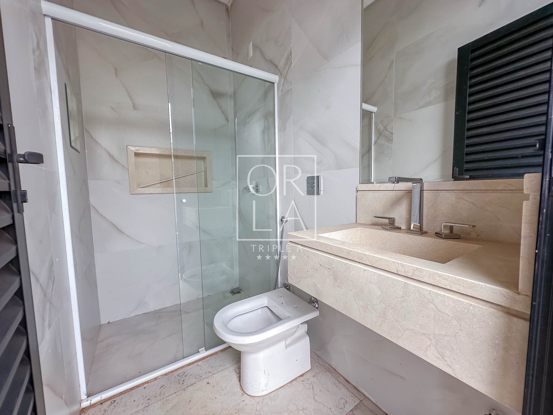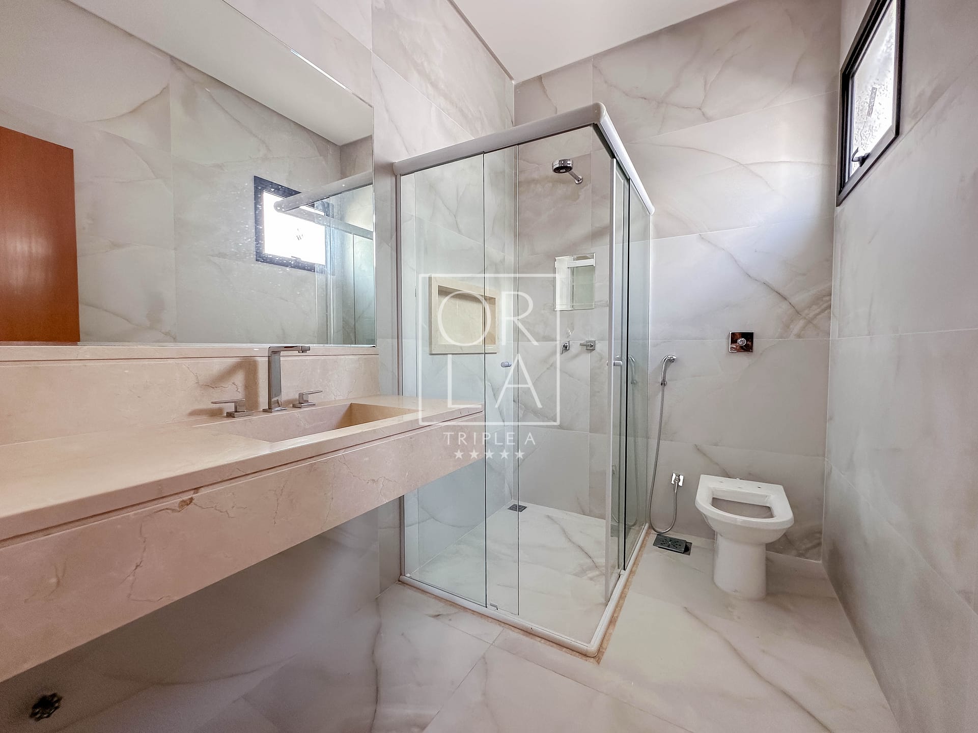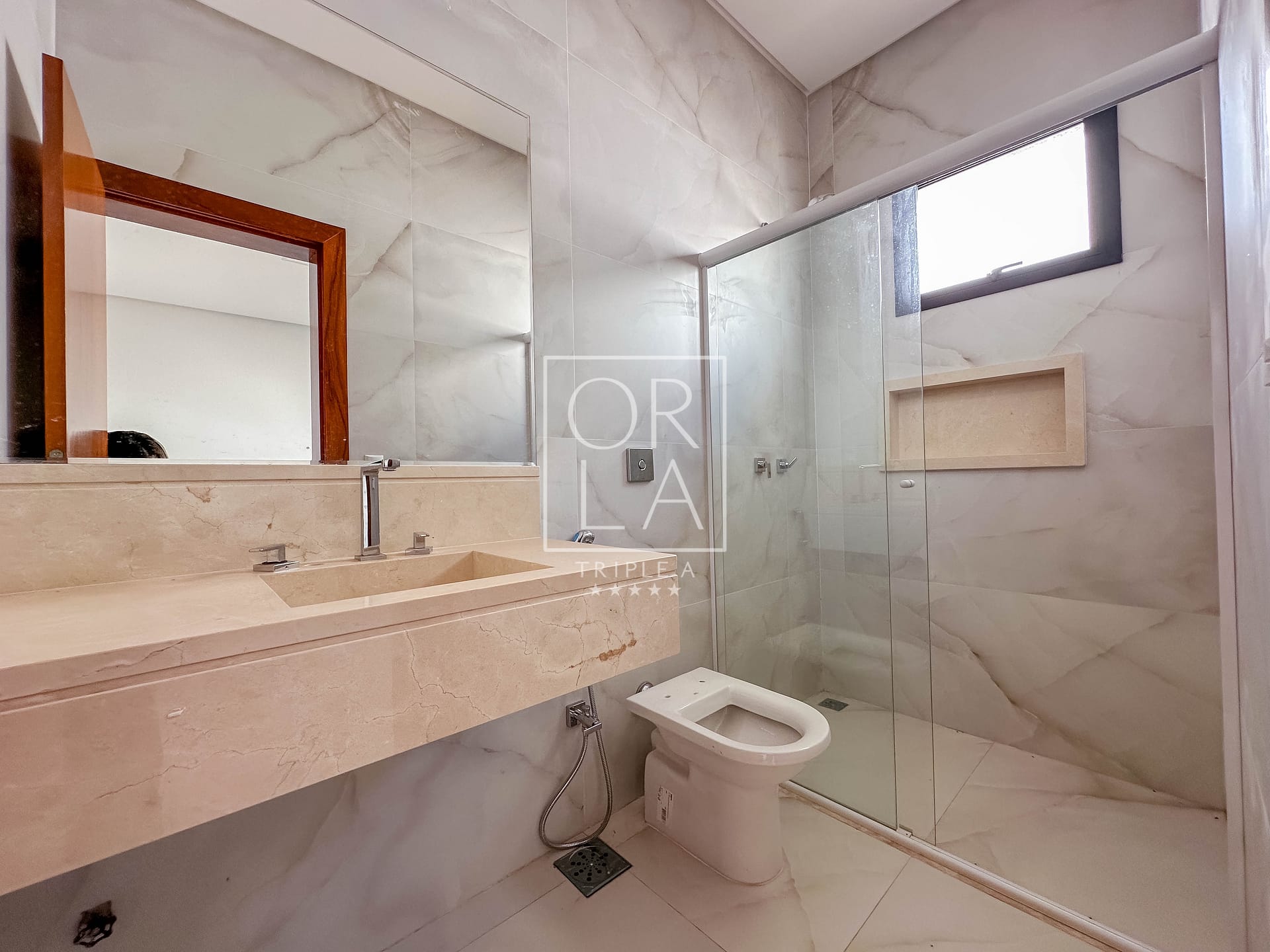 • Banheiros com cuba esculpida em mármore, nicho, box e espelho instalados.