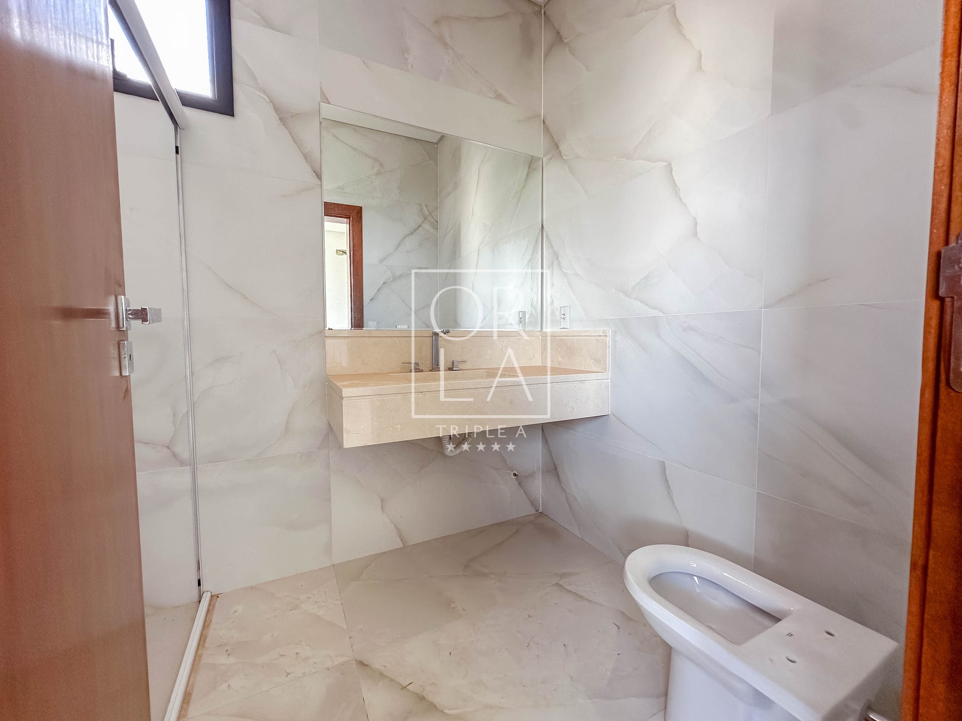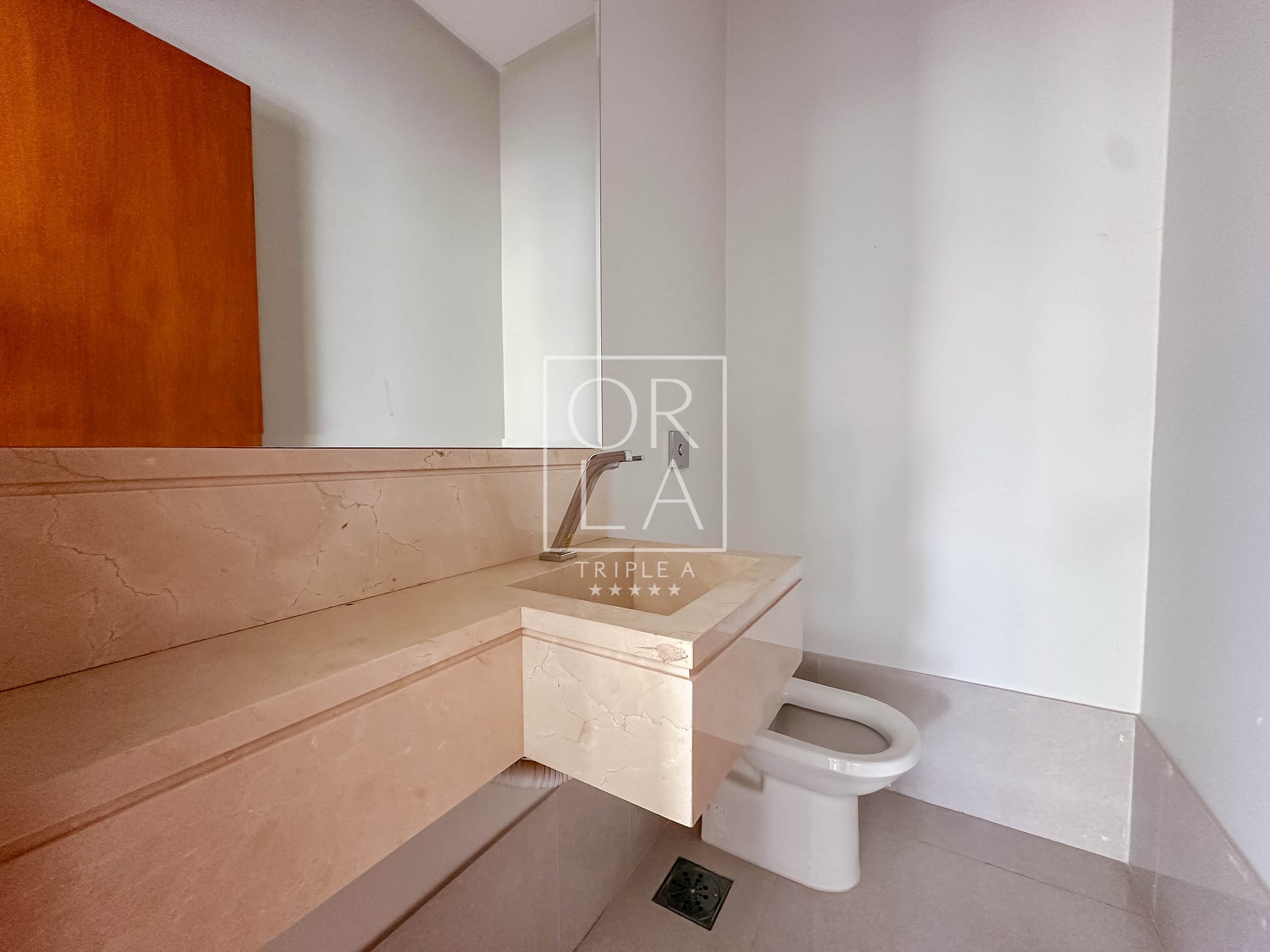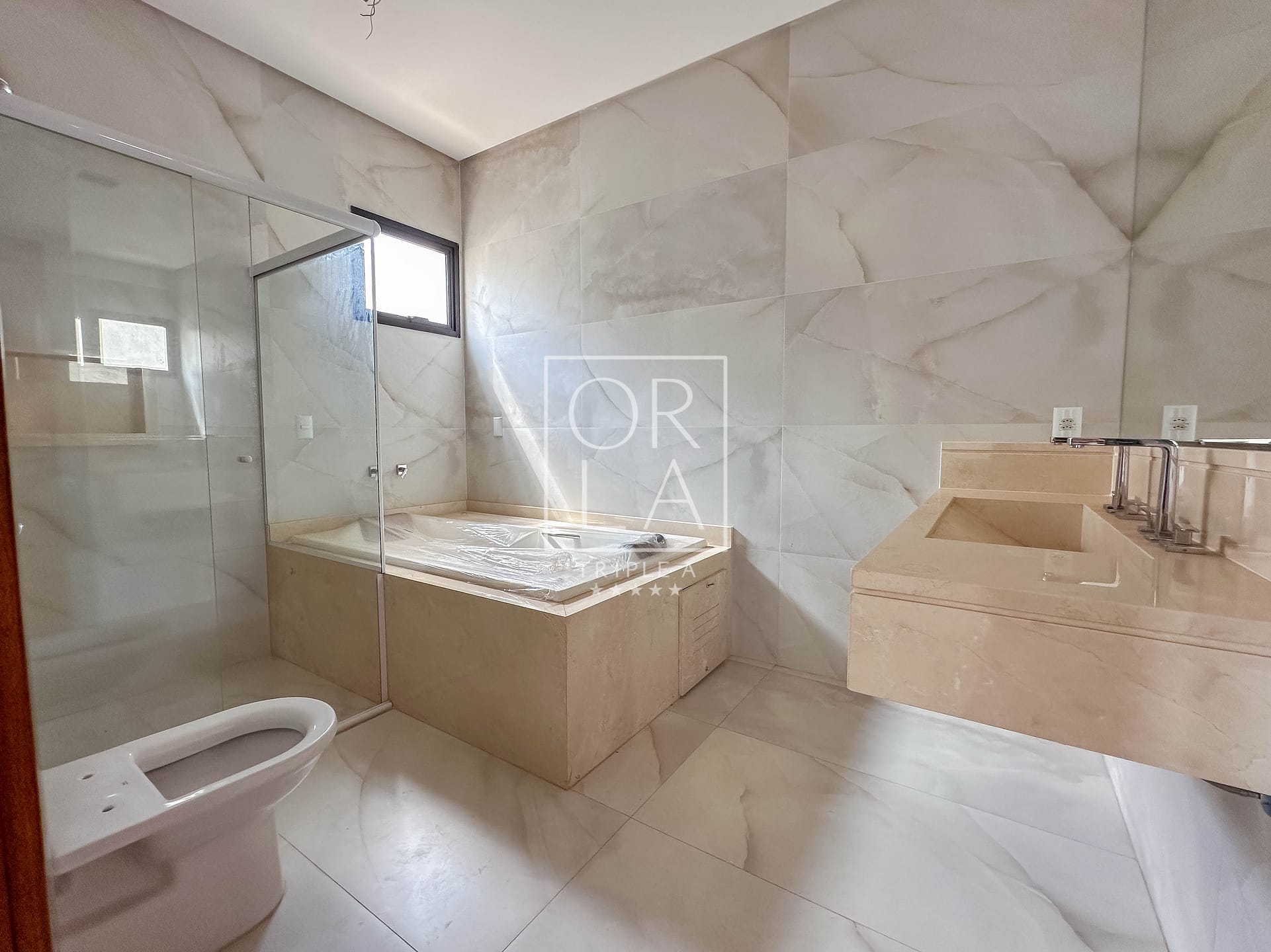 • Banheiros com cuba esculpida em mármore, nicho, box e espelho instalados.