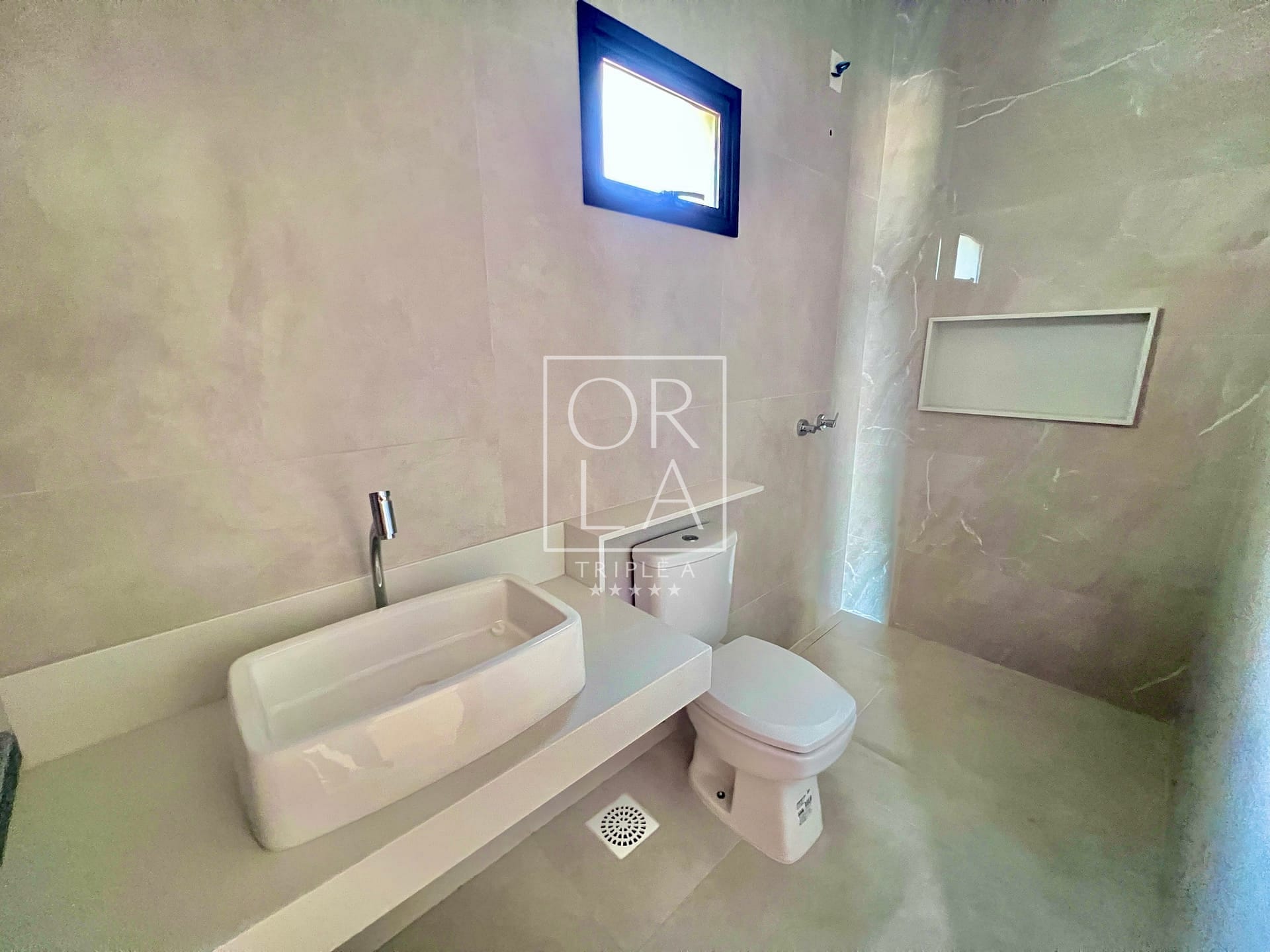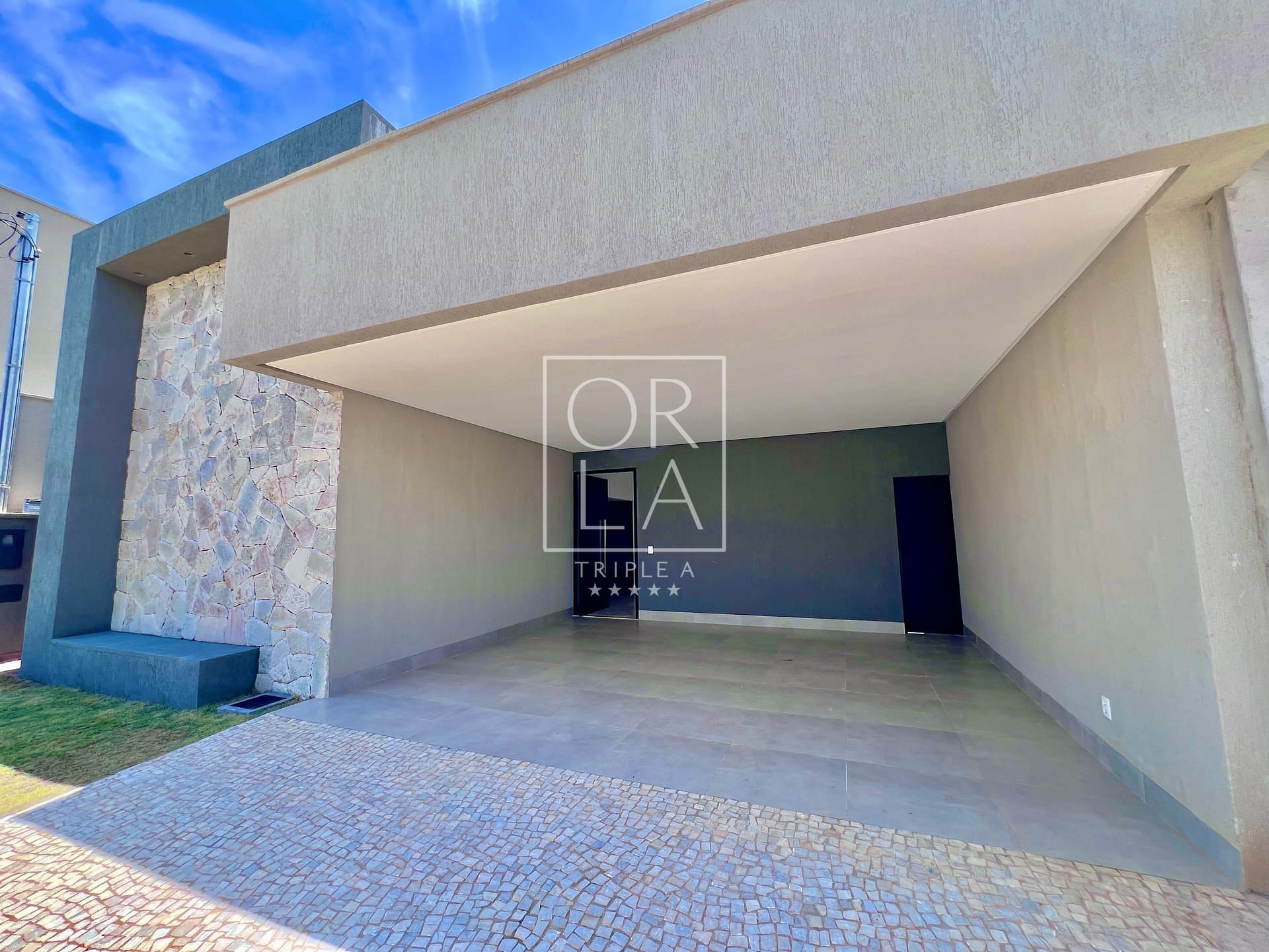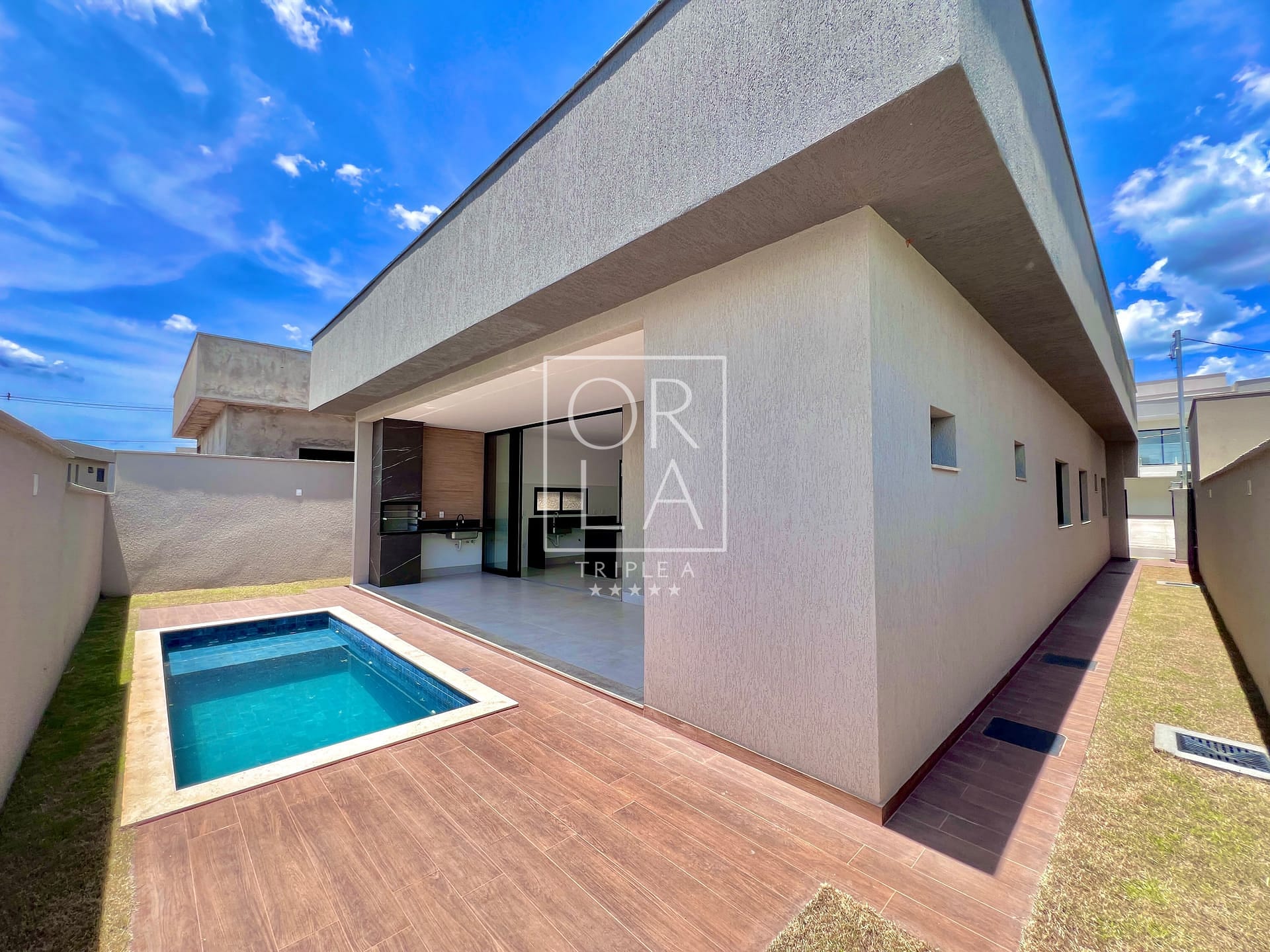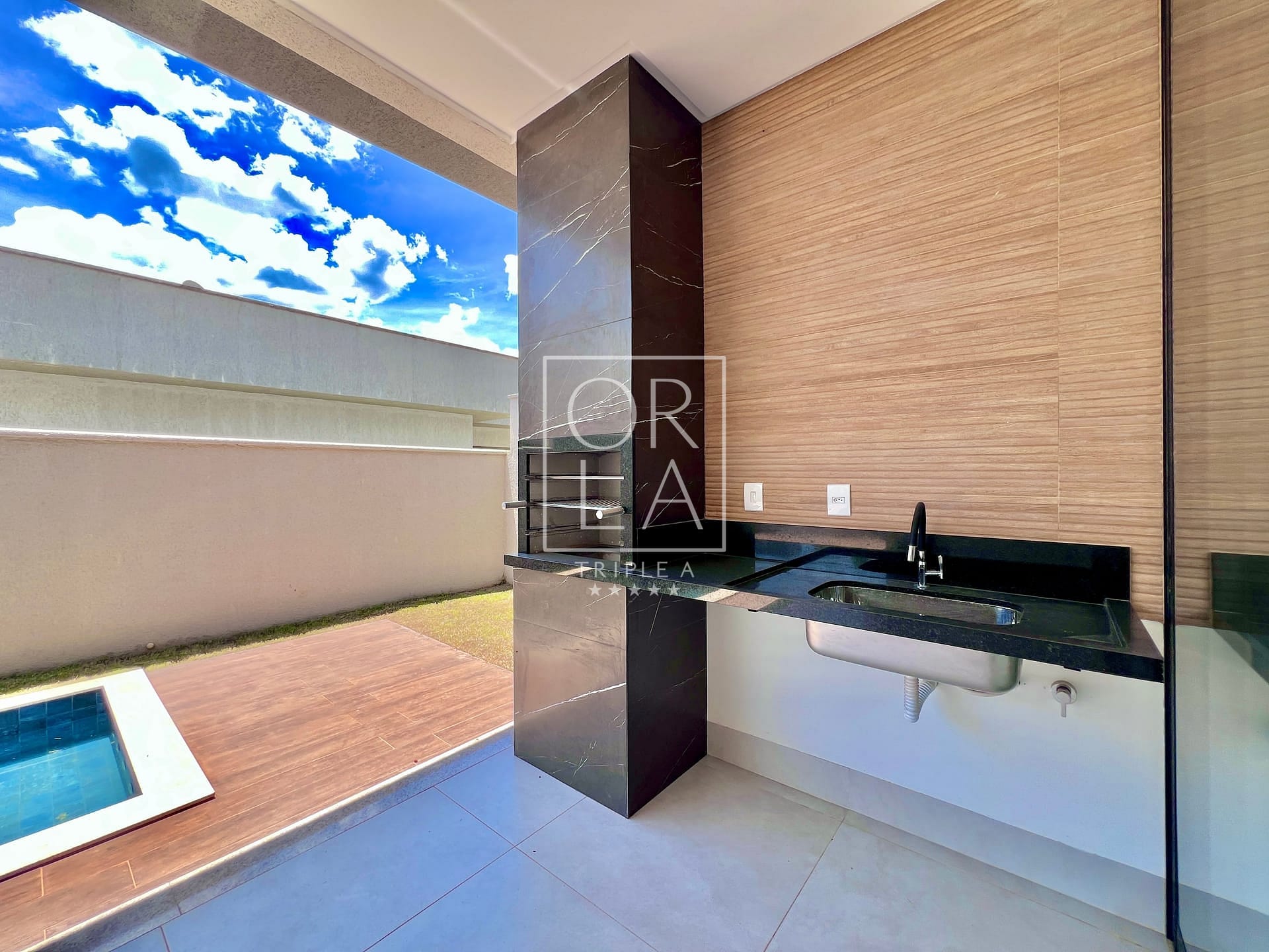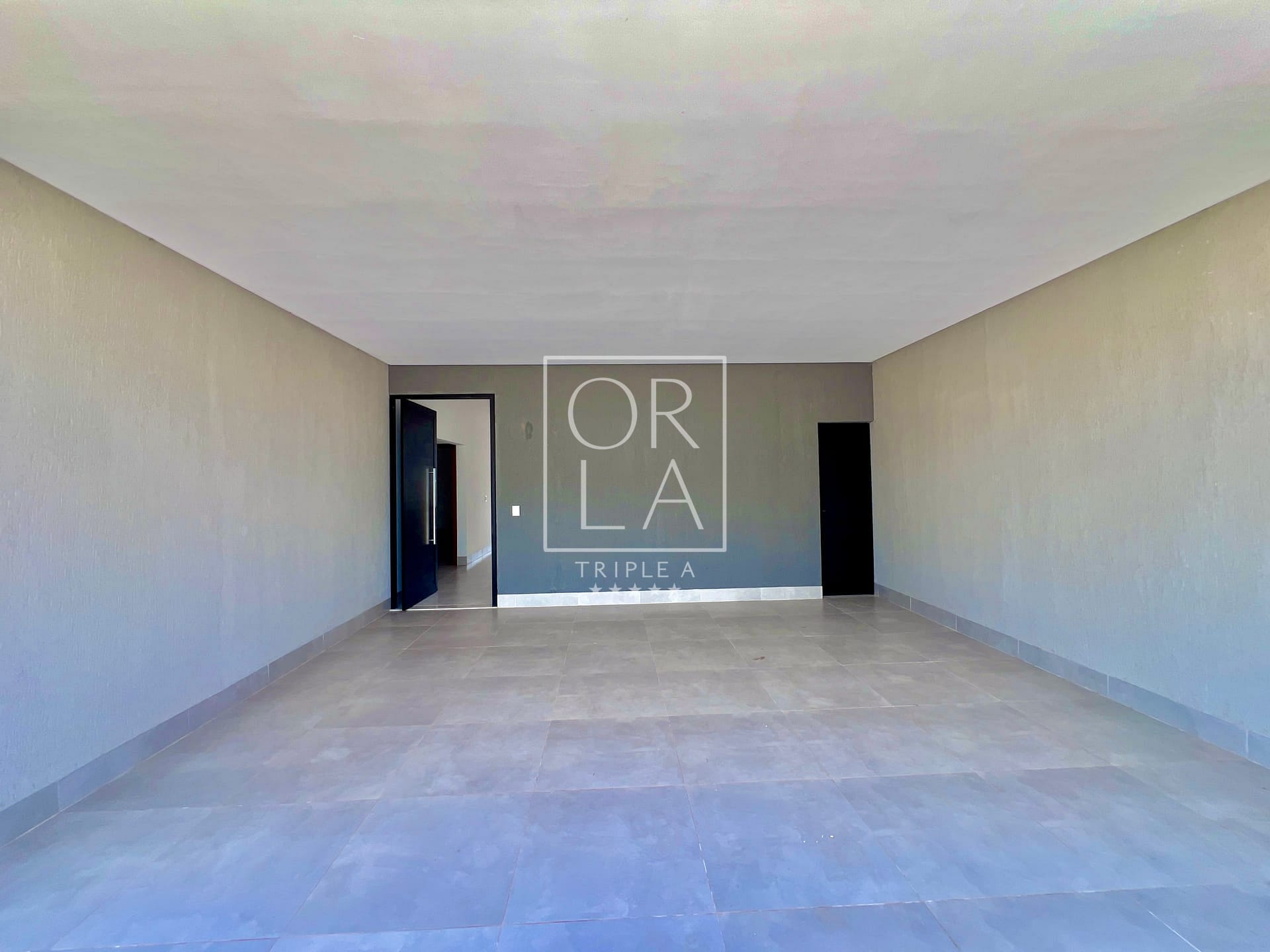 Casa térrea de 3 quartos sendo 1 suíte, 1 banheiro social, 1 lavabo, Cozinha repleta de bancadas integrada a sala, sala com pé direito duplo, área de serviços, Varanda área gourmet completa com banheiro social, piscina, churrasqueira e bancada com pia.