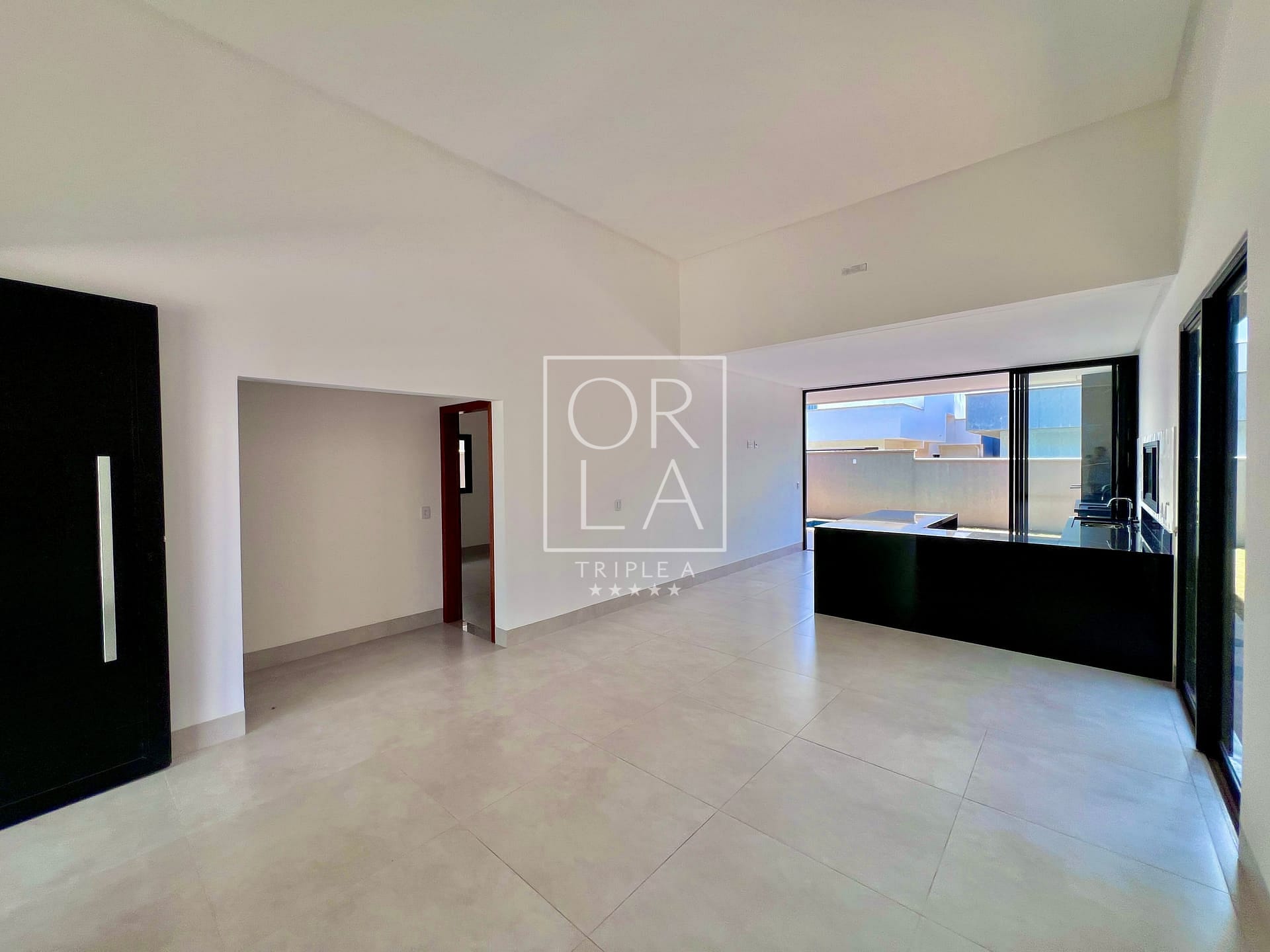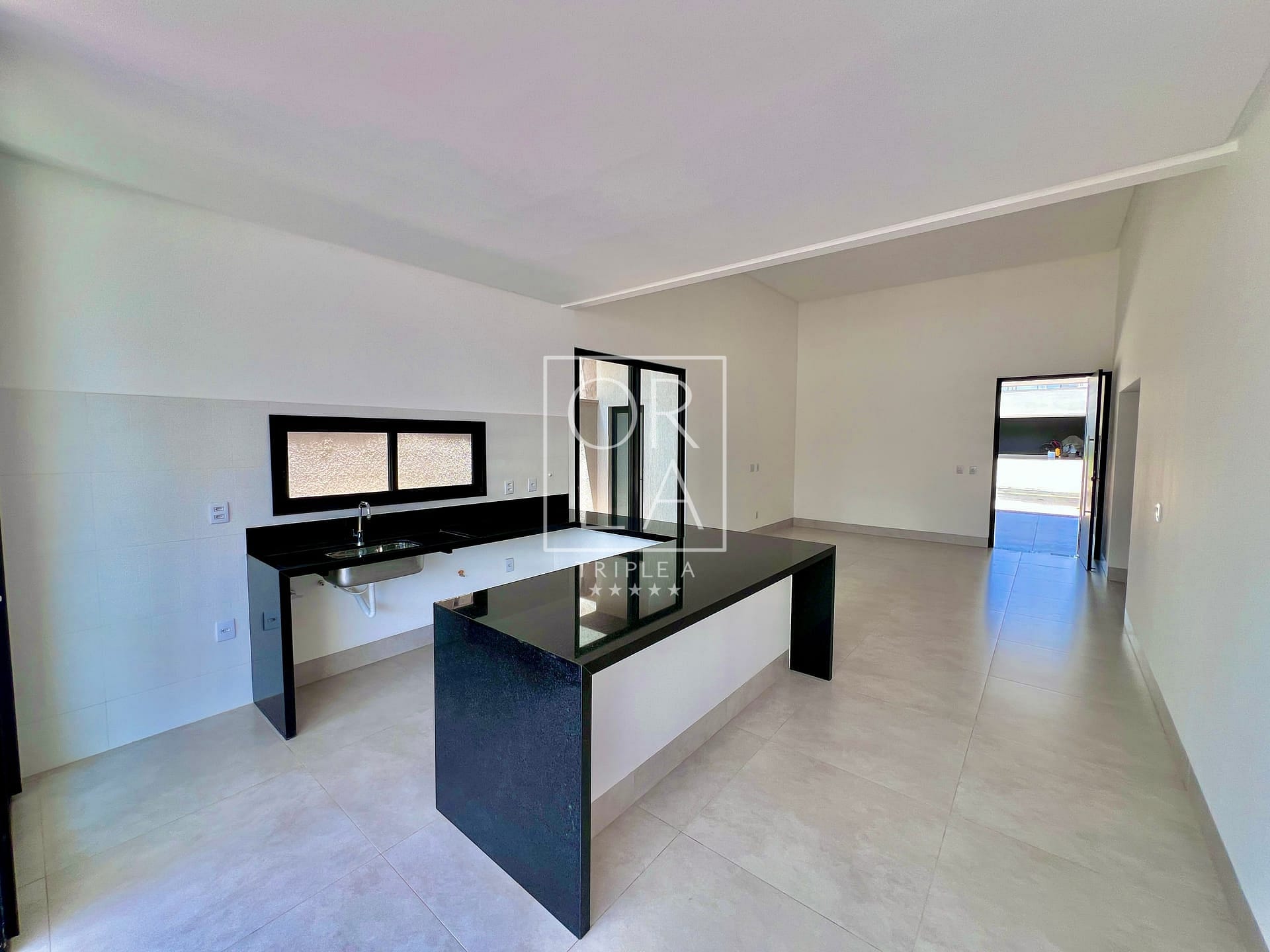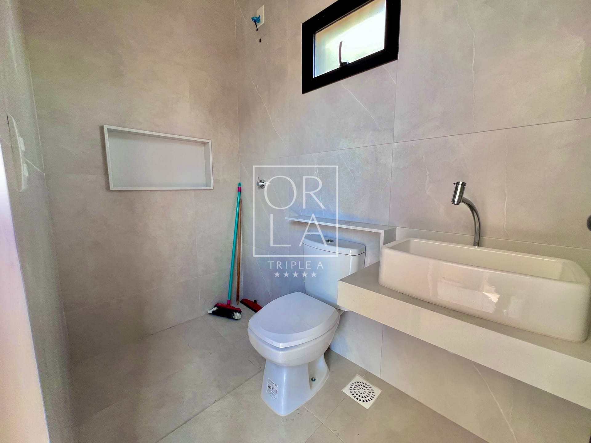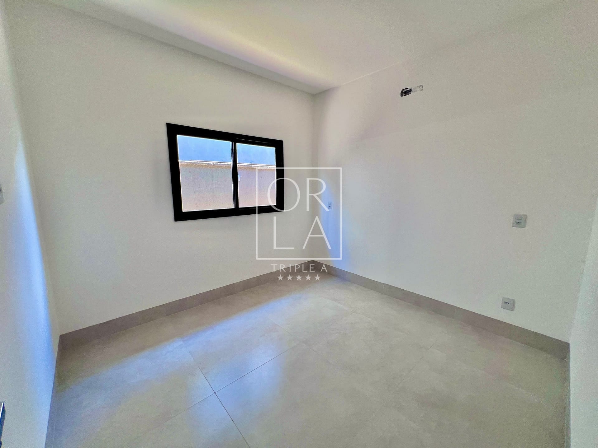 Casa térrea de 3 quartos sendo 1 suíte, 1 banheiro social, 1 lavabo, Cozinha repleta de bancadas integrada a sala, sala com pé direito duplo, área de serviços, Varanda área gourmet completa com banheiro social, piscina, churrasqueira e bancada com pia.
