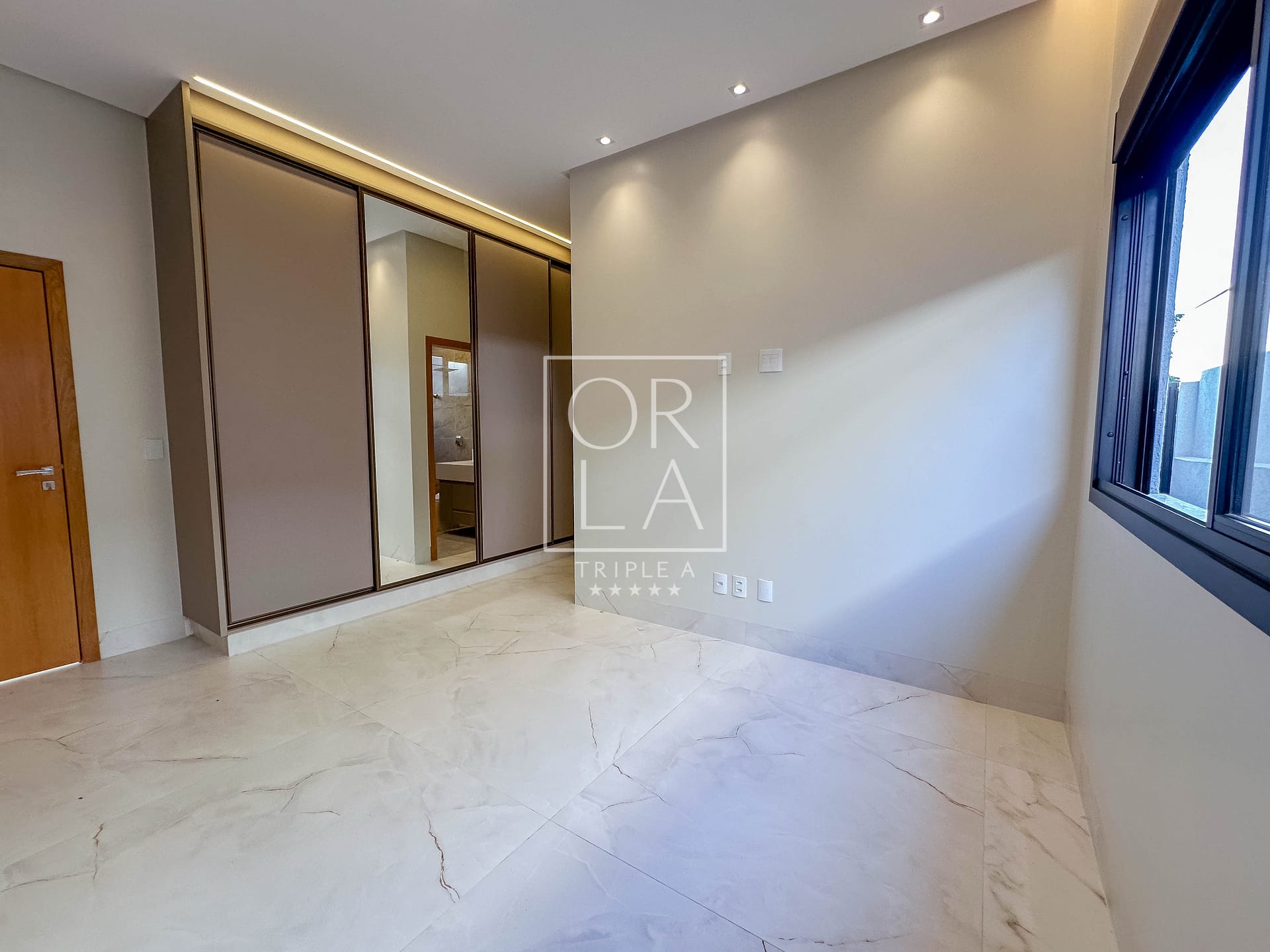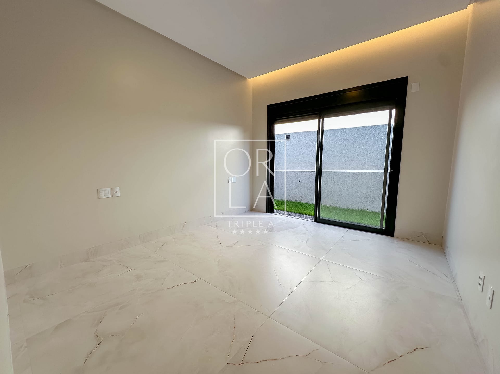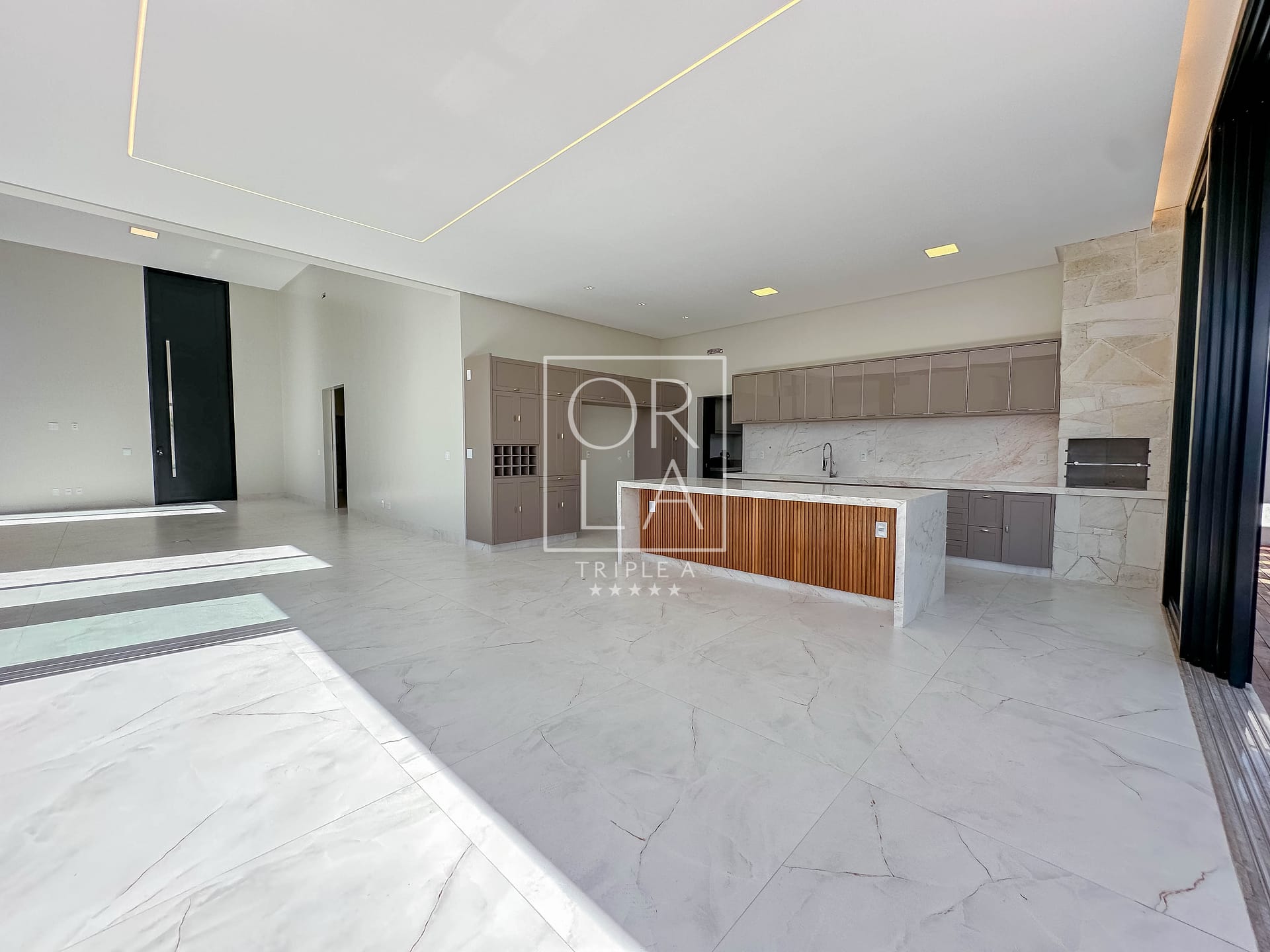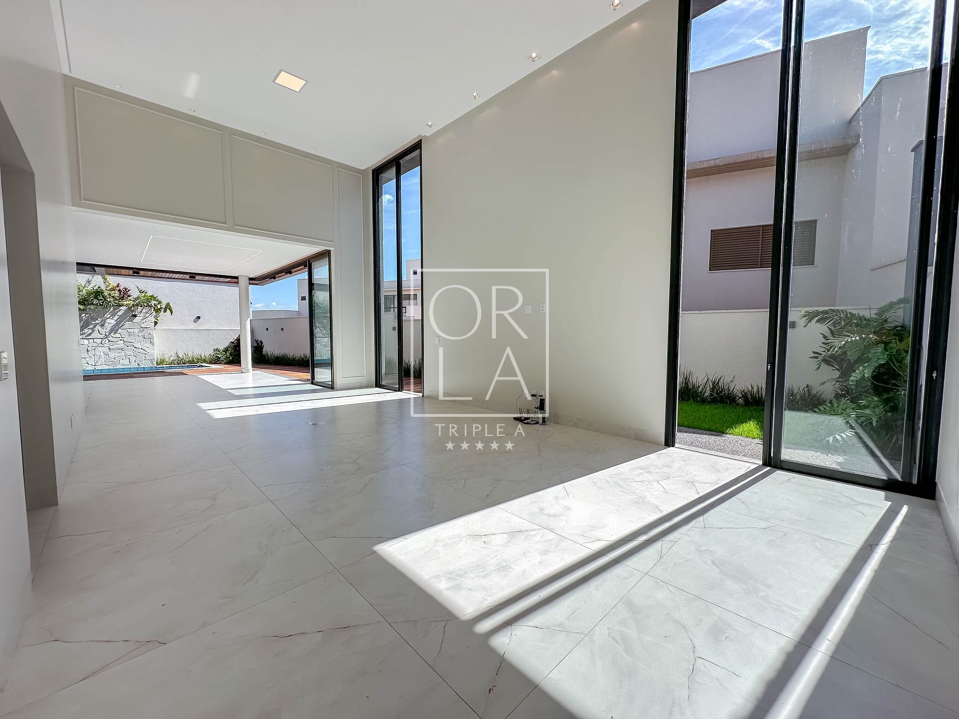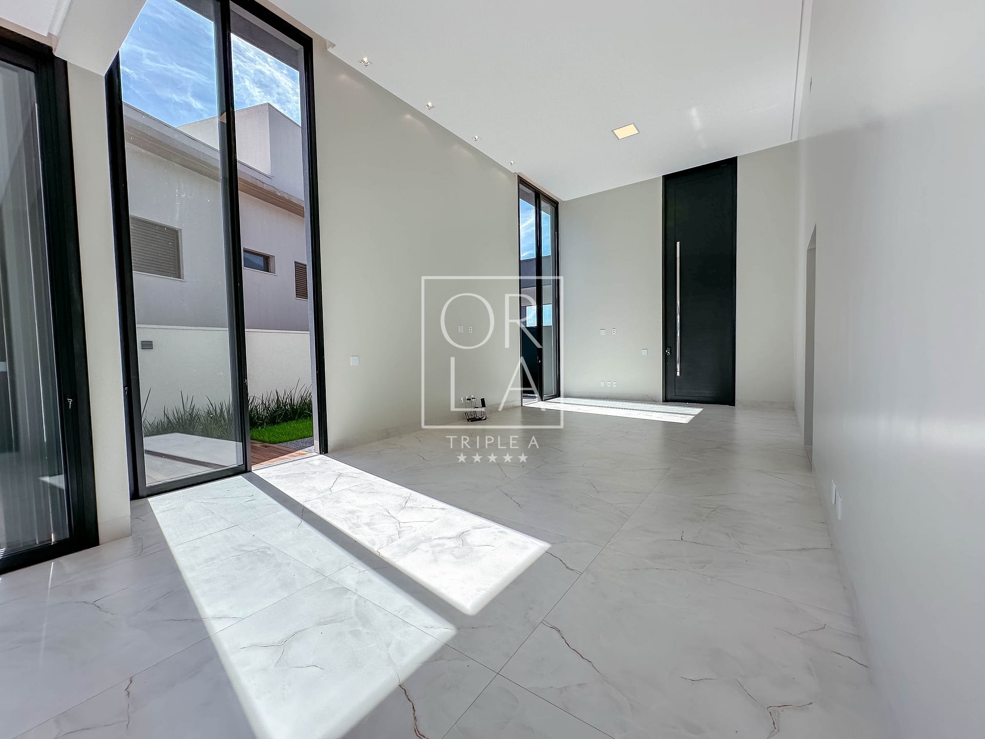 • Esquadrias automatizadas, porcelanato 1,20×1,20, pé direito duplo;