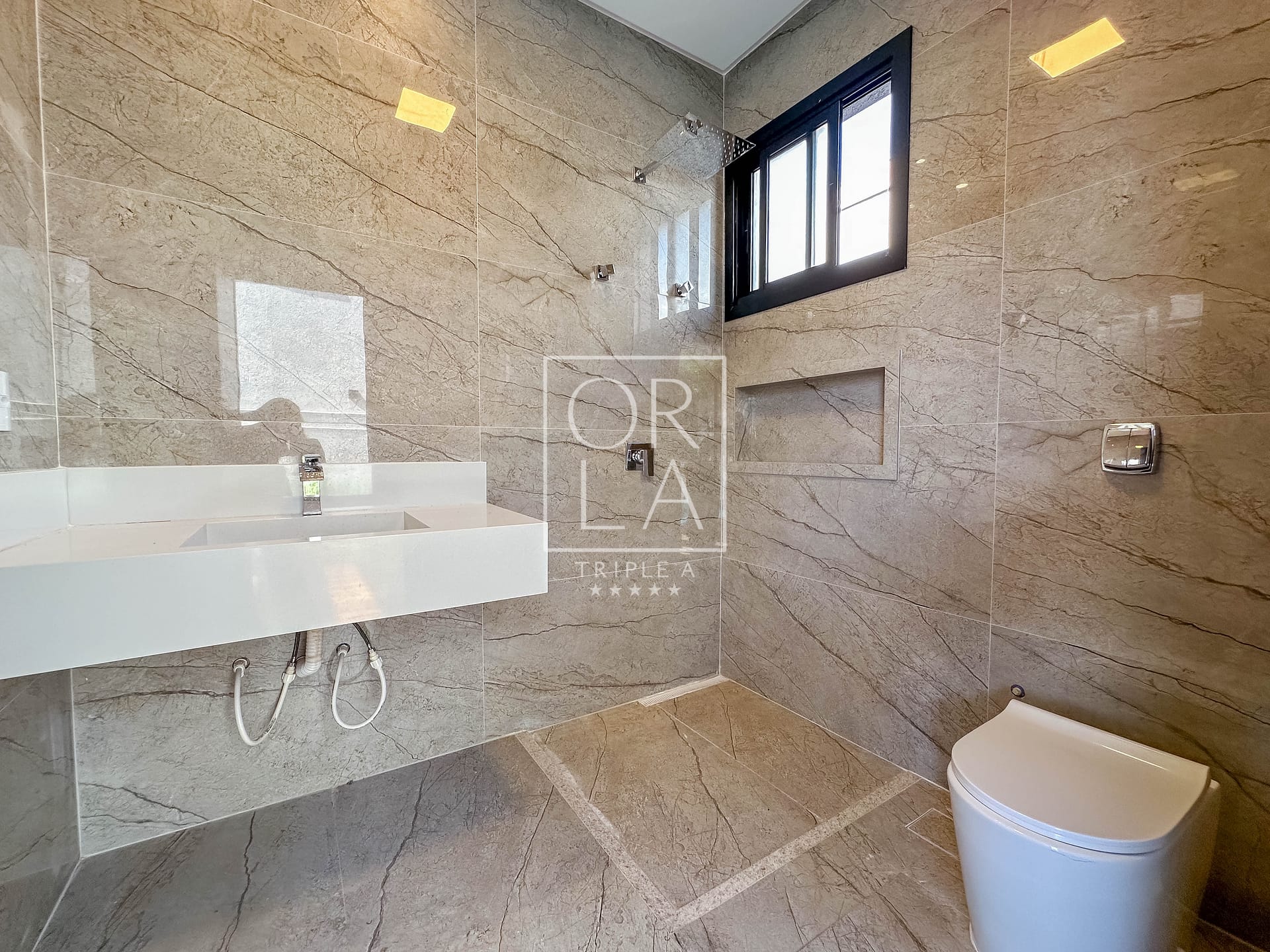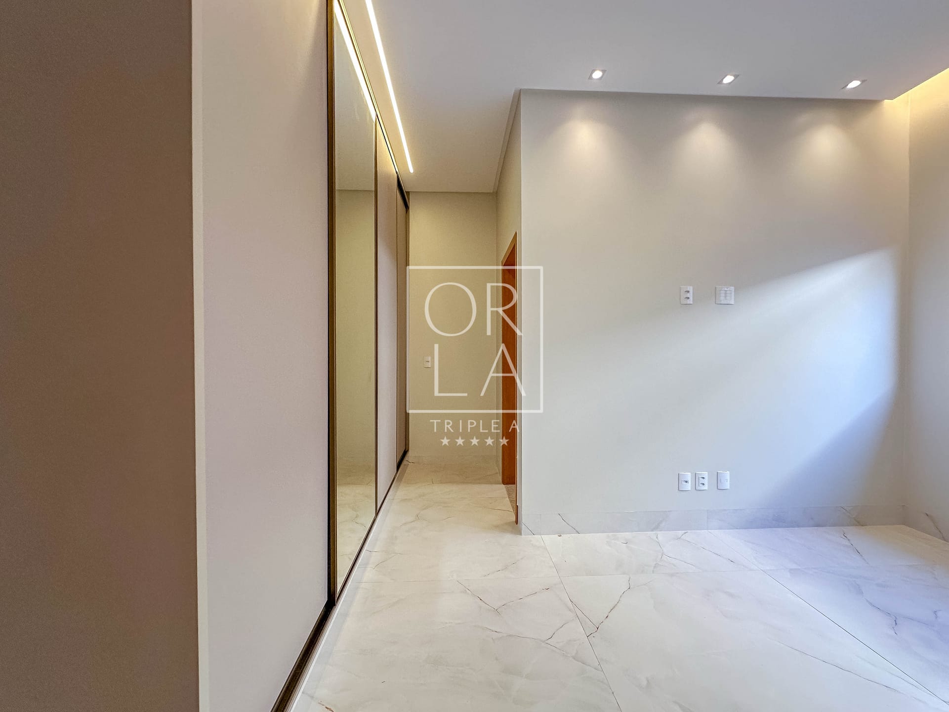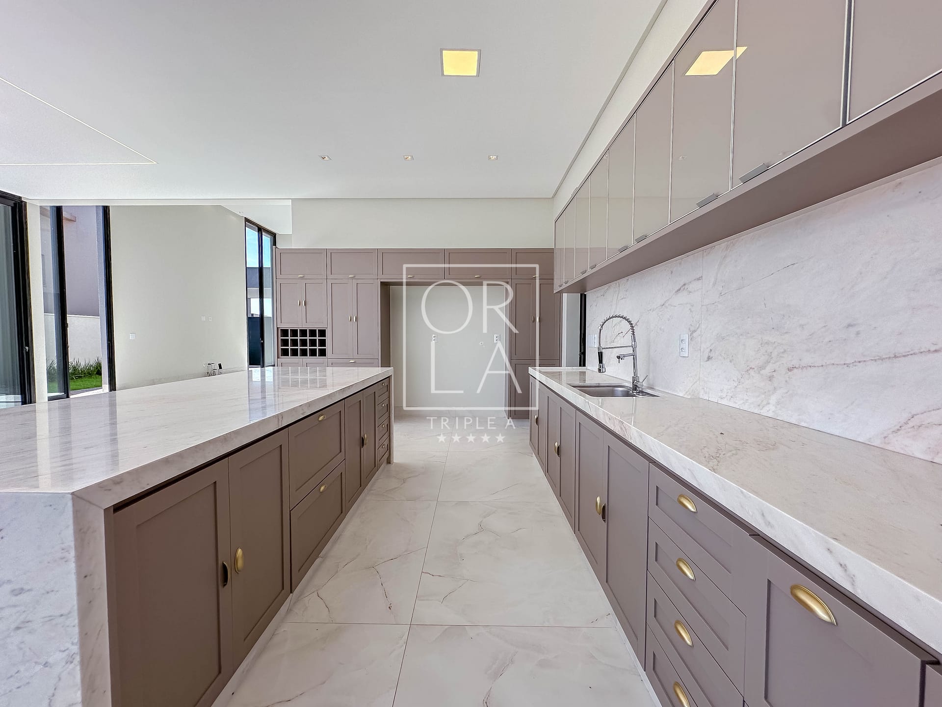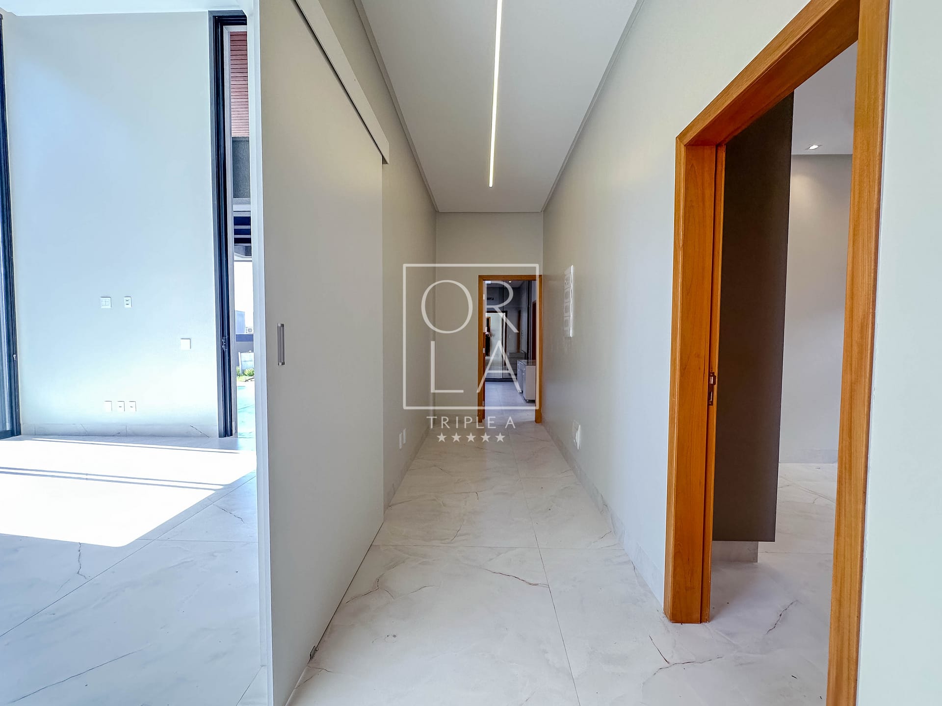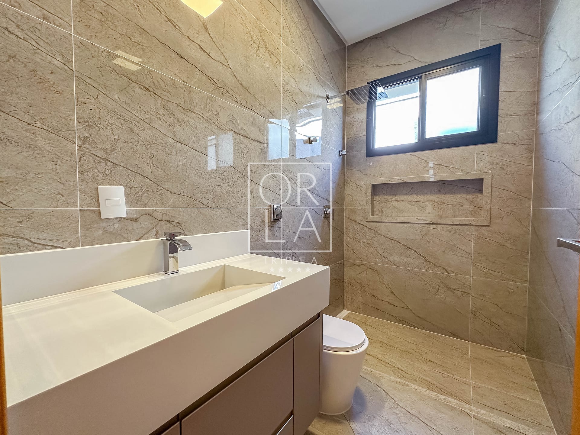 • Esquadrias automatizadas, porcelanato 1,20×1,20, pé direito duplo;