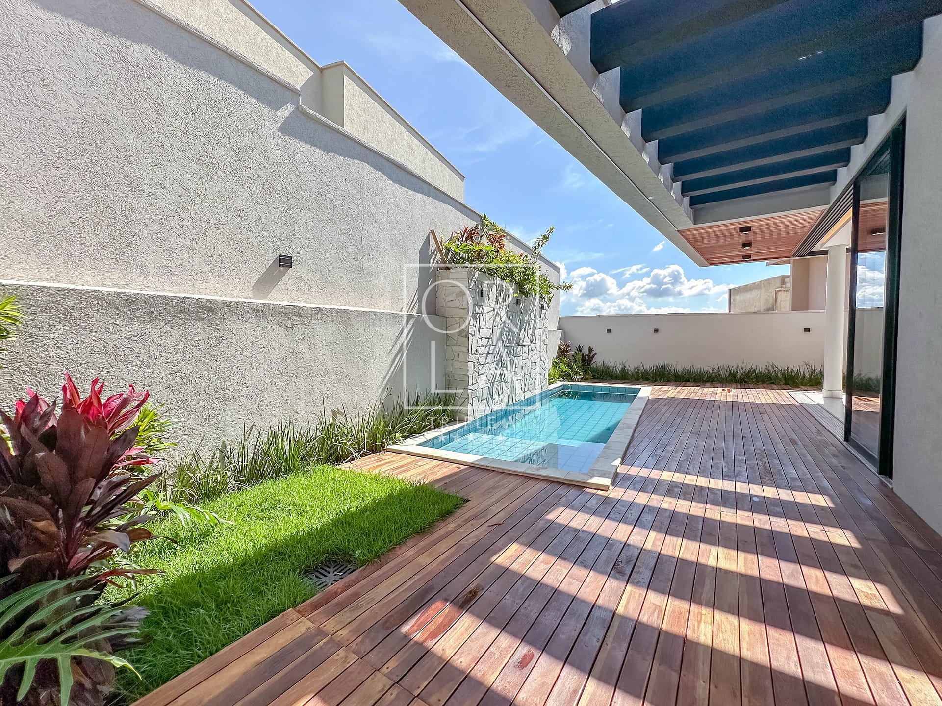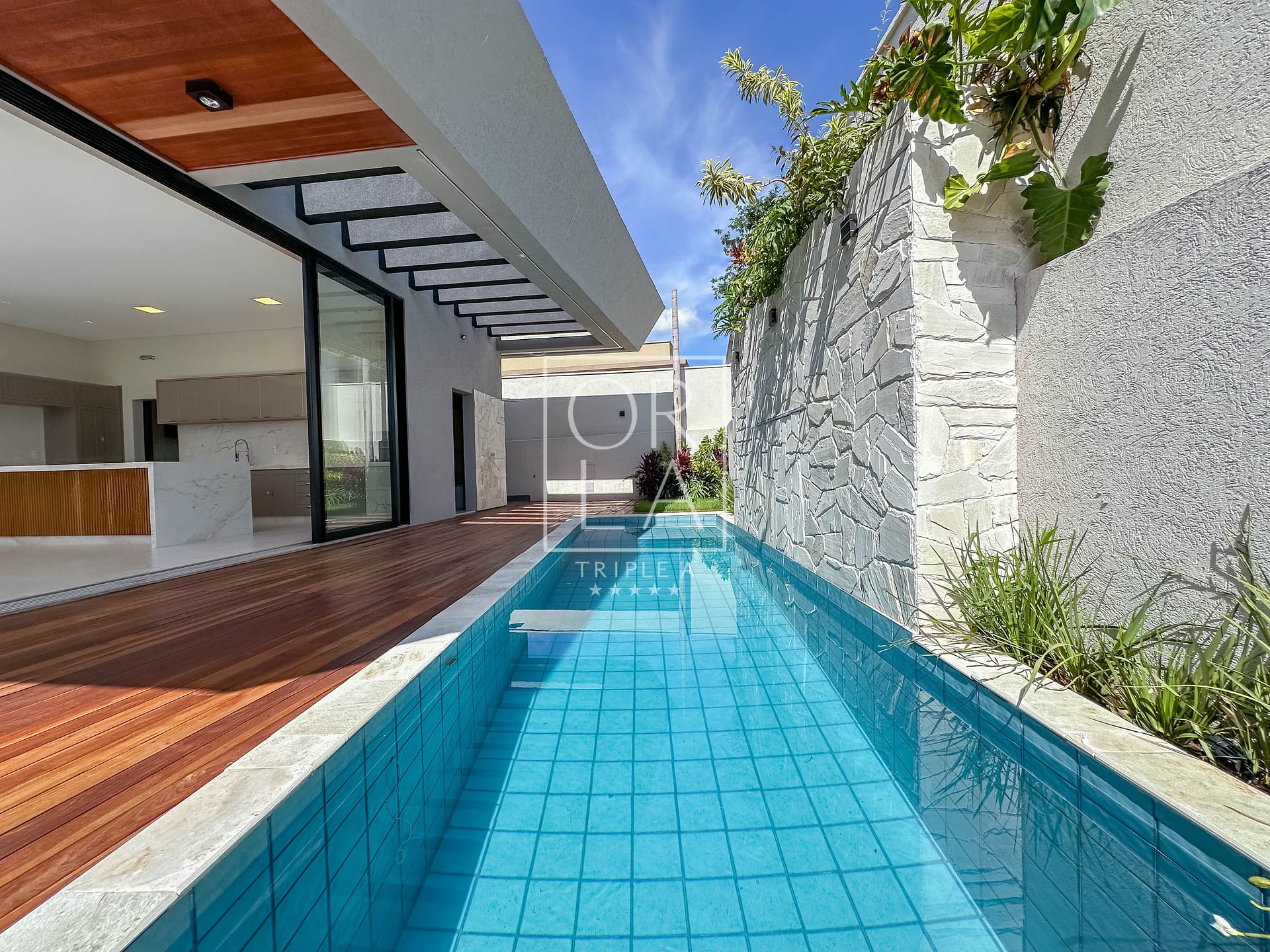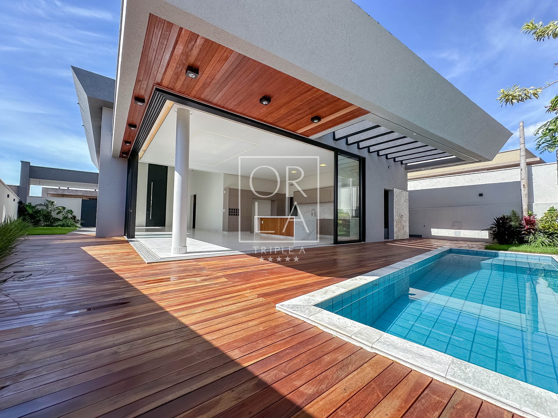 • Churrasqueira, deck em ipê, paisagismo adulto com iluminação pronta;