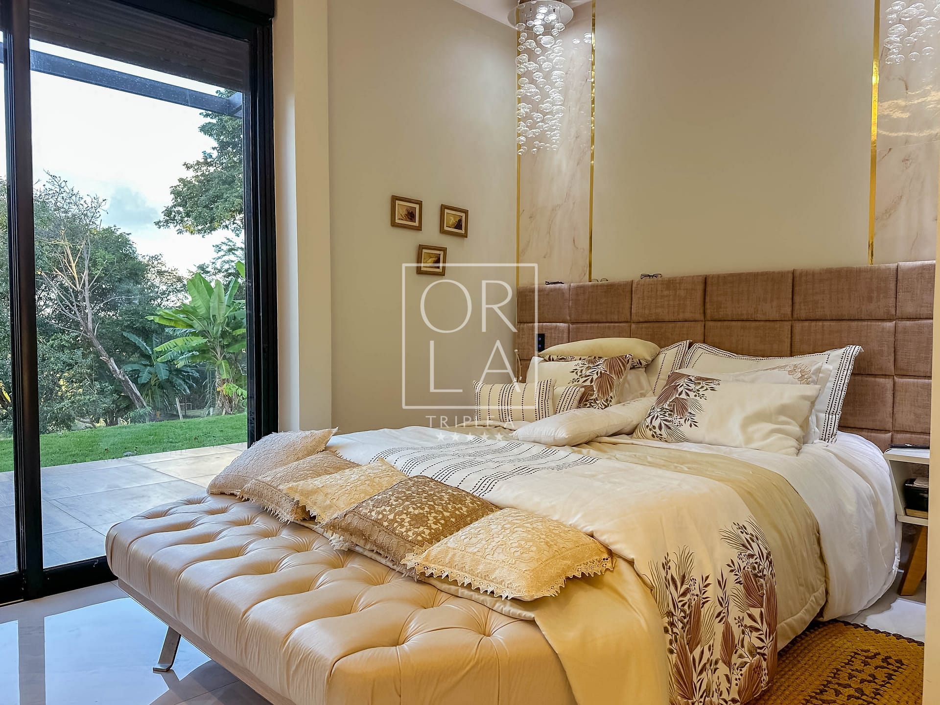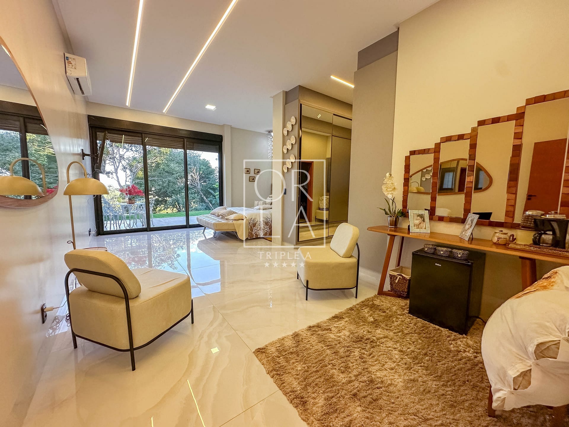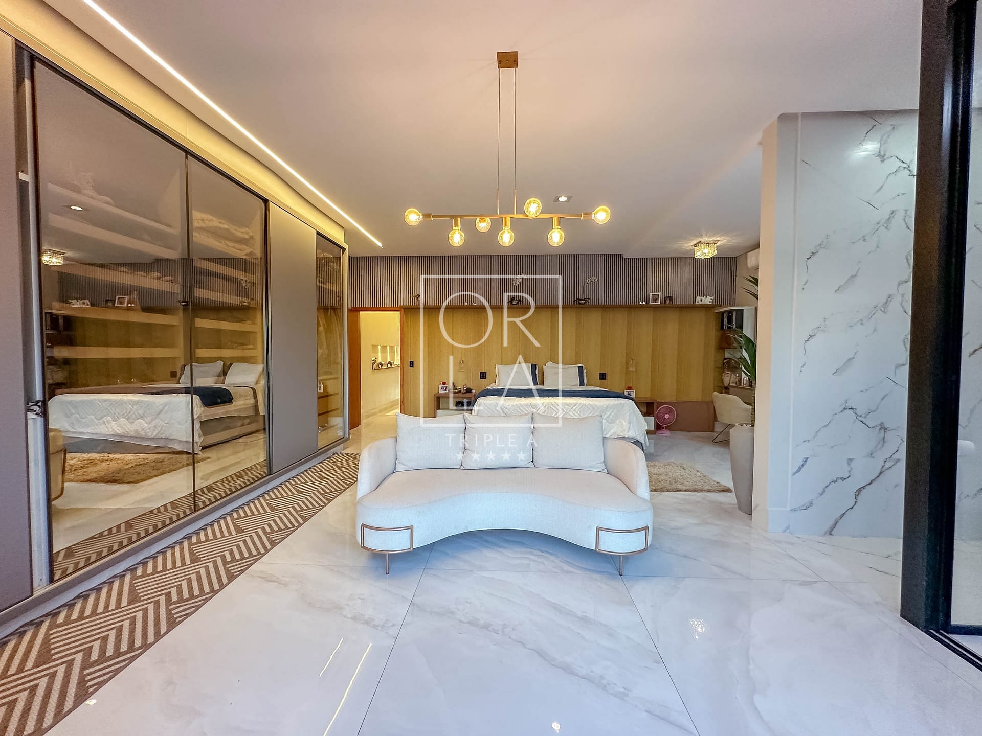 6 suítes espaçosas, sendo 2 máster, ambas com diferenciais exclusivos: uma com sauna e banheira de hidromassagem, e outra com cortinas automatizadas;