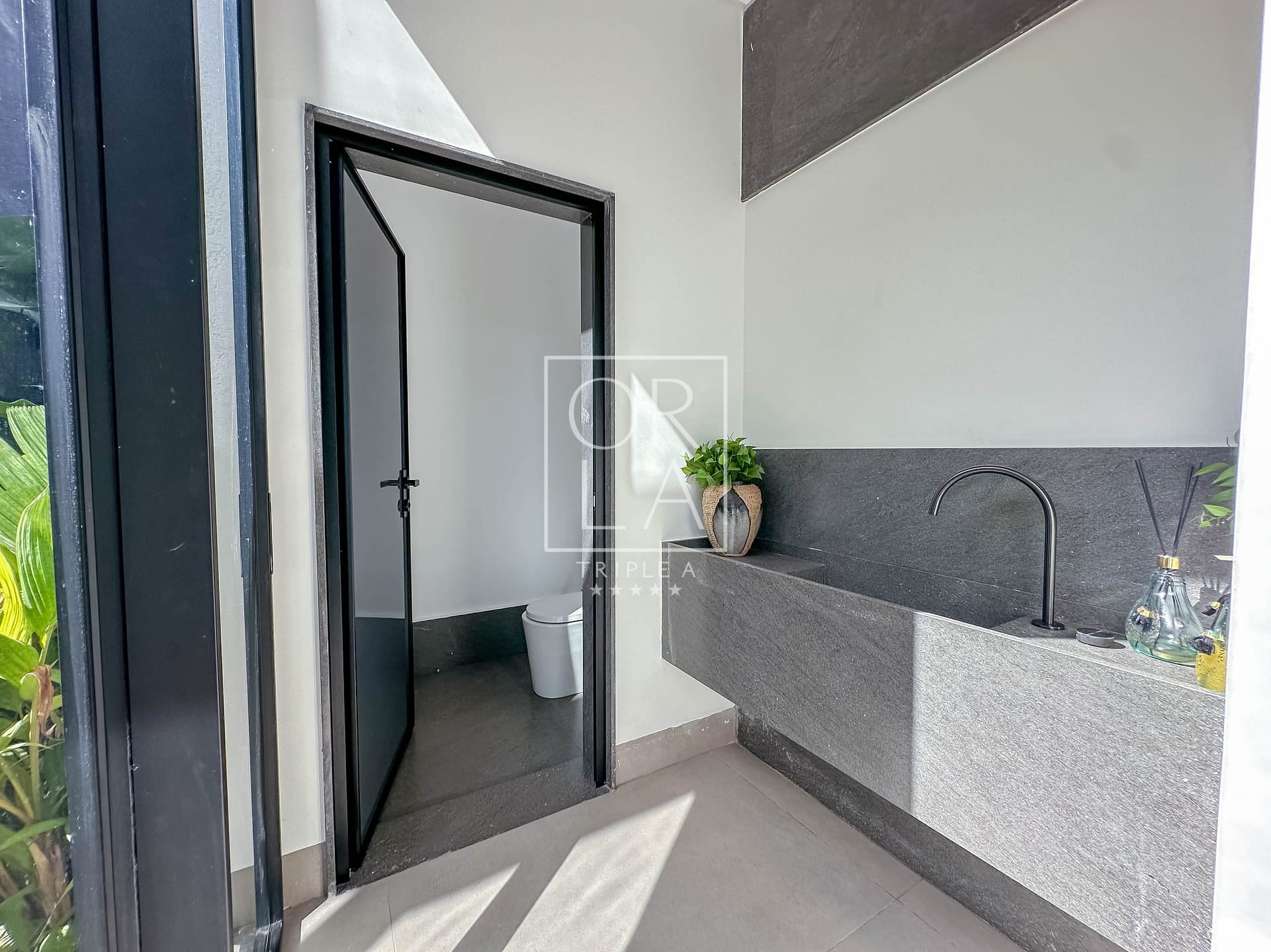 Lavabo em pedras Travertino Navona Black — o mesmo acabamento das escadas internas;