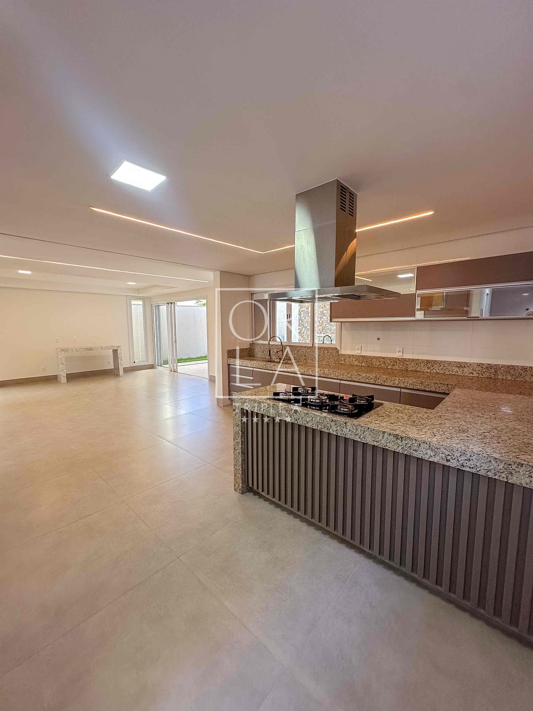 ▪️ Cozinha gourmet com armários planejados, ilha central com cooktop e coifa