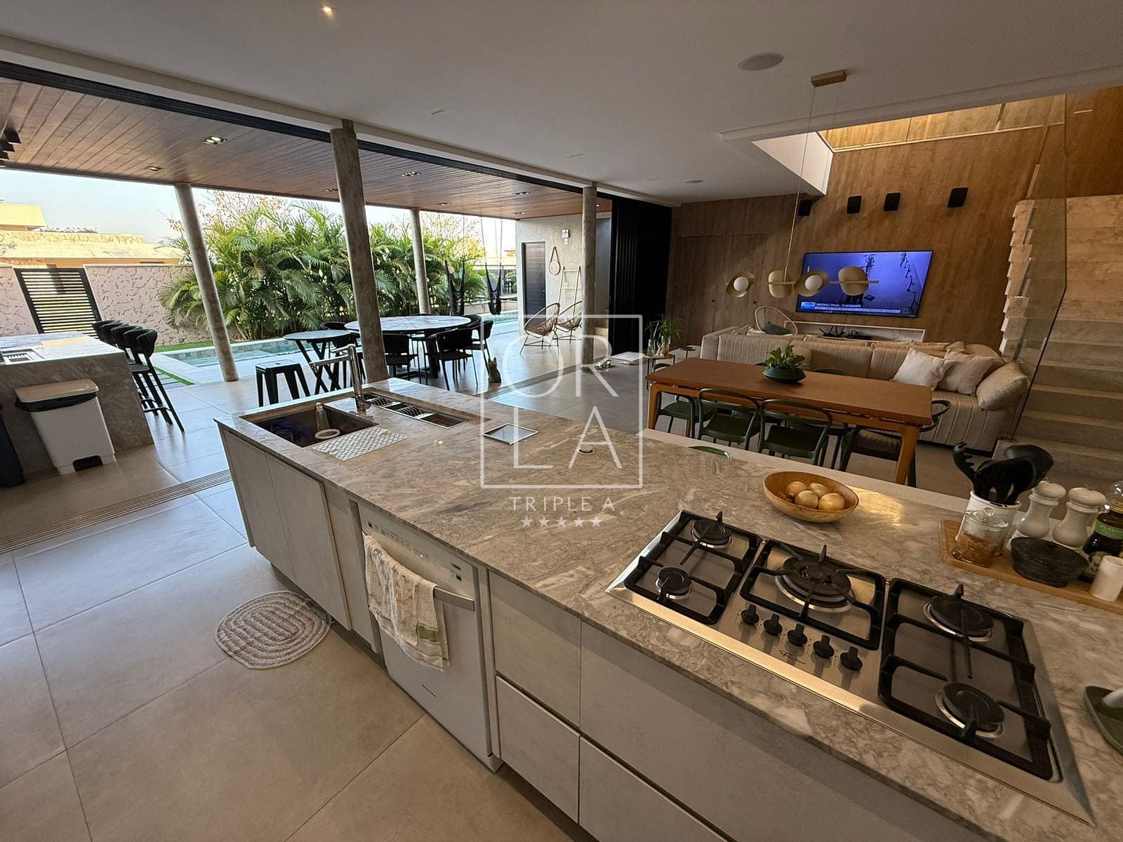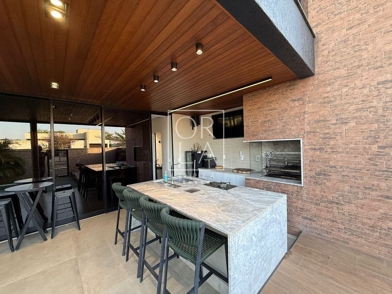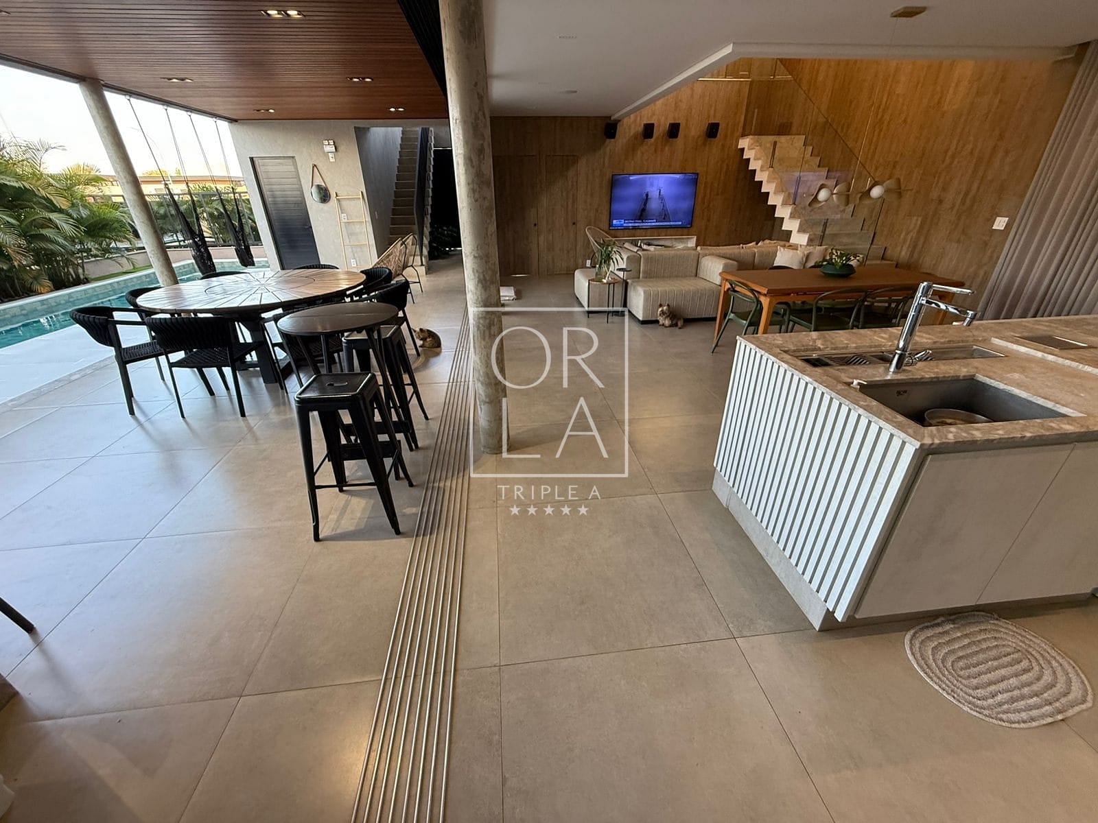 Casa térrea de 3 suítes plenas, rica em bancadas, cozinha com total integração a sala, área de serviços, lavabo e varanda gourmet com churrasqueira integrada a piscina com deck de madeira. A ca...