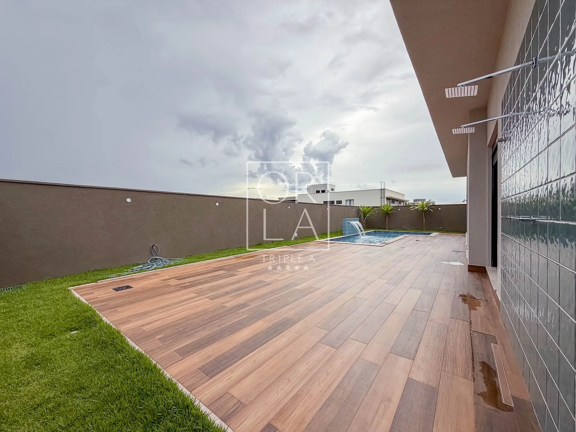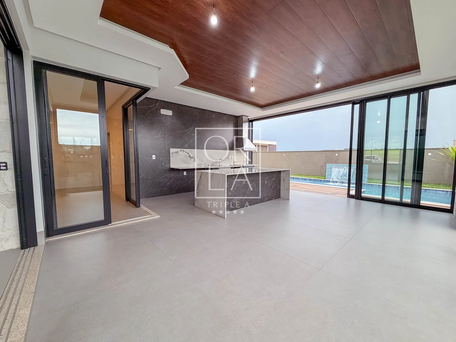 varanda gourmet com churrasqueira a carvão, ilha central, forro amadeirado e total integração com a área externa. O espaço se conecta ao deck amadeirado e à piscina aquecida, com prainha, cascata e hidromassagem — criando um ambiente acolhedor e elegante para momentos especiais.