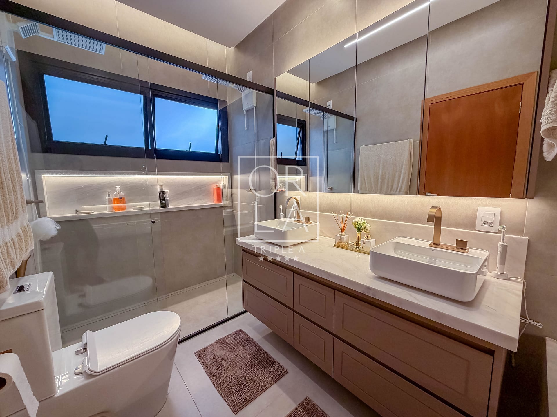 Casa térrea de 3 suítes plenas, rica em bancadas, cozinha com total integração a sala, área de serviços, lavabo e varanda gourmet com churrasqueira integrada a piscina com deck de madeira. A ca...
