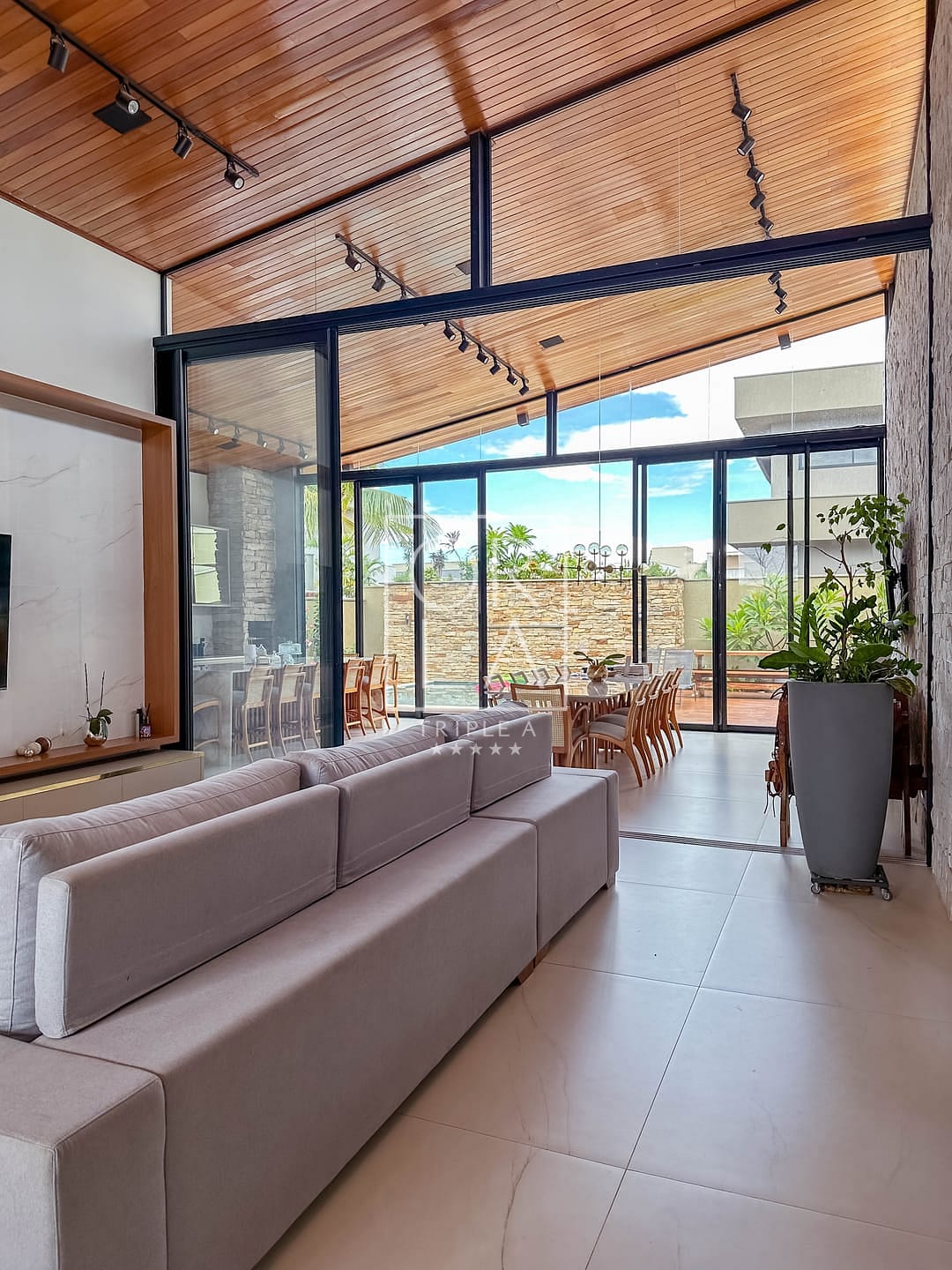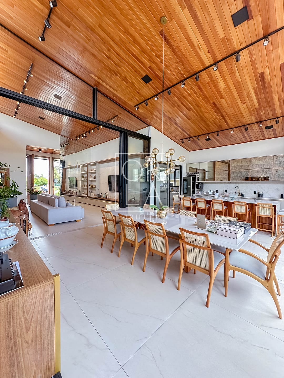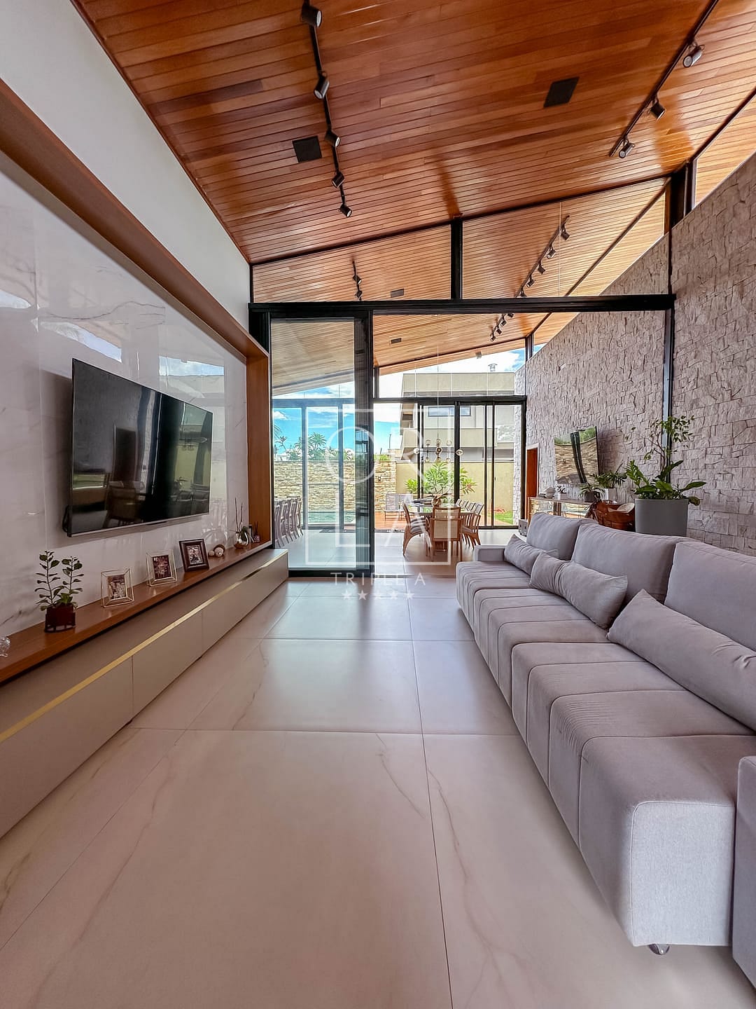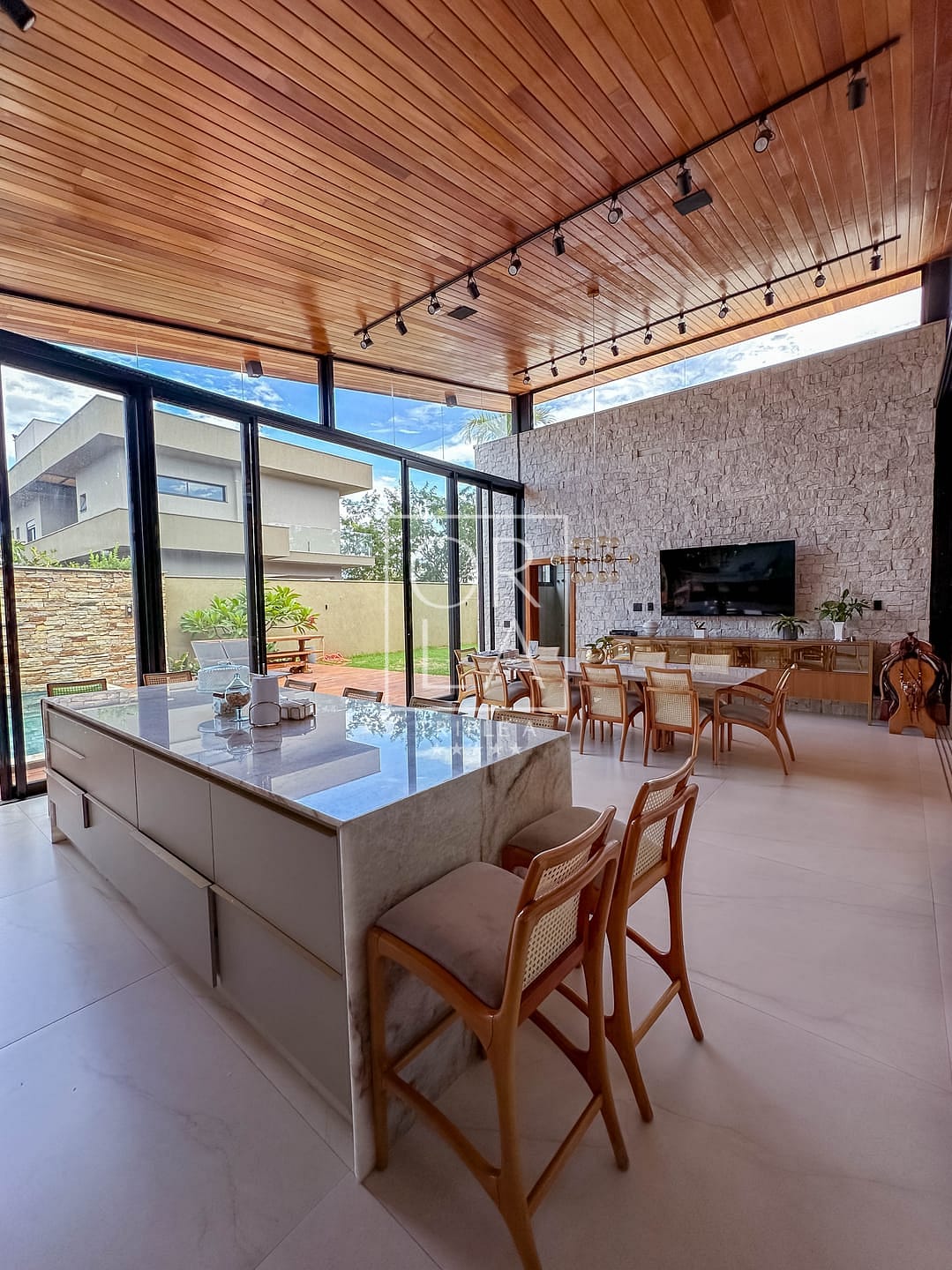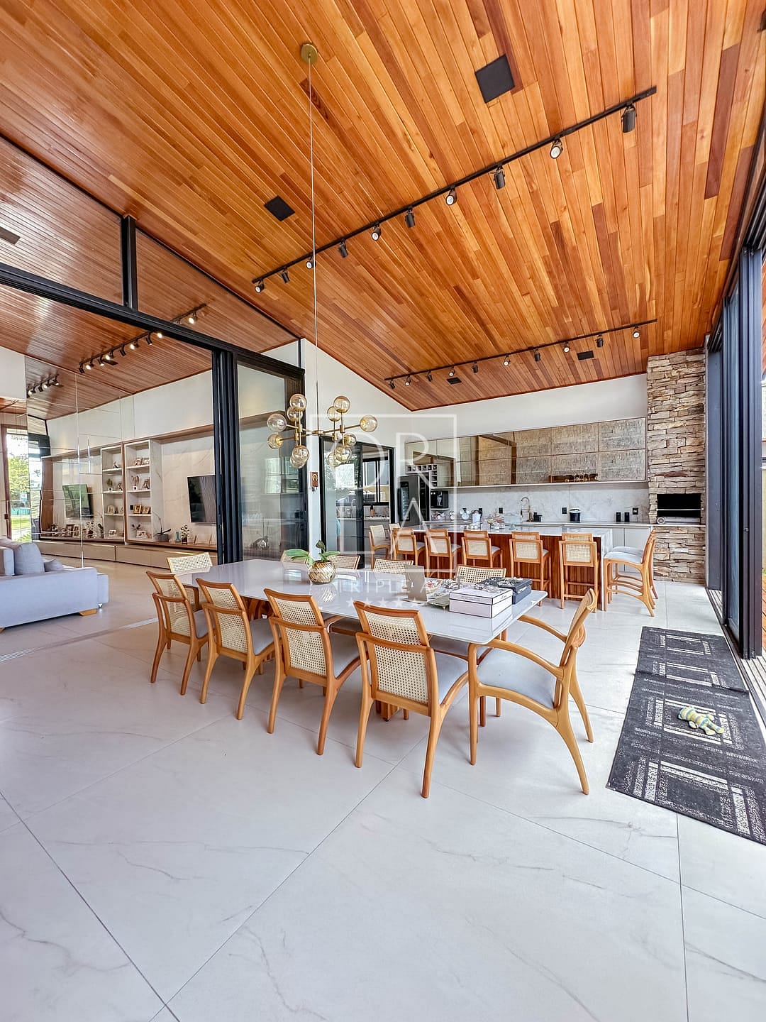 📺 sala e área gourmet com pé direito duplo