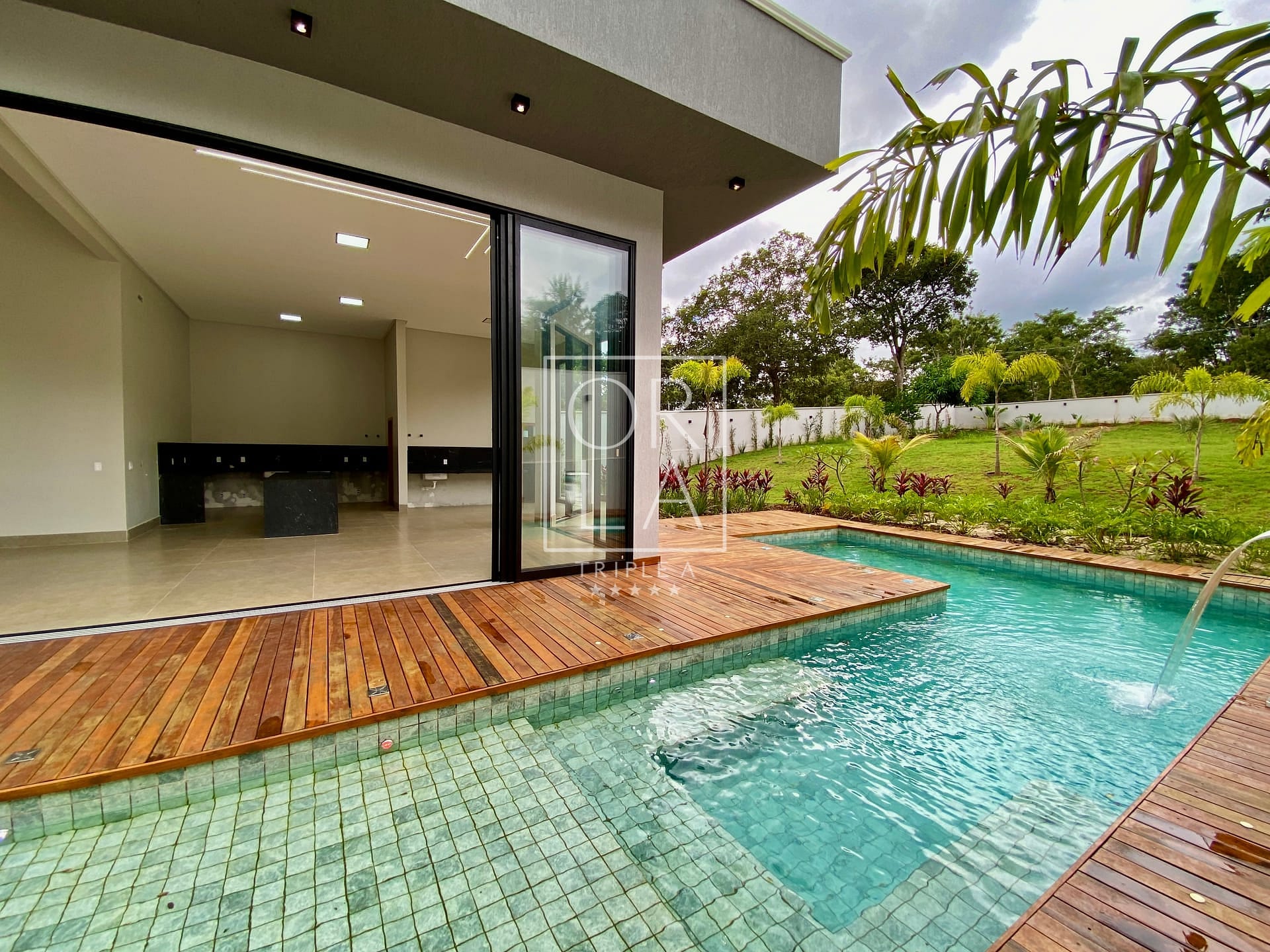 Piscina aquecida com iluminação, cascata e hidromassagem – tudo com automação para o seu conforto