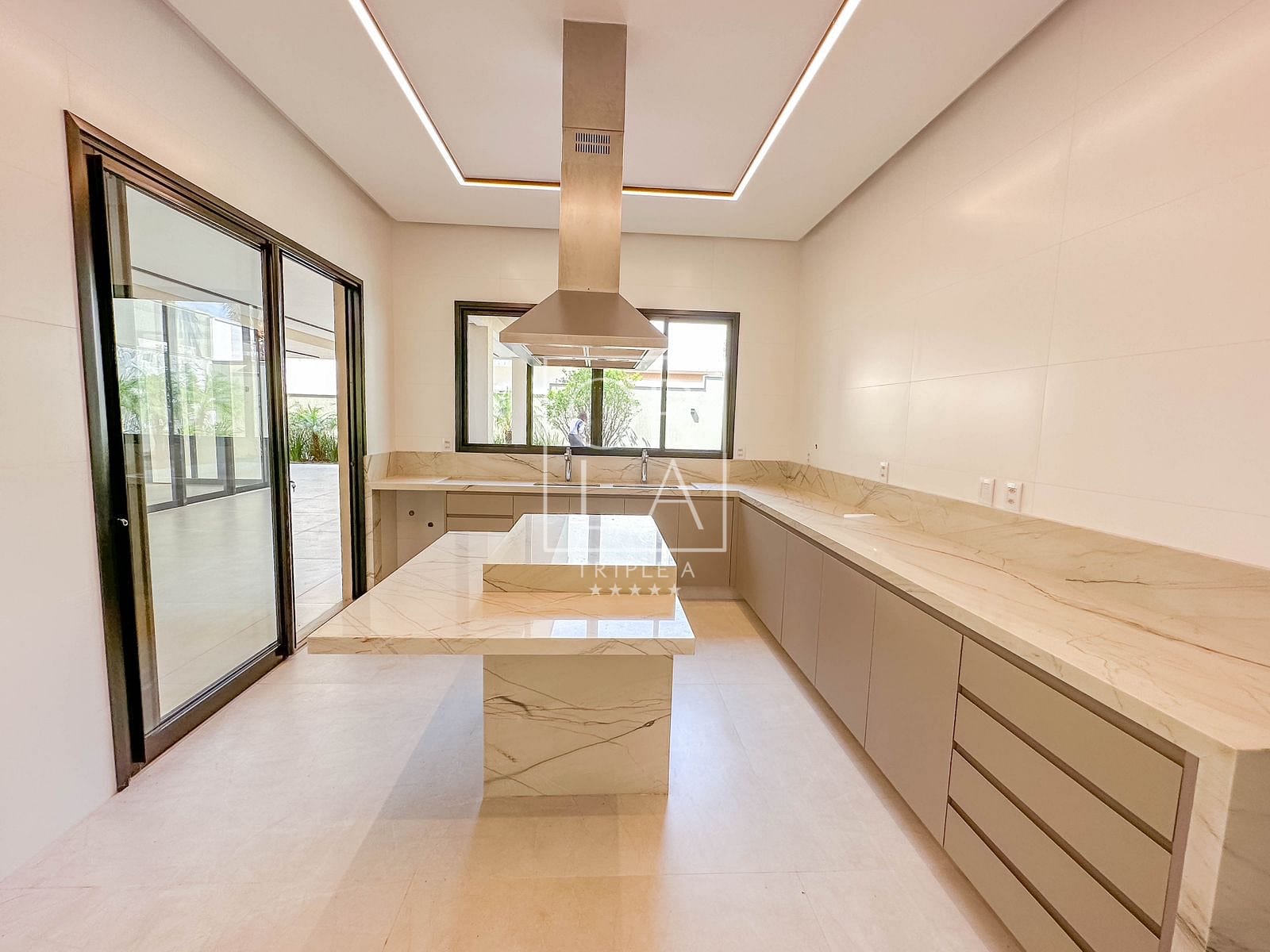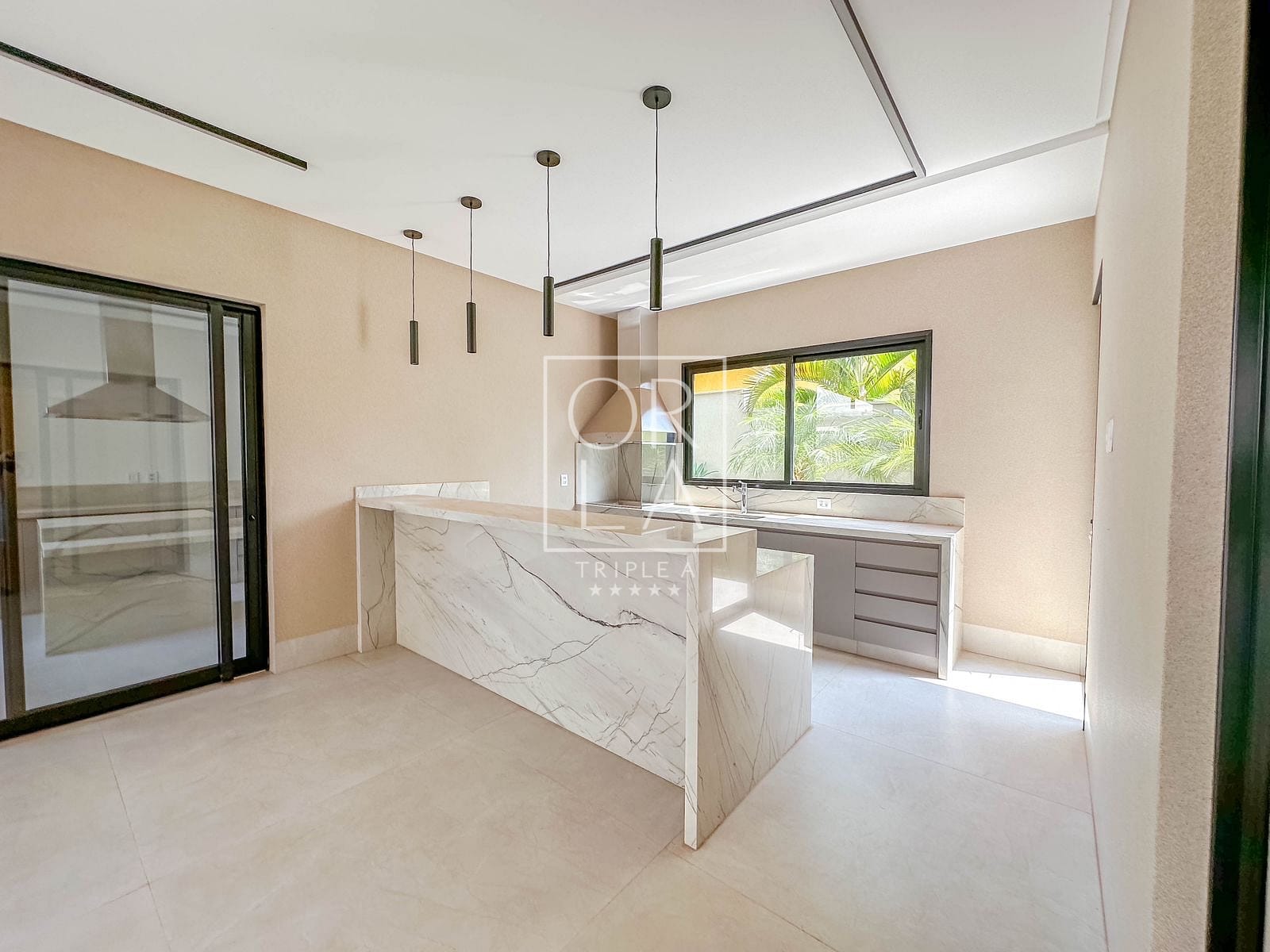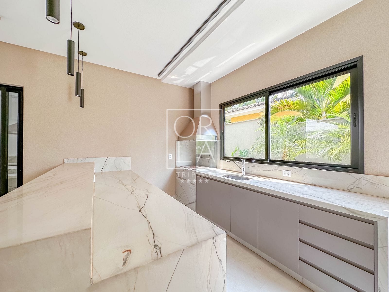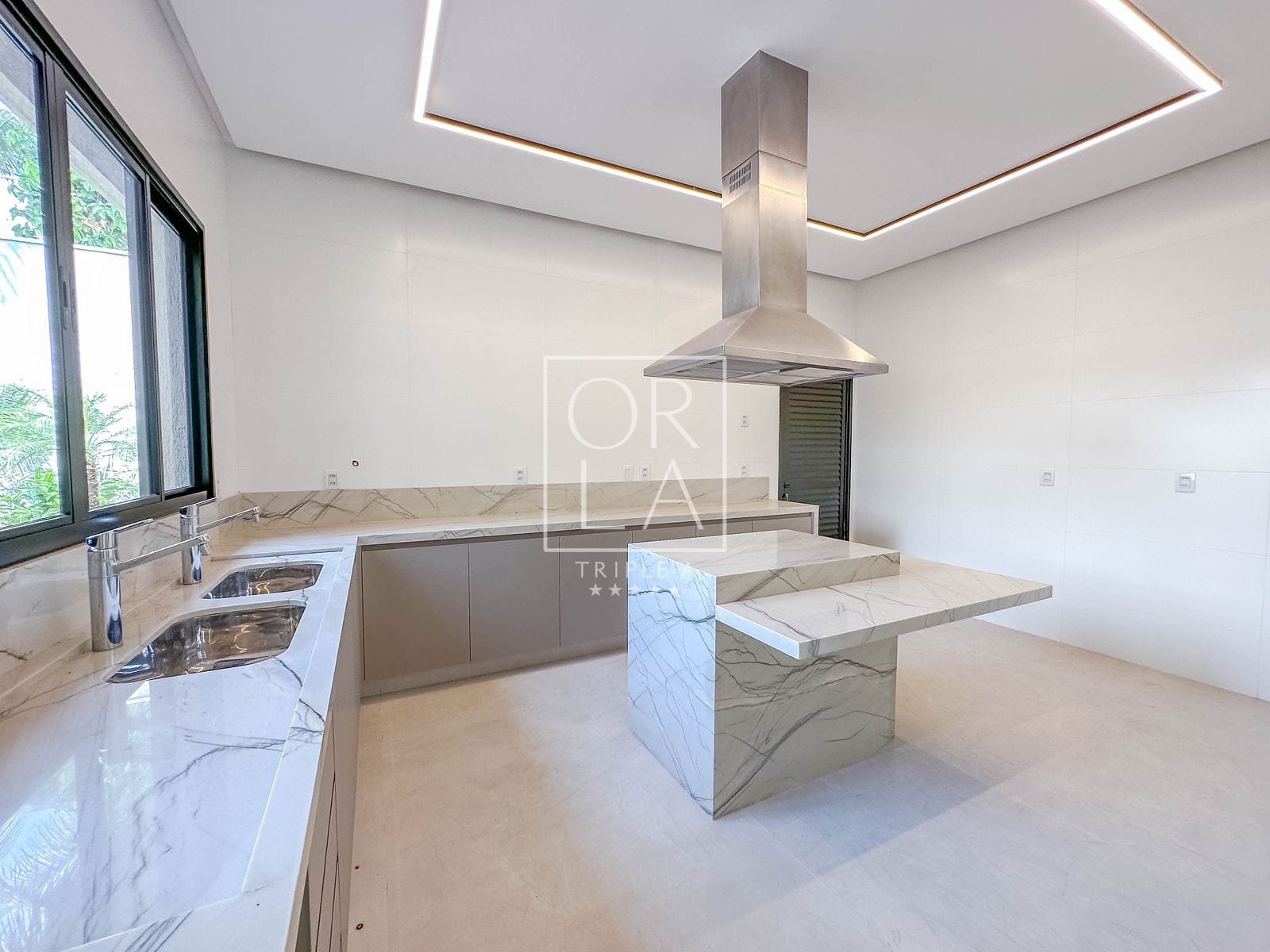 • Cozinha com ilha e bancadas em mármore, além de despensa;